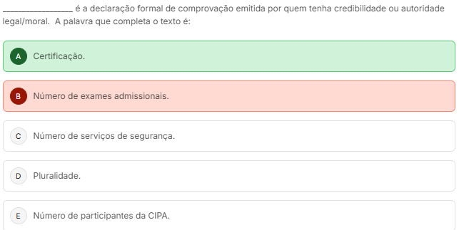 é a declaração formal de comprovação emitida por quem tenha credibilidade ou autoridade legal/moral. A palavra que completa texto é: A Certificação. Número de exames admissionais. C Numero de serviços de segurança. D Pluralidade. E Numero de participantes da CIPA.