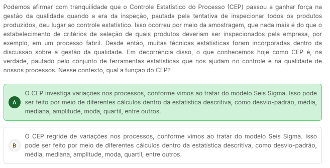 Podemos afirmar com tranquilidade que 0 Controle Estatistico do Processo (CEP) passou a ganhar força na gestão da qualidade quando a era da inspeção, pautada pela tentativa de inspecionar todos produtos produzidos, deu lugar ao controle estatistico. Isso ocorreu por meio da amostragem, que nada mais é do que estabelecimento de de seleção de quais produtos deveriam ser inspecionados pela empresa, por exemplo, em um processo fabril. Desde então, muitas técnicas estatisticas foram incorporadas dentro da discussão sobre a gestão da qualidade. Em decorrência disso, 0 que conhecemos hoje como CEP na verdade, pautado pelo conjunto de ferramentas estatisticas que nos ajudam no controle e na qualidade de nossos processos. Nesse contexto, qual a função do CEP? O CEP investiga variações nos processos, conforme vimos ao tratar do modelo Seis Sigma. Isso pode A ser feito por meio de diferentes cálculos dentro da estatistica descritiva, como desvio-padrão, média, mediana, amplitude, moda, quartil, entre outros. O CEP regride de variações nos processos, conforme vimos ao tratar do modelo Seis Sigma. Isso B pode ser feito por meio de diferentes cálculos dentro da estatistica descritiva, como desvio-padrão, média, mediana, amplitude, moda, quartil, entre outros.