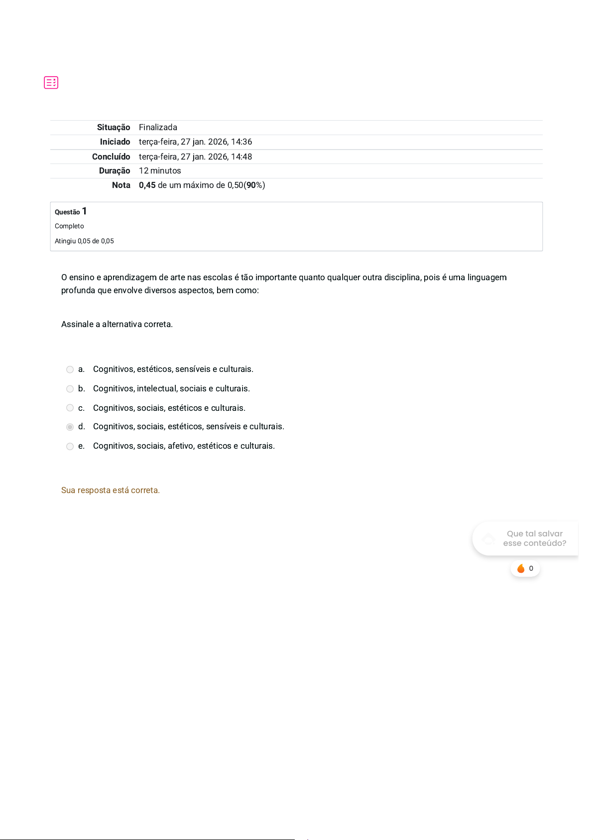 Situação Finalizada Iniciado terça-feira, 27 jan. 2026, 14:36 Concluído terça-feira, 27 jan. 2026, 14:48 Duração 12 minutos Nota 0,45 de um máximo de 0,50(90%) Questão 1 Completo Atingiu 0,05 de 0,05 O ensino e aprendizagem de arte nas escolas é tão importante quanto qualquer outra disciplina, pois é uma linguagem profunda que envolve diversos aspectos, bem como: Assinale a alternativa correta. a. Cognitivos, estéticos, sensíveis e culturais. b. Cognitivos, intelectual, sociais e culturais. c. Cognitivos, sociais, estéticos e culturais. d. Cognitivos, sociais, estéticos, sensíveis e culturais. e. Cognitivos, sociais, afetivo, estéticos e culturais. Sua resposta está correta. Que tal salvar esse conteúdo? 0 Questão 2 Completo Atingiu 0,05 de 0,05 Questão 3 Completo Atingiu 0,00 de 0,05 A arte mostra-se presente na história da humanidade desde os tempos mais remotos. Sem dúvida, ela pode ser considerada como sendo uma necessidade de expressão do ser humano, através das percepções e interpretações, pois o que lhe é externo passa a ser mapeado no sistema mental, tornando assim esse processo um produto da relação entre o(a): Assinale a alternativa correta. a. Arte e o mundo. b. Pintura e o mundo. c. Homem e o mundo. d. Homem e o conhecimento. e. Arte e o homem. Sua resposta está correta. A característica principal é o do professor deixar o aluno livre durante sua criação, além de utilizar de exercícios de sensibilização para auxiliar o desenvolvimento e desbloqueio da criatividade. Diante disso, qual seria a Tendência Pedagógica do Ensino da Arte? Assinale a alternativa correta. a. Pedagogia Libertadora. b. Pedagogia Nova. c. Pedagogia Renovada. d. Pedagogia Tecnicista. e. Pedagogia Tradicional. Sua resposta está incorreta. Que tal salvar esse conteúdo? Questão 4 Completo Atingiu 0,05 de 0,05 Questão 5 Completo Atingiu 0,05 de 0,05 Os primeiros indícios da linguagem da arte são encontrados na Pré-história, em paredes rochosas das cavernas, onde os primeiros homens viviam. Desenhos nos quais, retratavam os costumes e práticas humanas daquela época. Assinale a alternativa que apresenta corretamente o nome dessas pinturas. a. Pinturas rupestres. b. Pinturas pré-históricas. c. Pinturas gregas. d. Pinturas das cavernas. e. Pinturas antigas. Sua resposta está correta. No Brasil, em relação ao ensino de Arte, temos duas tendências pedagógicas que se destacaram aos longo dos anos. Uma que propõe que a educação seja para todos e de forma democrática e a outra que aponta que a escola deveria ser a responsável pela conscientização da sociedade. Dessa forma, qual o nome dessas duas tendências? Assinale a alternativa correta. a. Idealista-crítica e Realista-passiva. b. Idealista-liberal e Realista-tradicional. c. Idealista-crítica e Realista-progressista. d. Idealista-liberal e Realista-progressista. e. Idealista-passiva e Realista-tecnicista. Sua resposta está correta. Que tal salvar esse conteúdo? Questão 6 Completo Atingiu 0,05 de 0,05 Questão 7 Completo Atingiu 0,05 de 0,05 A Lei nº 13.278/2016 decreta que os componentes curriculares da disciplina de arte será constituída pelas linguagens de artes visuais, dança, música e teatro, também estabelece um prazo para que os sistemas de ensino promovam a formação dos professores para a implantação desses determinados componentes na educação básica. Sendo assim, qual prazo seria esse? Assinale a alternativa correta. a. Seis anos. b. Quatro anos. c. Três anos. d. Cinco anos e. Dois anos. Sua resposta está correta. Sobre a arte na Pré-história, o que os autores Martins, Picosque e Guerra (1998), nos apresenta? Assinale a alternativa correta. a. Antes mesmo de saber escrever, o homem expressou e interpretou o mundo em que vivia pela linguagem da arte. b. A arte pré-histórica, nada mais é que rabiscos feitos pelos homens a fim de registrar sua rotina. c. A arte pré-histórica não está necessariamente ligada à ideia de "arte" e sim de comunicação que surgiu a partir do renascimento. d. Antes mesmo de saber escrever, o homem utilizou-se da arte para registrar sua presença no mundo. e. A arte pré-histórica é o que podemos assemelhar com produção dita artística do homem ocidental dos dias de hoje. Sua resposta está correta. Que tal salvar esse conteúdo? Questão 8 Completo Atingiu 0,05 de 0,05 Questão 9 Completo Atingiu 0,05 de 0,05 A Pedagogia Tecnicista surgiu na segunda metade do século XX nos Estados Unidos, porém, no Brasil, só foi introduzida entre 1960 e 1970. Abaixo encontra-se uma de suas características. Assinale a alternativa correta. a. O professor é o responsável em preparar o aluno para sua convivência social, deixando-o livre em suas escolhas. b. O professor tinha como objetivo estimular o aluno unicamente através do desenho e da pintura. c. O professor focava o ensino na imitação de obras já existentes, excluindo criações próprias dos alunos. d. O professor não interfere na criação do aluno, deixando-o livre para que compreenda por si só sua competência. e. O professor é o responsável em preparar o aluno para o mercado de trabalho, tornando-o competente e produtivo. Sua resposta está correta. Conforme podemos averiguar em nossa primeira unidade, ao lecionar a disciplina de arte, o professor deve apresentar aos alunos as linguagens artísticas, no qual o autor Porto (2014) destaca quatro áreas, ressaltando ainda que apesar de não precisar ser trabalhadas simultaneamente na disciplina, precisam ser abordadas ao longo da escolaridade. Quais são as áreas apontadas pelo autor. Assinale a alternativa correta. a. Dança, Música, Teatro e Pintura. b. Música, Dança, Artes Visuais e Teatro. c. Dança, Teatro, Circo e Pintura. d. Música, Dança, Artes Visuais e Folclore. e. Música, Dança, Artes Visuais e Pintura. Sua resposta está correta. Que tal salvar esse conteúdo? Questão 10 Completo Atingiu 0,05 de 0,05 De acordo