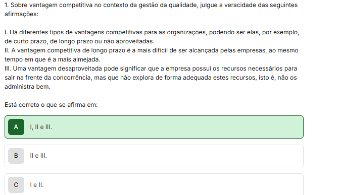 1. Sobre vantagem competitiva no contexto da gestão da qualidade, julgue a veracidade das seguintes afirmações: Há diferentes tipos de vantagens competitivas para as organizações, podendo ser elas, por exemplo, de curto prazo, de longo prazo ou não aproveitadas. II. A vantagem competitiva de longo prazo é a mais de ser alcançada pelas empresas, ao mesmo tempo em que é a mais almejada. III. Uma vantagem desaproveitada pode significar que a empresa possui os recursos necessários para sair na frente da concorrência, mas que não explora de forma adequada estes recursos, isto é, não administra bem. Esta correto O que se afirma em: A II e III. B II e III. C