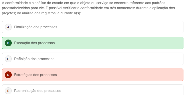 A conformidade é a do estado em que 0 objeto ou serviço se encontra referente aos preestabelecidos para ele. É verificar a conformidade em três momentos: durante a aplicação dos projetos; da analise dos registros; e durante a(s): A Finalização dos processos B Execução dos processos C Definição dos processos D Estratégias dos processos E Padronização dos processos