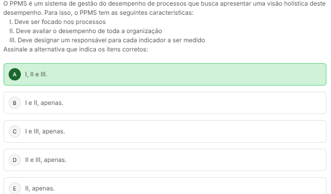 O PPMS é um sistema de gestão do desempenho de processos que busca apresentar uma holistica deste desempenho. Para isso, 0 PPMS tem as seguintes caracteristicas: I. Deve ser focado nos processos II. Deve avaliar desempenho de toda a organização III. Deve designar um responsável para cada indicador a ser medido Assinale a alternativa que indica itens corretos: A II e III. B I e II, apenas. C III, apenas. D II e III, apenas. E II, apenas.