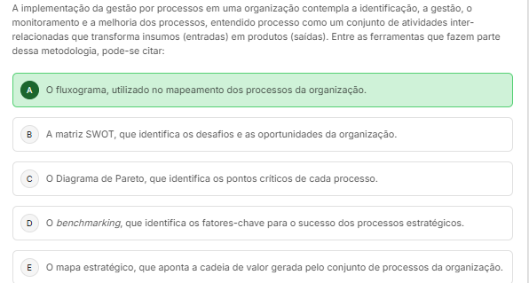 A implementação da gestão por processos em uma organização contempla a identificação, a gestão, 0 monitoramento e a melhoria dos processos, entendido processo como um conjunto de atividades inter- relacionadas que transforma insumos (entradas) em produtos Entre as ferramentas que fazem parte dessa metodologia, pode-se citar: A O fluxograma, utilizado no mapeamento dos processos da organização. B A matriz SWOT, que identifica os desafios e as oportunidades da organização. C Diagrama de Pareto, que identifica pontos criticos de cada processo. D benchmarking, que identifica os fatores-chave para sucesso dos processos estratégicos. E mapa estratégico, que aponta a cadeia de valor gerada pelo conjunto de processos da organização.