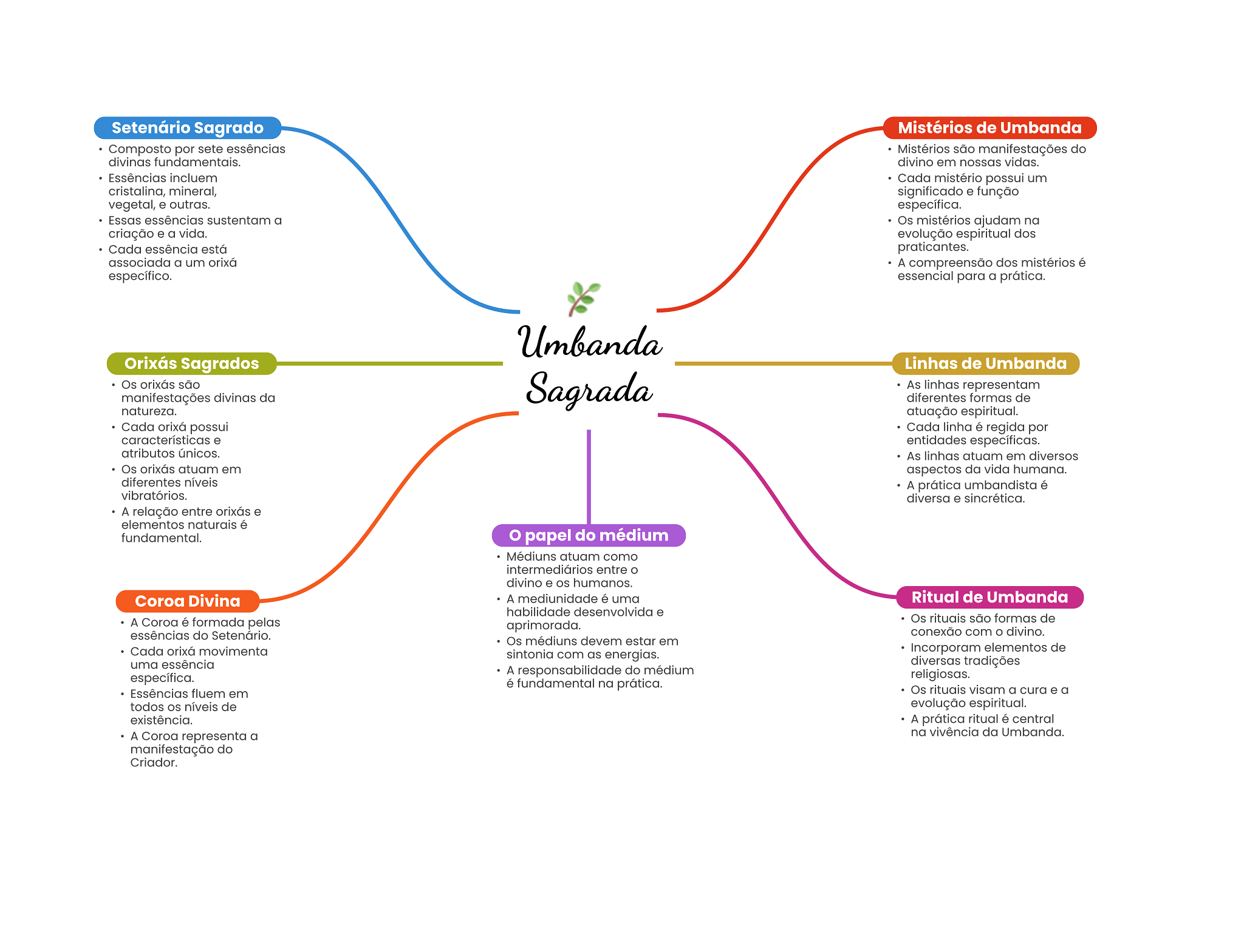 Setenário Sagrado Mistérios de Umbanda Composto por sete essências Mistérios são manifestações do divinas fundamentais. divino em nossas vidas. Essências incluem Cada mistério possui um cristalina, mineral, significado e função vegetal, e outras. específica. Essas essências sustentam a Os mistérios ajudam na criação e a vida. evolução espiritual dos Cada essência está praticantes. associada a um orixá A compreensão dos mistérios é específico. essencial para a prática. Umbanda Orixás Sagrados Linhas de Umbanda Os orixás são manifestações divinas da Sagrada As linhas representam diferentes formas de natureza. atuação espiritual. Cada orixá possui Cada linha é regida por características e entidades específicas. atributos únicos. As linhas atuam em diversos Os orixás atuam em aspectos da vida humana. diferentes níveis A prática umbandista é vibratórios. diversa e sincrética. A relação entre orixás e elementos naturais é fundamental. papel do médium Médiuns atuam como intermediários entre divino e OS humanos. Coroa Divina A mediunidade é uma Ritual de Umbanda habilidade desenvolvida e A Coroa é formada pelas Os rituais são formas de aprimorada. essências do Setenário. conexão com O divino. Os médiuns devem estar em Cada orixá movimenta sintonia com as energias. Incorporam elementos de uma essência diversas tradições A responsabilidade do médium específica. religiosas. é fundamental na prática. Essências fluem em Os rituais visam a cura e a todos níveis de evolução espiritual. existência. A prática ritual é central A Coroa representa a na vivência da Umbanda. manifestação do Criador.