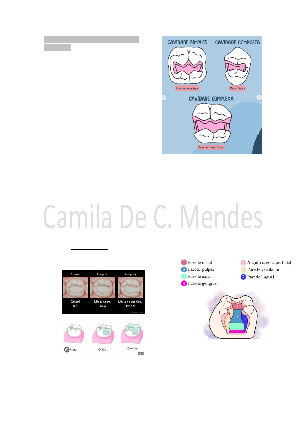 Fundamentos de Reabilitação Bucal I | Camila De C. Mendes NOMENCLATURA E CLASSIFICAÇÕES DAS CAVIDADES Cavidade: termo empregado para definir o espaço escavado no dente após o tecido cariado DENOMINAÇÃO DAS CAVIDADES 1- De acordo com o numero de faces em que ocorre · Simples · Composta · Complexa 2- De acordo com as faces do dente envolvida · Recebe os nomes das respectivas faces 3- De acordo com a forma e extensão da cavidade · Intracoronária – Inlay: Estão confinadas no interior da estrutura dentária) · Extracoronária Parciais – Onlay: Cobertura de cúspide e/ou faces do dente · Extracoronárias Totais – Overlay: Só a face externa do dente é desgastada PARTES CONSTITUINTES DA CAVIDADE Paredes: São os limites internos das cavidades - Circundantes: Circundam o dente, voltadas para a superfície externa - De fundo: Não está em contato com a face externa do dente. · Axial: Paralela ao eixo longitudinal do dente · Pulpar: Perpendicular ao eixo do dente Ângulos: União das paredes da cavidade · Diedros – 2 paredes unidas · Triedros – 3 paredes unidas · Cavo-superficial – Maior ângulo da cavidade. Paredes circundantes + superfície externa do dente 1º grupo: Junção das paredes circundantes 2º grupo: Junção com as paredes circundantes + de fundo 3º grupo: Junção da parede axial + Pulpar CLASSIFICAÇÃO DAS CAVIDADES · Quanto a finalidade Terapêutica – Cavidade com formas geométricas e dimensões definidas, resultante de um processo cirúrgico que visa remover o tecido cariado: - Lesões cariosas - Abrasão, erosão, abfração - Fratura Protéticas – São as cavidades preparadas para servir como retentores ou apoio para prótese fixa e removível, podendo ser realizadas tanto em dentes afetados quanto em dentes hígidos. - Precisa passar pelo laboratório · Classificacão artificial de Black: Classe I – Preparadas em regiões de má coalescência de esmalte. Cicatrículas e fissuras. Vestibular ou oclusal. Classe II – Faces proximais de molares e pré-molares Classe III – Faces proximais de dentes anteriores sem o envolvimento do ângulo incisal Classe IV – Faces proximais de dentes anteriores com envolvimento do ângulo incisal Classe V – Terço cervical das faces vestibular e lingual de todos os dentes · Áreas de suscetibilidade á carie - Superfícies lisas Cicatrículas e fissuras: Áreas que retém mais sujeira. - Mais difícil de limpar que a superfície lisa. · Classificações complementares - Classe I de Sockwell - Classe VI de Howard e Simon Novas classificações Classificações modernas Tipo I – Oclusal de molares e pré-molares. Com envolvimento de cúspide/Sem envolvimento de cúspide · Tipo II – Proximal de molares e pré-molares Com envolvimento de crista marginal/Sem envolvimento de crista marginal · Tipo III – Proximal de dentes anteriores Sem envolvimento de ângulo incisal. · Tipo IV – Proximal de dentes anteriores Com envolvimento de ângulo incisal. · Tipo V – Vestibular ou lingual de todos os dentes. Incluindo os sulcos vestibular e lingual Mount e Hume Categoriza lesões cariosas por localização e tamanho, focando no tratamento minimamente invasivo. Divide as lesões em locais · I: oclusal · II: proximal · III: cervical 4 níveis de tamanho (1 a 4): Baseando-se no acúmulo de biofilme, não apenas na forma da cavidade. Classificação por Localização (Sítio): · Sítio 1 (Oclusal): Fóssulas, fissuras e sulcos em superfícies oclusais de posteriores ou lisas. · Sítio 2 (Proximal): Superfícies proximais (abaixo da área de contato). · Sítio 3 (Cervical): Terço gengival da coroa ou áreas radiculares expostas. Classificação por Tamanho da Lesão (Extensão): · Tamanho 1: Lesão mínima, mínima intervenção. · Tamanho 2: Lesão moderada, dentina envolvida. · Tamanho 3: Lesão grande, dentina extensa, cúspides enfraquecidas. · Tamanho 4: Lesão extensa, com perda de estrutura dentária. Exemplo:1.1 oclusal e moderada O 1º numero equivale a localização e o 2º número a complexidade da cavidade. pág. 1 image4.png image5.png image6.png image7.png image8.png image9.png image10.png image1.png image2.png image3.png