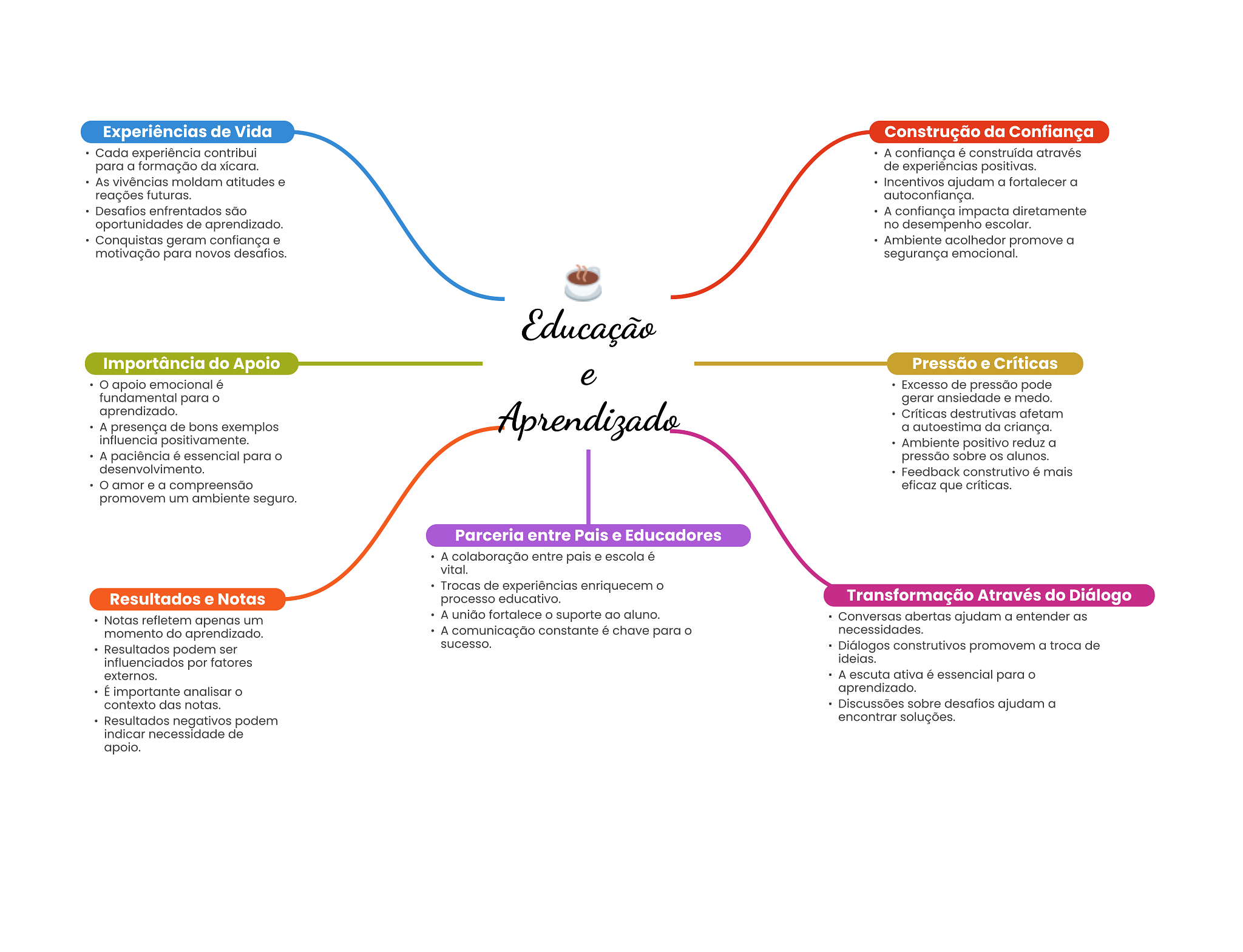 Experiências de Vida Construção da Confiança Cada experiência contribui A confiança é construída através para a formação da xícara. de experiências positivas. As vivências moldam atitudes e Incentivos a fortalecer a reações futuras. autoconfiança. Desafios enfrentados são A confiança impacta diretamente oportunidades de aprendizado. no desempenho escolar. Conquistas geram confiança e Ambiente acolhedor promove a motivação para novos desafios. segurança emocional. Educação Importância do Apoio Pressão e Críticas apoio emocional é e Excesso de pressão pode fundamental para gerar ansiedade e medo. aprendizado. Aprendizado Críticas destrutivas afetam A presença de bons exemplos a autoestima da criança. influencia positivamente. Ambiente positivo reduz a A paciência é essencial para pressão sobre OS alunos. Feedback construtivo é mais amor e a compreensão eficaz que críticas. promovem um ambiente seguro. Parceria entre Pais e Educadores A colaboração entre pais e escola é vital. Trocas de experiências enriquecem Resultados e Notas processo educativo. Transformação Através do Diálogo Notas refletem apenas um A união fortalece suporte ao aluno. Conversas abertas ajudam a entender as momento do aprendizado. A comunicação constante é chave para necessidades. Resultados podem ser sucesso. Diálogos construtivos promovem a troca de influenciados por fatores ideias. externos. A escuta ativa é essencial para O É importante analisar aprendizado. contexto das notas. Discussões sobre desafios ajudam a Resultados negativos podem encontrar soluções. indicar necessidade de apoio.
