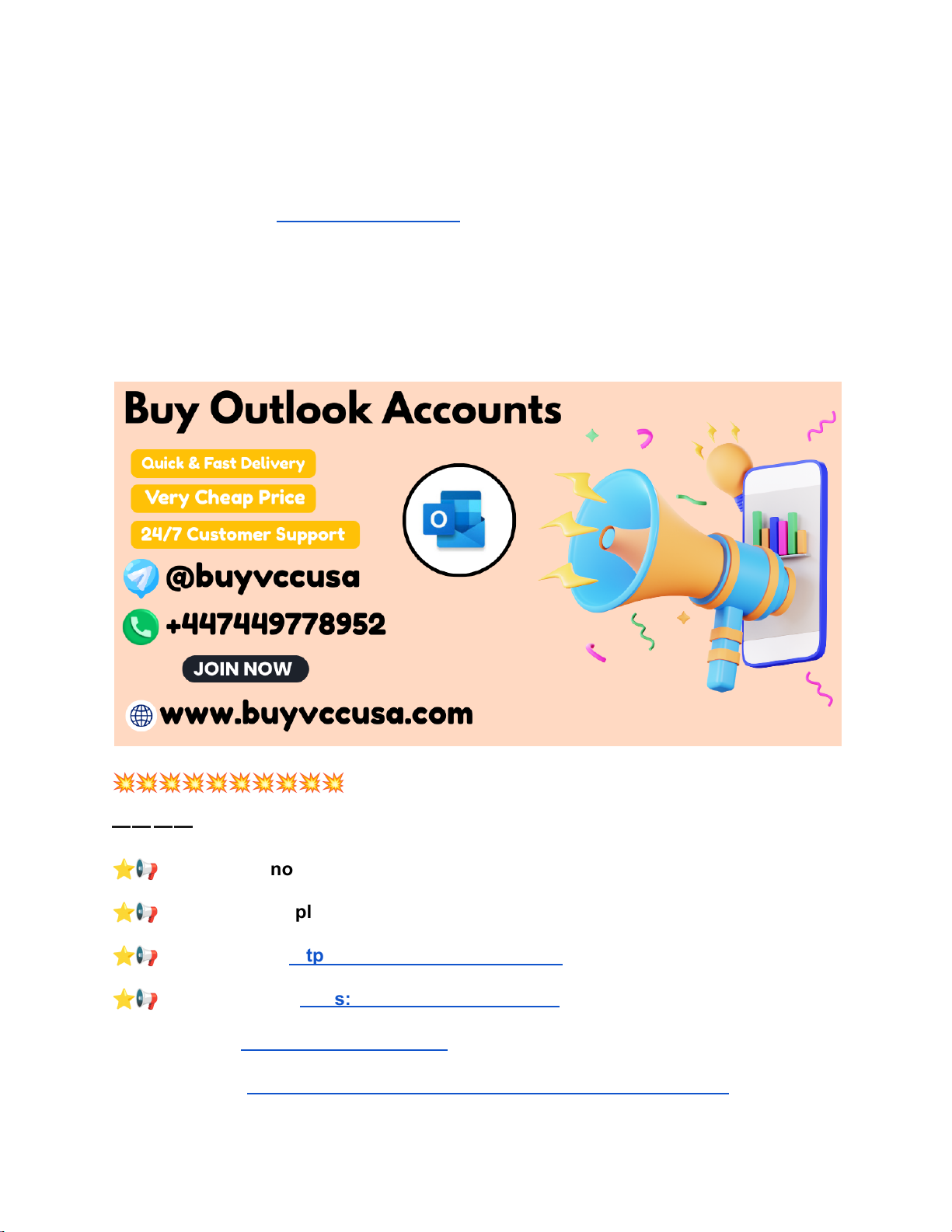 Best Deals to Buy Outlook Accounts Online at Low Price If you are planning to Buy Outlook Accounts for professional, marketing, or business use, BuyVccUsa.com is a trusted and reliable website. We provide secure Microsoft Outlook accounts suitable for SEO, social media, cold emailing, and automation. All accounts are tested before delivery to ensure full access, proper login, and stability. With instant delivery, secure payment methods, and responsive customer support, BuyVccUsa.com offers a smooth and risk-free buying experience. Whether you need single or bulk Outlook accounts, we focus on quality, affordability, and customer satisfaction worldwide. 💥💥💥💥💥💥💥💥💥💥 — — — — — — — — — — ⭐📢➥➤Contact now for more information and services ⭐📢➥➤24-Hour Reply/Contact ⭐📢➥➤Telegram: https://telegram.me/buyvccusa ⭐📢➥➤WhatsApp: https://wa.me/+447449778952 ▣Website link: https://buyvccusa.com/ ▣Product Link: https://buyvccusa.com/product/buy-outlook-accounts/ https://buyvccusa.com/product/buy-hotmail-accounts/ https://telegram.me/buyvccusa https://wa.me/+447449778952 https://buyvccusa.com/ https://buyvccusa.com/product/buy-outlook-accounts/ — — — — — — — — — — 💥💥💥💥💥💥💥💥💥💥 What Is Microsoft Outlook? Microsoft Outlook is a professional email service developed by Microsoft that allows users to send and receive emails, manage calendars, organize contacts, and communicate efficiently. Outlook is widely trusted for its strong security, reliable email delivery, and clean interface. Businesses, marketers, and professionals use Outlook for daily communication and online registrations. Because it integrates seamlessly with Microsoft tools, Outlook is suitable for both personal and professional use. Its global acceptance makes Outlook accounts valuable for many online activities. Buy Outlook Accounts for SEO Outlook accounts are commonly used for SEO tasks such as outreach campaigns, account verification, and professional communication. BuyVccUsa.com provides Outlook accounts suitable for SEO professionals who need stable and reliable email access. Verified and aged Outlook accounts improve trust and reduce issues when performing SEO-related activities. Responsible usage helps maintain long-term usability and performance. Buy Outlook Accounts for Social Media Outlook accounts are widely used to create and manage social media accounts. Many platforms accept Outlook email IDs for registration and verification. BuyVccUsa.com offers Outlook accounts suitable for social media purposes, including account creation and management. Using verified or aged accounts helps reduce restrictions. These accounts are tested to ensure smooth login and usability. 💥💥💥💥💥💥💥💥💥💥 — — — — — — — — — — ⭐📢➥➤Contact now for more information and services ⭐📢➥➤24-Hour Reply/Contact ⭐📢➥➤Telegram: https://telegram.me/buyvccusa ⭐📢➥➤WhatsApp: https://wa.me/+447449778952 ▣Website link: https://buyvccusa.com/ https://buyvccusa.com/product/buy-hotmail-accounts/ https://buyvccusa.com/product/buy-hotmail-accounts/ https://telegram.me/buyvccusa https://wa.me/+447449778952 https://buyvccusa.com/ ▣Product Link: https://buyvccusa.com/product/buy-outlook-accounts/ — — — — — — — — — — 💥💥💥💥💥💥💥💥💥💥 Can I Link Outlook Accounts to Social Media? Yes, Outlook accounts can be linked to most major social media platforms. Outlook email IDs are accepted for account creation, verification, and recovery purposes. BuyVccUsa.com provides Outlook accounts that work well for linking with social media profiles. Using a stable account and maintaining normal activity patterns helps ensure smooth integration. How to Secure a Bought Outlook Account? After buying an Outlook account, it is important to secure it properly. Users should change the password, update recovery email details, and enable security options if available. Avoid logging in from multiple locations suddenly. BuyVccUsa.com delivers full-access accounts, allowing buyers to secure them easily. Responsible usage helps maintain account safety. Can I Upgrade an Outlook Account to a Business Plan? Yes, Outlook accounts can be upgraded to Microsoft business or premium plans if required. Business plans offer additional features such as increased storage and advanced tools. BuyVccUsa.com provides Outlook accounts suitable for upgrades. Users should follow Microsoft’s official upgrade process to ensure compliance. How to Warm Up a New Outlook Account? Warming up a new Outlook account involves gradual usage. Start by sending a few emails, adding contacts, and avoiding bulk actions initially. This helps build trust and reduces the risk of restrictions. BuyVccUsa.com provides clean Outlook accounts suitable for proper warm-up. Responsible usage improves long-term stability. 💥💥💥💥💥💥💥💥💥💥 — — — — — — — — — — ⭐📢➥➤Contact now for more information and services ⭐📢➥➤24-Hour Reply/Contact https://buyvccusa.com/product/buy-outlook-accounts/ https://buyvccusa.com/product/buy-hotmail-accounts/ https://buyvccusa.com/product/buy-hotmail-accounts/ ⭐📢➥➤Telegram: https://telegram.me/buyvccusa ⭐📢➥➤WhatsApp: https://wa.me/+447449778952 ▣Website link: https://buyvccusa.com/ ▣Product Link: https://buyvccusa.com/product/buy-outlook-accounts/ — — — — — — — — — — 💥💥💥💥💥💥💥💥💥💥 Can I Use VPN with Outlook Accounts? VPNs can be used with Outlook accounts, but it is important to maintain consistency. Frequent location changes may trigger security checks. BuyVccUsa.com recommends using stable IP locations and avoiding sudden changes. Proper VPN usage helps maintain account safety. How Can I Bulk Create Outlook Accounts? Bulk creation of Outlook accou