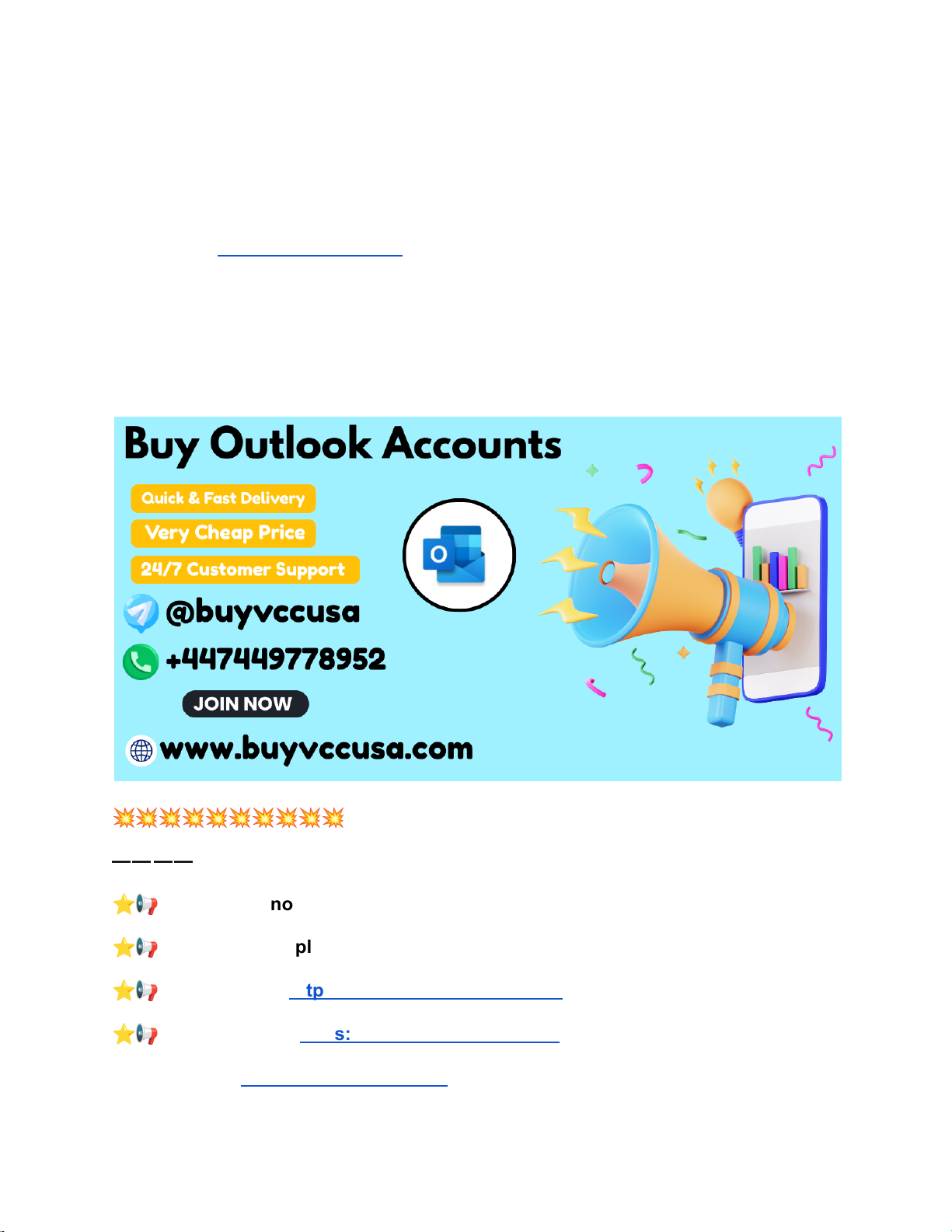 How to Find Reliable and Trusted Outlook Account Sellers If you want to Buy Outlook Accounts safely and efficiently, BuyVccUsa.com is a reliable and trusted online platform. We provide high-quality Microsoft Outlook accounts suitable for email marketing, business communication, automation, SEO, and professional use. All accounts are carefully checked before delivery to ensure full access, stability, and security. With secure payment methods, fast processing, and responsive customer support, BuyVccUsa.com offers a smooth and risk-free buying experience. Whether you need single accounts or bulk quantities, we focus on quality, affordability, and customer satisfaction worldwide. 💥💥💥💥💥💥💥💥💥💥 — — — — — — — — — — ⭐📢➥➤Contact now for more information and services ⭐📢➥➤24-Hour Reply/Contact ⭐📢➥➤Telegram: https://telegram.me/buyvccusa ⭐📢➥➤WhatsApp: https://wa.me/+447449778952 ▣Website link: https://buyvccusa.com/ https://buyvccusa.com/product/buy-hotmail-accounts/ https://telegram.me/buyvccusa https://wa.me/+447449778952 https://buyvccusa.com/ ▣Product Link: https://buyvccusa.com/product/buy-outlook-accounts/ — — — — — — — — — — 💥💥💥💥💥💥💥💥💥💥 What Are Outlook Accounts? Outlook accounts are Microsoft-owned email accounts that allow users to send and receive emails, manage calendars, save contacts, and access Microsoft services. Outlook is widely trusted due to its professional interface, strong security features, and reliable email delivery. These accounts are commonly used for business communication, online registrations, marketing activities, and corporate operations. Because Outlook is backed by Microsoft, it is accepted globally across most platforms. Outlook accounts are suitable for both personal and professional use, making them highly valuable for individuals and businesses alike. Buy Outlook PVA Accounts PVA Outlook accounts are phone-verified accounts that include mobile number verification. Phone verification adds an extra layer of trust and security, making these accounts more stable and reliable. BuyVccUsa.com offers high-quality Outlook PVA accounts suitable for business, automation, and professional use. All PVA accounts are tested before delivery to ensure proper functionality. These accounts are preferred by users who require higher credibility and reduced risk of restrictions. Cheap Outlook Accounts BuyVccUsa.com provides cheap Outlook accounts without compromising on quality. Our affordable pricing makes Outlook accounts accessible for individuals, marketers, and businesses. Even at lower prices, all accounts are tested and delivered with full access. Cheap Outlook accounts are ideal for users who need multiple accounts while keeping costs low. Transparent pricing and reliable service make BuyVccUsa.com a trusted choice. 💥💥💥💥💥💥💥💥💥💥 — — — — — — — — — — ⭐📢➥➤Contact now for more information and services ⭐📢➥➤24-Hour Reply/Contact ⭐📢➥➤Telegram: https://telegram.me/buyvccusa https://buyvccusa.com/product/buy-outlook-accounts/ https://buyvccusa.com/product/buy-hotmail-accounts/ https://buyvccusa.com/product/buy-hotmail-accounts/ https://telegram.me/buyvccusa ⭐📢➥➤WhatsApp: https://wa.me/+447449778952 ▣Website link: https://buyvccusa.com/ ▣Product Link: https://buyvccusa.com/product/buy-outlook-accounts/ — — — — — — — — — — 💥💥💥💥💥💥💥💥💥💥 Outlook Accounts for Sale We offer Outlook accounts for sale with instant delivery and secure transactions. BuyVccUsa.com ensures all accounts meet quality standards before delivery. Customers can choose from different account types based on their needs. Our platform is designed for convenience, speed, and reliability, making the purchasing process simple and efficient. What Are Verified Outlook Accounts? Verified Outlook accounts are accounts that have completed required verification steps, making them more trustworthy and stable. These accounts are less likely to face limitations and are suitable for professional and business use. BuyVccUsa.com supplies verified Outlook accounts to ensure better performance and long-term usability. Verified accounts are ideal for marketing, communication, and automation tasks. Are Outlook Accounts Good for Email Marketing? Yes, Outlook accounts are widely used for email marketing due to their strong deliverability and professional reputation. They are suitable for newsletters, outreach campaigns, and customer communication. Using verified or aged Outlook accounts improves trust and reduces delivery issues. BuyVccUsa.com provides Outlook accounts designed for responsible email marketing use. Can Outlook Accounts Be Used for Business Purposes? Outlook accounts are ideal for business purposes, including professional communication, registrations, and internal operations. Their integration with Microsoft services makes them reliable for corporate use. BuyVccUsa.com offers business-ready Outlook accounts that support scalability and efficiency. Businesses trust Outlook for secure and professional email communication. 💥💥💥💥💥💥💥💥💥💥 https://wa.me/+447449778952 https://buyvccusa.com/ https://buyvccusa.com/product/buy-outlook-accounts/ https://buyvccusa.com/product/buy-hotmail-accounts/ https://buyvccusa.com/product/buy-hotmail-accounts/ — — — — — — — — — — ⭐📢➥➤Contact now for more information and services ⭐📢➥➤24-Hour Reply/Contact ⭐📢➥➤Telegram: https://telegram.me/buyvccusa ⭐📢➥➤WhatsApp: https://wa.me/+447449778952 ▣Website link: https://buyvccusa.com/ ▣Product Link: https://buyvccusa.com/product/buy-outlook-accounts/ — — — — — — — — — — 💥💥💥💥💥💥💥💥💥💥 How Long Do Bought Outlook Accounts Last? The lifespan of bought Outlook accoun