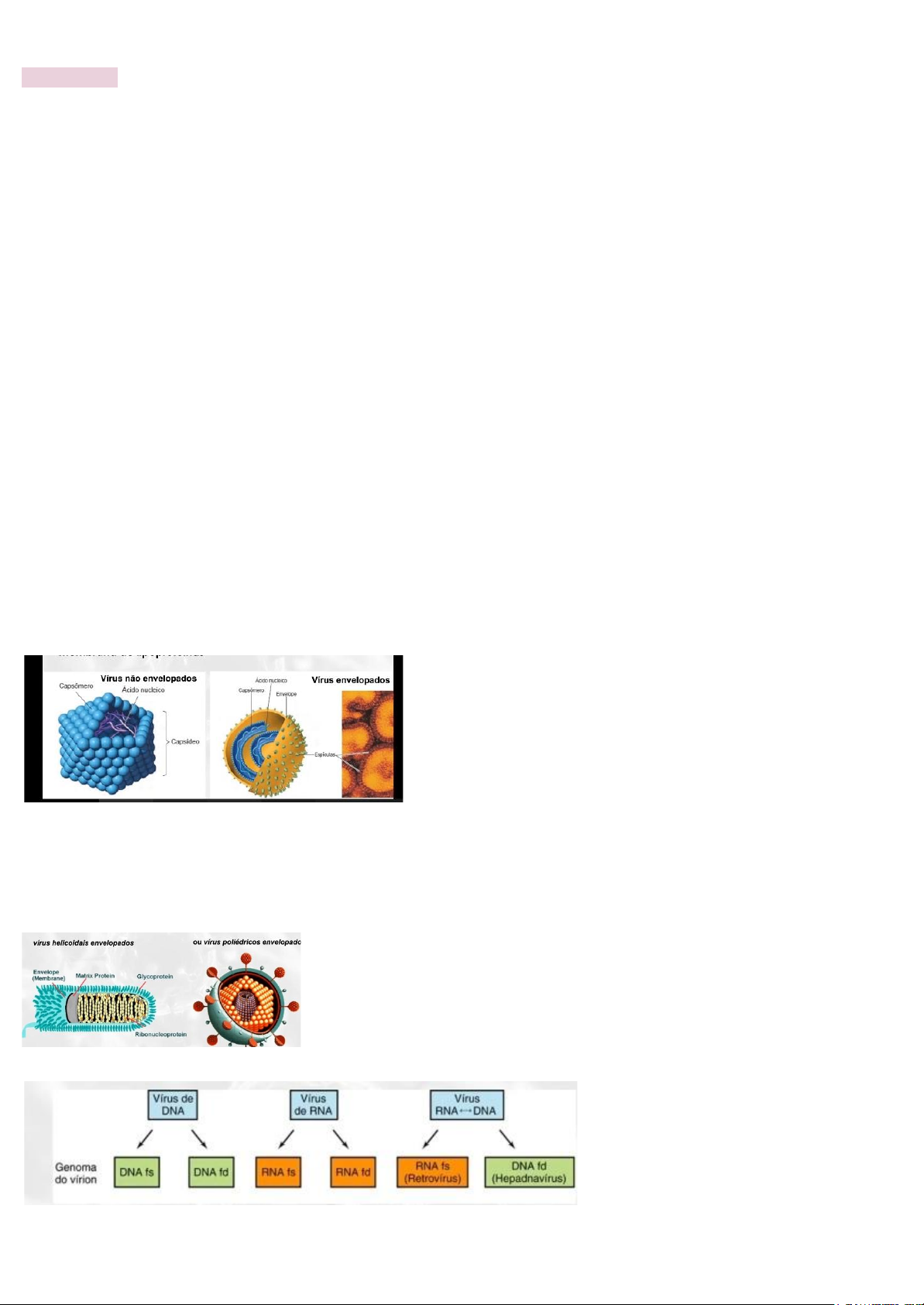 VIROLOGIA INTRODUÇÃO: - agentes infecciosos não celulares -> genomas DNA ou RNA - constituídos de proteínas e alguns de lipídeos - não possuem açúcar como macromolécula - não apresentam atividades metabólicas próprias - replicação somente no interior de células vivas - usando sistemas de produção de energia e biossíntese do hospedeiro para replicação - PARASITAS INTRACELULARES OBRIGATÓRIOS - diferentes graus de dependência para replicação -> depende da quantidade de material genético que o vírus carrega: ● bacteriófagos: menos de 10 genes -> dependência completa ● outros com 30-100 genes, mais independentes CARACTERÍSTICAS GERAIS - ampla distribuição: parasitando animais, plantas, M.O - a maioria é capaz de infectar tipos específicos de células hospedeiro -> raras exceções vírus que cruzam barreiras de espécies MORFOLOGIA BÁSICA - 10-100 vezes menores que as bactérias COMPONENTES: 1- arte central de ácido nucleico 2- capsídeo: capa proteica (unidades: capsômeros) 3- envelope (alguns vírus) nucleocapsídeo envolvido por membrana de lipoproteínas MORFOLOGIA GERAL: - simetria helicoidal -> DNA enrolado em hélice - simetria icosaédrica (poliédricos) -> sistema imunológico já reconhece que é um corpo estranho (bolinhas para fora) - vírus complexos -> vírus de bacteriófagos ÁCIDO NUCLEICO VIRAL + CAPSÍDEO + NUCLEOCAPSÍDEO FS: fita simples FD: fita dupla O GENOMA PODE SER: - linear: vírus de animais com RNA - circular: ex: herpesvírus (dsDNA) - segmentado: vírus da influenza (gripe: 8 segmentos) *A PARTIR DAQUI EU DESISTI DE ENTENDER E PULEI PRA PRÓXIMA AULA, rs CARACTERÍSTICA VIA LISOGÊNICA VIA LÍTICA DNA viral integrado ao DNA bacteriano fica livre no citoplasma efeito na célula célula continua viva e se divide célula é destruída multiplicação viral lenta e silenciosa rápida e destrutiva liberação dos vírus não ocorre, exceto após indução ocorre com lise celular VÍRUS DE DNA FAMÍLIA HERPESVIRIDAE - herpes simples sorotipo 1 ● mucosas labiais e face (olhos- extra labiais) ● vírus se replica na mucosa da boca ● contrai por via respiratória -> aerossóis, saliva ● não tem vacina -> não tem mortalidade acentuada ● vírus fica encubado (entra em estágio de lisogenia / latência) -> aparece depois que sai do ciclo lisogênico -> aparece de novo por baixa imunidade, estresse - herpes simples - sorotipo 2 ● mucosa urogenital ● menor ocorrência que a 1 ● mais difícil de reaparecer -> + controlável - varicela e herpes zoster ● crianças, imunidade fraca ● bolhas no corpo e mucosas ● contrai via respiratória -> se “esconde” nos gânglios cerebrais no estado de latência ● contrai varicela quando criança -> pode desenvolver herpes zoster quando adulto - mononucleose infecciosa - Epstein Barr ● Epstein Barr = herpes-vírus humano tipo 4 ● fadiga, febre, faringite, linfadenopatia ● as células B de memória infectados de forma latente tem vida longa -> devido aos baixos níveis de expressão de proteínas virais -> escapam da detecção por LTCD8 -> assim, a persistência do EBV no copo é vitalícia - HHV6 - Exantema súbito (roseola infantum) ● recém-nascidos ● manchas vermelhas, sintomas de gripe FAMÍLIA POXVIRIDAE - DNA fita dupla - varíola ● infecção: via respiratória ● viremia primária e secundária ● profilaxia: vacina vírus atenuado FAMÍLIA PAPOVAVIRIDAE - DNA fita dupla - gênero: Papilomavirus (hpv) -> IST -> transmissão sexual - potencial oncogênico -> câncer de colo de útero - vacina HPV para prevenir - adenovírus ● vírus sem envoltório com projeções ou fibras ● infecções respiratórias, oculares, diarréia ● não costuma ter estágio de latência FAMÍLIA HEPADNAVIRUS - hepatite B ● retrovírus -> transcriptase reversa ● causa cirrose hepática -> infecta células do fígado ● constituído pela proteína core, no seu interior o genoma do vírus a enzima DNA polimerase / transcriptase reversa ● fodase cccDNA não entendi nada não vai cair VÍRUS DE DNA período de incubação -> vírus tá circulando na corrente sanguínea até entrar no tecido alvo e se replicar -> ainda não teve os principais sintomas ríodo de latência -> após manifestação -> cura -> mas o vírus não morre-> ex: herpes vírus -> aparece quando imunidade baixa -> estímulos (estresse, felicidade) ativam ciclo lítico do vírus HEPATITE A - infecção oral-fecal - se replica no intestino -> pode ir embora nas fezes - vacina inativada -> chega no intestino estimula anticorpos HEPATITE C - hepatite crônica -> cirrose hepática e câncer -> 60% evolui - transmissão via parenteral e sexual - tratamento: anticorpos monoclonais - vacina inativada HEPATITE E - baixa transmissibilidade -> fecal- oral igual a A - HEPATITE DELTA -> precisa ter o B para se replicar HEPATITE G - transmissão via contato sanguíneo - 100% dos infectados se tornam portadores crônicos -> similar a hepatite C - NÃO TEM VACINA INFLUENZAVIRUS - multiplicação nas vias respiratórias - vírus de inverno -> gripe -> síndrome respiratória aguda - mucosa nasal gelada: porta de entrada do vírus - diferenças do resfriado: adenovírus -> não migra tanto -> primavera/verão -> curto, sem febre - redução da resposta dos LT -> susceptibilidade de infecção bacteriana -> oq mata na gripe - vacina: vírus inativado SARAMPO - infecção: vias respiratórias -> replicação: epitélio - incubação 8 a 12 dias -> procurando o tecido ideal para a replicação -> bolhas na pele - afinidade com SNC -> entra em latência -> anos depois: pode desenvolver doenças degenerativas - vacina: vírus atenuado (tríplice viral) RUBÉOLA - infecção: vias respiratórias superiores -> viremia: linfonodos locais - linfadenopatia - incubação: 15 dias -> depois: se replica no epitélio cutâneo - vacina: vírus atenuado -> sequelas no feto via vacinal -> por isso toma na infância CAXUMBA - infecç