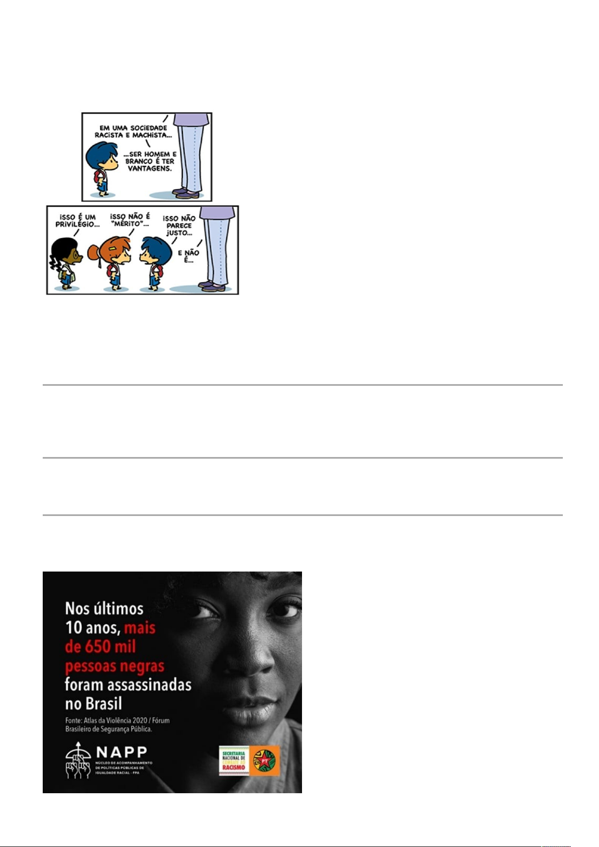 Língua Portuguesa 1ª Série Atividade de Interpretação sobre o Racismo Leia a tirinha para responder às questões 1 a 3. https://www.tumblr.com/tirasarmandinho/150684859654/tirinha-original 1. O que os personagens estão tentando mostrar quando dizem que “ser homem e branco é ter vantagens”? 2. Quem são os personagens que dialogam sobre o privilégio? O que isso representa? 3. Qual é a principal mensagem que o autor quer transmitir? Analise o texto e responda às questões 4 a 6. https://twitter.com/_CLACSO/status/1303083136495030274 4. O gênero do texto acima pode ser classificado como a) notícia jornalística. b) cartaz informativo. c) charge. d) infográfico. 5. Qual é a principal finalidade do texto apresentado? a) Argumentar sobre uma estatística de racismo. b) Alertar para a violência contra pessoas negras. c) Divulgar uma instituição que combate o racismo. d) Incentivar ações governamentais contra o racismo. 6. O que o dado “mais de 650 mil pessoas negras foram assassinadas” revela sobre a situação no país? Leia o texto para responder às questões 7 a 10. https://observatoriodesigualdades.fjp.mg.gov.br/?p=4049 7. O que a comparação entre taxas de homicídio de negros (29,7 por 100 mil) e não negros (10,8 por 100 mil) revela sobre a violência no Brasil? 8. O infográfico destaca que, em média, uma pessoa negra é assassinada a cada 12 minutos. O que essa informação sugere? 9. O infográfico faz o leitor refletir sobre que tipo de responsabilidade social? 10. A quem esse infográfico parece ser direcionado? ______________________________________________________________________________________________ image1.jpeg image2.jpeg image3.jpeg