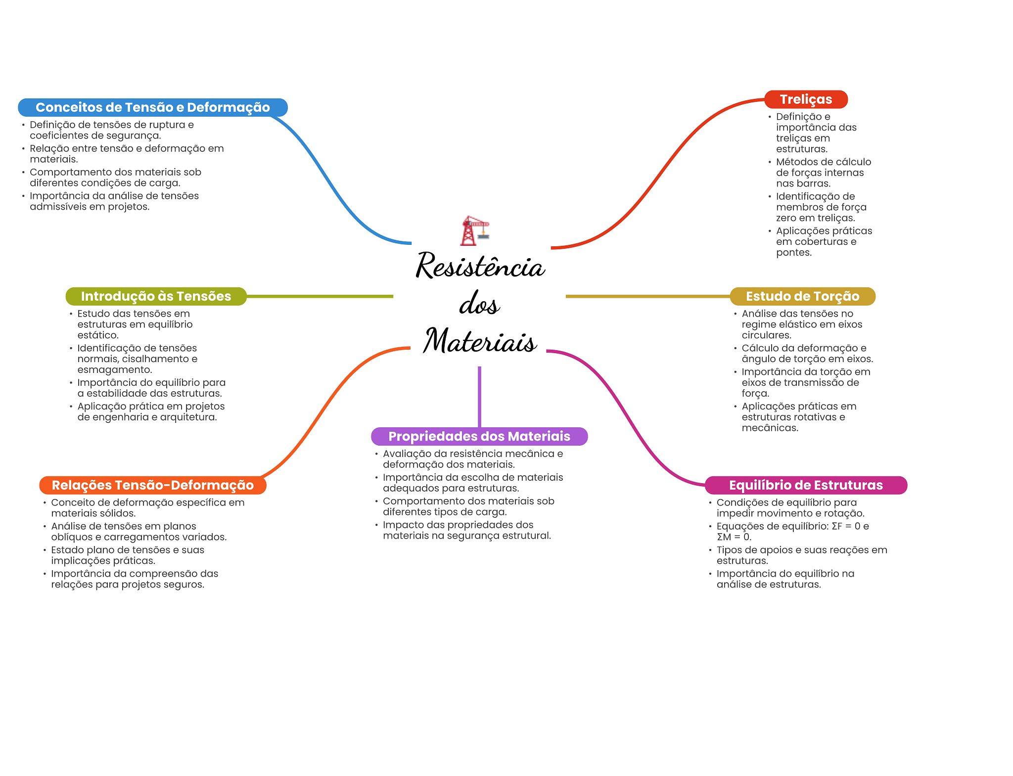 Treliças Conceitos de Tensão e Deformação Definição e Definição de tensões de ruptura e importância das coeficientes de segurança. treliças em Relação entre tensão e deformação em estruturas. materiais. Métodos de cálculo Comportamento dos materiais sob de forças internas diferentes condições de carga. nas barras. Importância da análise de tensões Identificação de admissíveis em projetos. membros de força zero em treliças. Aplicações práticas em coberturas e pontes. Resistência Introdução às Tensões dos Estudo de Torção Estudo das tensões em Análise das tensões no estruturas em equilíbrio regime elástico em eixos estático. Identificação de tensões Materiais circulares. Cálculo da deformação e normais, cisalhamento e ângulo de torção em eixos. esmagamento. Importância da torção em Importância do equilíbrio para eixos de transmissão de a estabilidade das estruturas. força. Aplicação prática em projetos Aplicações práticas em de engenharia e arquitetura. estruturas rotativas e mecânicas. Propriedades dos Materiais Avaliação da resistência mecânica e deformação dos materiais. Importância da escolha de materiais Relações Tensão-Deformação adequados para estruturas. Equilíbrio de Estruturas Conceito de deformação específica em Comportamento dos materiais sob Condições de equilíbrio para materiais sólidos. diferentes tipos de carga. impedir movimento e rotação. Análise de tensões em planos Impacto das propriedades dos Equações de equilíbrio: = 0 e oblíquos e carregamentos variados. materiais na segurança estrutural. = 0. Estado plano de tensões e suas Tipos de apoios e suas reações em implicações práticas. estruturas. Importância da compreensão das Importância do equilíbrio na relações para projetos seguros. análise de estruturas.