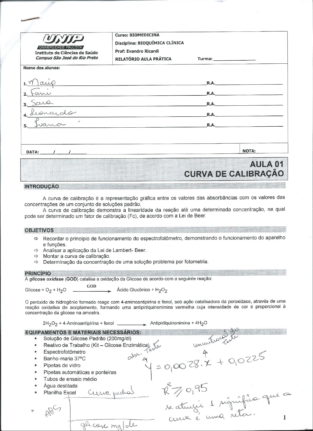 Curso: BIOMEDICINA UNIP Disciplina: BIOQUÍMICA CLÍNICA UNIVERSIDADE PAULISTA Instituto de Ciências da Saúde Prof: Evandro Ricardi Campus São José do Rio Preto RELATÓRIO AULA PRÁTICA Turma: Nome dos alunos: 1. R.A. 2. Fani R.A. 3. Save R.A. 4. Leonardo R.A. 5. Ivana R.A. DATA: / / NOTA: AULA 01 CURVA DE CALIBRAÇÃO INTRODUÇÃO A curva de calibração é a representação gráfica entre valores das absorbâncias com OS valores das concentrações de um conjunto de soluções padrão. A curva de calibração demonstra a linearidade da reação até uma determinada concentração, na qual pode ser determinado um fator de calibração (Fc), de acordo com a Lei de Beer. OBJETIVOS Recordar princípio de funcionamento do espectrofotômetro, demonstrando funcionamento do aparelho e funções. Analisar a aplicação da Lei de Lambert- Beer. Montar a curva de calibração. Determinação da concentração de uma solução problema por fotometria. PRINCÍPIO A glicose oxidase (GOD) catalisa a oxidação da Glicose de acordo com a seguinte reação: GOD Glicose + O₂ + Ácido Glucônico + H₂O₂ peróxido de hidrogênio formado reage com 4-aminoantipirina e fenol, sob ação catalisadora da peroxidase, através de uma reação oxidativa de acoplamento, formando uma antipirilquinonimina vermelha cuja intensidade de cor é proporcional à concentração da glicose na amostra. 2H₂O₂ + 4-Aminoantipirina + fenol Antipirilquinonimina + EQUIPAMENTOS E MATERIAIS NECESSÁRIOS: Solução de Glicose Padrão (200mg/dl) Reativo de Trabalho (Kit Glicose Enzimática) Espectrofotômetro Teste Banho-maria 37°C abs. 4 Pipetas de vidro = + 0,0225 Pipetas automáticas e ponteiras Tubos de ensaio médio Água destilada 2 Planilha Excel se 1 significa que a e' uma 1 gli mg/de= 0,0038 X -0,0815 - = 0,0815 0,0038.x 0,0815 x = 0,333 +0,0815 + X = 109,07 7 mgPROCEDIMENTO: Curva de glicose A- Determinar a concentração de glicose em uma solução problema: 2000 1. Tomar 6 tubos de ensaio e proceder como a seguir: Y Tubos Solução Padrão Glicose Água Reagente Absorbância Problema Concentação de (200mg/dl) Destilada Trabalho (D.O.) Glicose (mg/dl) Branco 2,0 ml A 5 15 2,0 ml 50,0 10 10 2,0 ml 100,0 C 15 5 2,0 ml 150,0 D 20 2,0 ml 200,0 Teste 20 2,0 ml 2. colocar em banho-maria a 37 durante minutos. nível da água no banho deve ser superior ao nível dos reagentes nos tubos de ensaio. 3. Determinar as absorbâncias do teste e padrão em 505 nm, acertando o zero com o branco. A cor é estável por 60 minutos. 4. Construir, em planilha Excel, a curva padrão (absorbâncias na ordenada e concentrações na abscissa), considerando os pontos zero de absorção e de concentração. 5. Determinar a concentração de glicose do Tubo Teste (solução problema) através da equação de regressão linear. Y Abs (Abs) C B de T A 150 200 0 [glicose] mg/de a Abs 15-3-16 Tubo A,B,C = 2Pipeta 0,5 200 mg/de -D AD- - - tuho de - de maria - Teste do Tow) - tubos bue - c Teste Um tuber com D Tube A & de geicose l AD 15 com a Tube B 10 de glicose AD 10 ul. C D idem Tubo D-D Teste todo, - leva as - - 100 - 1000 Espectro A 0.127 Teste 0.333