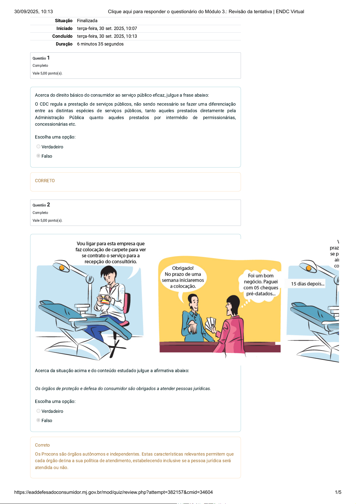 Situação Finalizada Iniciado terça-feira, 30 set. 2025, 10:07 Concluído terça-feira, 30 set. 2025, 10:13 Duração 6 minutos 35 segundos Questão 1 Completo Vale 5,00 ponto(s). Questão 2 Completo Vale 5,00 ponto(s). Escolha uma opção: Acerca do direito básico do consumidor ao serviço público eficaz, julgue a frase abaixo: O CDC regula a prestação de serviços públicos, não sendo necessário se fazer uma diferenciação entre as distintas espécies de serviços públicos, tanto aqueles prestados diretamente pela Administração Pública quanto aqueles prestados por intermédio de permissionárias, concessionárias etc. Verdadeiro Falso CORRETO Escolha uma opção: Acerca da situação acima e do conteúdo estudado julgue a afirmativa abaixo: Os órgãos de proteção e defesa do consumidor são obrigados a atender pessoas jurídicas. Verdadeiro Falso Correto Os Procons são órgãos autônomos e independentes. Estas características relevantes permitem que cada órgão defina a sua política de atendimento, estabelecendo inclusive se a pessoa jurídica será atendida ou não. 30/09/2025, 10:13 Clique aqui para responder o questionário do Módulo 3.: Revisão da tentativa | ENDC Virtual https://eaddefesadoconsumidor.mj.gov.br/mod/quiz/review.php?attempt=382157&cmid=34604 1/5 Questão 3 Completo Vale 5,00 ponto(s). Em relação ao direito à prevenção e reparação de danos (prejuízos/perdas), faça a associação correta: O dano provocado pelo fornecedor pode atingir apenas um consumidor. Dano individual O dano atinge vários consumidores determináveis (dano coletivo) ou um número indeterminado de consumidores. Dano difuso Relativo ao patrimônio do consumidor. Dano material Relativo ao abalo que o consumidor vier a sofrer quando agredido em sua personalidade. Dano moral Sua resposta está correta. 30/09/2025, 10:13 Clique aqui para responder o questionário do Módulo 3.: Revisão da tentativa | ENDC Virtual https://eaddefesadoconsumidor.mj.gov.br/mod/quiz/review.php?attempt=382157&cmid=34604 2/5 Questão 4 Completo Vale 5,00 ponto(s). Escolha uma opção: Acerca da situação hipotética acima e do conteúdo estudado, julgue as afirmativas abaixo: 1) O direito à informação não foi respeitado. 2) A senhora leu e compreendeu o contrato. 3) O representante da editora de livros agiu respeitando o princípio da boa-fé contratual. 4) A senhora idosa é considerada vulnerável e, de acordo com a situação descrita, o contrato é inválido. 5) Mãe e filha podem procurar um órgão de proteção e defesa do consumidor para contestar a cobrança indevida. De acordo com as afirmativas acima, julgue quais são FALSAS e quais são VERDADEIRAS, em seguida marque a alternativa que indica a sequência CORRETA: 1. V – F – F – V – F 2. V – F – F – V – V 3. F – F – V – V – V 4. V – F – F – F – V Sua resposta está incorreta. 30/09/2025, 10:13 Clique aqui para responder o questionário do Módulo 3.: Revisão da tentativa | ENDC Virtual https://eaddefesadoconsumidor.mj.gov.br/mod/quiz/review.php?attempt=382157&cmid=34604 3/5 Questão 5 Completo Vale 5,00 ponto(s). Questão 6 Completo Vale 5,00 ponto(s). Escolha uma opção: Acerca dos direitos básicos dos consumidores julgue a frase abaixo: Quando se fala em direitos básicos, tem-se a exata noção de que há “valores e preceitos fundamentais que não podem ser deixados de lado, pois integram uma lista básica ou mínima de condições para que o consumidor conviva no mercado com dignidade”. Verdadeiro Falso CORRETO Escolha uma opção: Acerca dos direitos básicos dos consumidores, julgue a frase abaixo: Quando se fala em direitos básicos, tem-se a exata noção de que há “valores e preceitos fundamentais que não podem ser deixados de lado, pois integram uma lista básica ou mínima de condições para que o consumidor conviva no mercado com dignidade”. Verdadeiro Falso CORRETO 30/09/2025, 10:13 Clique aqui para responder o questionário do Módulo 3.: Revisão da tentativa | ENDC Virtual https://eaddefesadoconsumidor.mj.gov.br/mod/quiz/review.php?attempt=382157&cmid=34604 4/5 Questão 7 Completo Vale 5,00 ponto(s). Escolha uma opção: Acerca do direito à informação, julgue a situação abaixo: Se não houve informação para o consumidor acerca do seguro, pode ficar configurada a cobrança indevida. Neste caso, ele poderá pedir a restituição em dobro do que lhe foi cobrado indevidamente. Verdadeiro Falso Correto Atividade anter ior Para iniciar os estudos desse módulo, clique aqui e acesse às Telas Interativas do Módulo 3. Seguir para... Próxima at iv idade Gostaria de acessar aos materiais do módulo em formato .pdf? Clique aqui. 30/09/2025, 10:13 Clique aqui para responder o questionário do Módulo 3.: Revisão da tentativa | ENDC Virtual https://eaddefesadoconsumidor.mj.gov.br/mod/quiz/review.php?attempt=382157&cmid=34604 5/5 https://eaddefesadoconsumidor.mj.gov.br/mod/hvp/view.php?id=34603&forceview=1 https://eaddefesadoconsumidor.mj.gov.br/mod/folder/view.php?id=34605&forceview=1