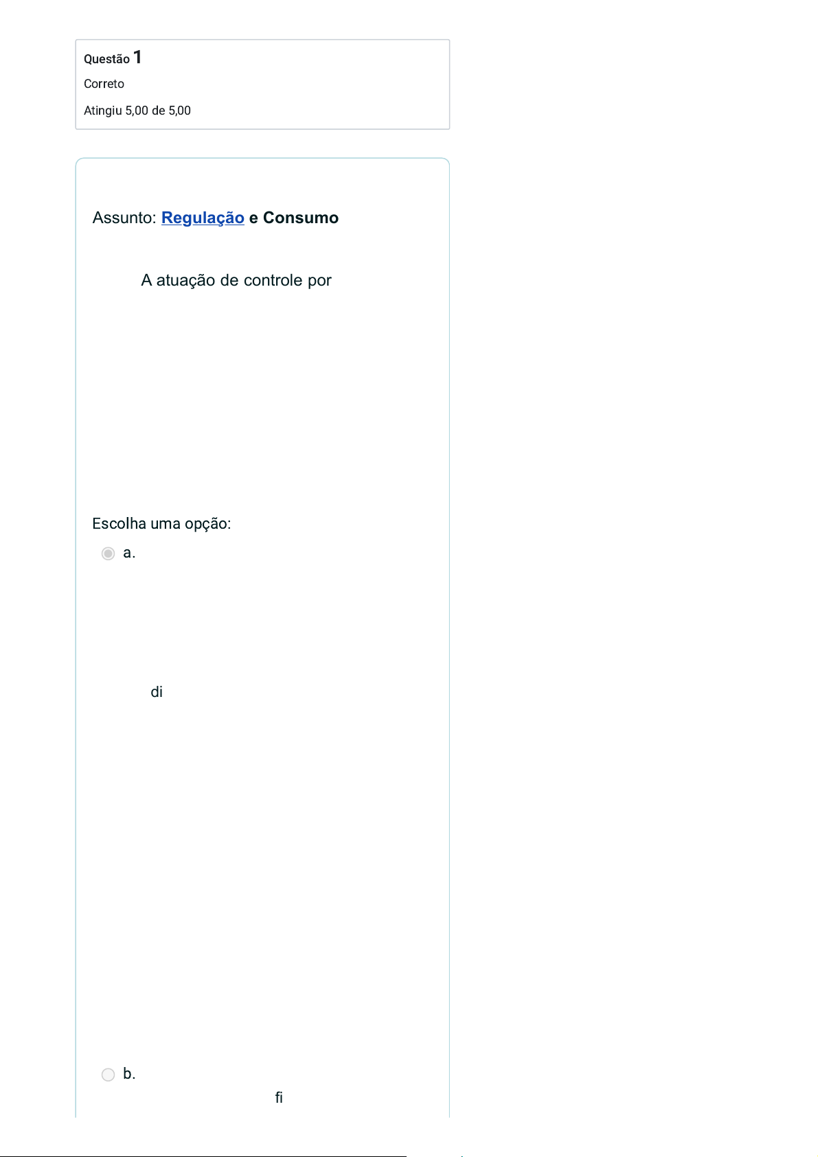 Questão 1 Correto Atingiu 5,00 de 5,00 Escolha uma opção: Assunto: Regulação e Consumo A atuação de controle por regulação do poder público sobre os prestadores de serviços públicos, de utilidade pública ou interesse público, visa garantir condições para que a oferta seja feita de forma ampla, promovendo o acesso do maior número possível de pessoas a esses serviços. Sobre a atividade regulatória no Brasil, marque a opção correta: a. A prestação de serviços regulados à população submete-se às disposições do Código de Defesa do Consumidor, bem como a legislações específicas e regulamentos setoriais. A alternativa está correta.. A prestação de serviços regulados à população submete-se às disposições do Código de Defesa do Consumidor, bem como a legislações específicas e regulamentos setoriais, de forma que os consumidores de tais serviços contam com uma proteção legislativa integrada por estes instrumentos legais. b. São exemplos de serviços regulados no Brasil os serviços financeiros, de 30/09/2025, 08:27 Clique aqui para responder o questionário do Módulo 2.: Revisão da tentativa | ENDC Virtual https://eaddefesadoconsumidor.mj.gov.br/mod/quiz/review.php?attempt=382132&cmid=34430 2/15 https://eaddefesadoconsumidor.mj.gov.br/mod/glossary/showentry.php?eid=97&displayformat=dictionary telecomunicação, de energia elétrica, de transporte aéreo e terrestre e de comércio de automóveis. c. A atividade regulatória não se limita à promulgação de regras, mas inclui a atividade de monitoramento do mercado e a fiscalização de condutas, porém, não inclui a tomada de medidas que visam obrigar os agentes regulados a obedecer às regras estabelecidas. d. A atividade regulatória representa, exclusivamente, a promulgação de regras pelos órgãos e agências reguladoras aos serviços públicos ou privados regulados. Sua resposta está correta. 30/09/2025, 08:27 Clique aqui para responder o questionário do Módulo 2.: Revisão da tentativa | ENDC Virtual https://eaddefesadoconsumidor.mj.gov.br/mod/quiz/review.php?attempt=382132&cmid=34430 3/15 Questão 2 Correto Atingiu 5,00 de 5,00 Escolha uma opção: Assunto: Regulação e Consumo Na década de 1990, o Brasil passou por um grande processo de privatizações, e a exploração de certos serviços públicos, como energia elétrica e telefonia, passou a ser concedida a empresas privadas. Foi nesse contexto de reforma econômica do Estado Brasileiro que surgiram as Agências e órgãos reguladores. Sobre o modelo regulatório no Brasil, marque a opção correta: a. Os órgãos e agências reguladores se assemelham aos órgãos de defesa do consumidor porque ambos atuam, exclusivamente, na proteção dos interesses dos consumidores. b. As agências reguladoras brasileiras seguem a Lei Geral das Agências Reguladoras, que define suas competências e forma de atuação. c. São objetivos planejados das agências reguladoras relacionados à defesa do consumidor: garantir os direitos do consumidor, buscar a qualidade e segurança dos serviços aos menores custos para os consumidores e A alternativa está correta. De acordo com documento elaborado pelo extinto Conselho de Reforma do Estado, é possível afirmar que as Agências Reguladoras foram planejadas no Brasil para terem estes 30/09/2025, 08:27 Clique aqui para responder o questionário do Módulo 2.: Revisão da tentativa | ENDC Virtual https://eaddefesadoconsumidor.mj.gov.br/mod/quiz/review.php?attempt=382132&cmid=34430 4/15 https://eaddefesadoconsumidor.mj.gov.br/mod/glossary/showentry.php?eid=97&displayformat=dictionary dirimir seus conflitos com os fornecedores dos serviços regulados. mencionados objetivos. d. No Brasil apenas as Agências Reguladoras e Autarquias Especiais possuem poder de regular setores de sua competência. Sua resposta está correta. 30/09/2025, 08:27 Clique aqui para responder o questionário do Módulo 2.: Revisão da tentativa | ENDC Virtual https://eaddefesadoconsumidor.mj.gov.br/mod/quiz/review.php?attempt=382132&cmid=34430 5/15 Questão 3 Correto Atingiu 5,00 de 5,00 Escolha uma opção: Assunto: Regulação e Consumo Apesar de empresas privadas passarem a ser responsáveis pela prestação de determinados serviços, a natureza desses serviços continuou sendo pública ou de interesse público, ficando reservadas ao Poder Público certas responsabilidades. Nesse sentido, responda: por que as agências reguladoras foram criadas no Brasil? a. As agências reguladoras surgiram como instrumento da atuação estatal, assumindo funções de planejamento, regulação e fiscalização da adequada prestação dos serviços públicos prestados por empresas privadas, concessionárias e permissionárias. A alternativa está correta. Com as privatizações, empresas privadas passaram a ser responsáveis pela prestação de determinados serviços públicos ou de interesse público, ficando reservada ao Poder Público a responsabilidade quanto à fiscalização de sua adequada prestação e a sua regulamentação. b. As agências reguladoras foram criadas para prestar, no mercado de consumo, serviços públicos ou de interesse 30/09/2025, 08:27 Clique aqui para responder o questionário do Módulo 2.: Revisão da tentativa | ENDC Virtual https://eaddefesadoconsumidor.mj.gov.br/mod/quiz/review.php?attempt=382132&cmid=34430 6/15 https://eaddefesadoconsumidor.mj.gov.br/mod/glossary/showentry.php?eid=97&displayformat=dictionary público aos consumidores, como serviços de telecomunicações e fornecimento de energia elétrica. c. As agências reguladoras foram criadas para fiscalizar empresas prestadoras de serviços regulados, entre outras atividades, não podendo os Procons atuarem em defesa dos consumidores nesses mercados. d. Porque não existiam, na época de sua criação, órgãos públicos de defesa dos consumidores dos serviços que passaram a ser regulados. Sua resposta está correta. 30/09/2025, 08:27 Clique aqu
