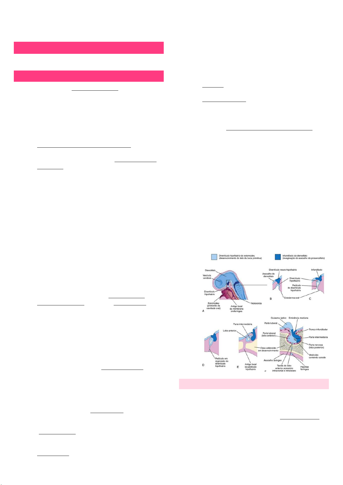 Marcella Abreu- MD4 PROBLEMA 1- MÓDULO 10 EMBRIOLOGIA DA HIPÓFISE • A hipófise tem origem ectodérmica. • A sinalização da via de Notch foi implicada na proliferação e diferenciação das células progenitoras hipofisárias. • Ela se desenvolve de 2 fontes: - Pelo desenvolvimento por evaginação do teto ectodérmico de estomodeu (cavidade oral primitiva) imediatamente em frente à membrana orofaríngea, o divertículo hipofisário (bolsa de Rathke). - Uma invaginação (extensão no sentido caudal) do neuroectoderma do diencéfalo, o divertículo neuro- hipofisário (espécie de pedículo, o infundíbulo) • Por conta dessa origem dupla, a hipófise é composta por 2 tipos diferentes de tecidos: - A adeno-hipófise (tecido glandular), ou lobo anterior, desenvolve-se a partir do ectoderma oral. - A neuro-hipófise (tecido nervoso), ou lobo posterior, desenvolve-se a partir do neuroectoderma • 3ª semana: o divertículo hipofisário se projeta do teto do estomodeu e fica adjacente ao assoalho do diencéfalo. • 5ª semana: o divertículo se alongou e sofreu uma constrição em sua ligação ao epitélio oral, o que confere aspecto de mamilo. Nesse estágio, ele entra em contato com o infundíbulo (derivado do divertículo neuro-hipofisário), uma invaginação ventral do diencéfalo. O pedículo do divertículo regride • As partes da hipófise que se desenvolvem do ectoderma do estomodeu – as partes anterior, intermédia e tuberal – formam a adenohipófise. • O pedículo do divertículo hipofisário passa entre os centros de formação de cartilagem dos ossos pré- esfenoide e basiesfenoide do crânio • Durante a 6ª semana e a conexão da bolsa com a cavidade oral degenera e desaparece • Células da parede anterior do divertículo hipofisário proliferam e dão origem à parte distal da hipófise. Mais tarde, uma extensão do lobo anterior, a parte tuberal, cresce ao redor da haste infundibular (infundíbulo) • A extensa proliferação celular da parede anterior do divertículo hipofisário reduz a sua luz a uma fenda estreita. Esta fenda residual geralmente não é reconhecida na glândula adulta, mas pode ser representada por uma zona de cistos • Células na parede posterior da bolsa hipofisária não proliferam; elas originam uma parte intermediária (pars intermedia) delgada e mal definida • A parte da hipófise que se origina do neuroectoderma do encéfalo (infundíbulo) é a neurohipófise. Este infundíbulo dá origem à eminência média, à haste infundibular e à parte nervosa • Inicialmente, as paredes do infundíbulo são delgadas, mas a extremidade distal do infundíbulo logo se torna maciça por conta da proliferação de células neuroepiteliais. Mais tarde estas se diferenciam em pituicitos, as células primárias do lobo posterior da hipófise, que estão intimamente relacionadas com as células neurogliais. • As fibras nervosas penetram a pars nervosa advindas da área hipotalâmica (à qual o infundíbulo é ligado) e se desenvolvem nela CONTEXT: Hipófise Faríngea e Craniofaringioma: Um resquício da haste do divertículo hipofisário pode persistir e formar uma hipófise faríngea no teto da orofaringe. Muito raramente, massas de tecido do lobo anterior desenvolvem-se fora da cápsula da hipófise, dentro da sela túrcica do esfenoide. Em 1% dos casos, um resquício do divertículo hipofisário, o canal basifaríngeo, é visível em cortes do osso esfenoide de recém-nascidos. Também pode ser identificado em algumas radiografias de recém- nascidos. Ocasionalmente, craniofaringiomas (tumor benigno e raro) se formam na faringe ou no basiesfenóide (parte posterior do esfenoide) a partir de resquícios da haste da bolsa hipofisária, mas, com mais frequência, se formam na sela túrcica ou acima dela. Esses tumores surgem ao longo da via do divertículo hipofisário, a partir dos remanescentes do epitélio REGULAÇÃO MOLECULAR • Os fatores de transcrição gênica são expressos em diferentes estágios da organogênese, estando sobrepostos, temporal e espacialmente • Esses fatores de transcrição são genes homeobox que codificam um domínio de 60 aminoácidos (homeodomain), que se liga ao DNA, estando envolvido na regulação do desenvolvimento • Os principais fatores de transcrição envolvidos na organogênese hipofisária são: Rxpx/Hesx1, Ptx1, Marcella Abreu- MD4 Lhx3, Lhx-4, Prop-1 e Pit-1. A partir de uma única célula, formam-se 5 tipos celulares • Cada tipo celular é caracterizado pela secreção de hormônios com funções específicas, em resposta a sinais hipotalâmicos e periféricos ANATOMIA DA HIPÓFISE • A hipófise (glândula pituitária) é uma glândula endócrina e centro mais compacto de produção química do corpo • Essa glândula oval, com o tamanho e o peso de uma ervilha, situa-se na base do cérebro, abaixo do hipotálamo no interior da sela turca/túrcica, uma depressão no osso esfenóide • É conectada ao hipotálamo por um pedículo curto, o infundíbulo, o qual desce até a superfície póstero- superior da hipófise; e por uma rede vascular • O diafragma da sela circunda o infundíbulo e mantém a hipófise em sua posição no interior da sela turca. • Apresenta 2 componentes funcionais: - O lobo anterior (adeno-hipófise), constituído pelo tecido epitelial glandular - O lobo posterior (neuro-hipófise), constituído pelo tecido secretor neural • Nove hormônios peptídeos importantes são liberados pela hipófise, dois pela parte nervosa da neuro-hipófise e sete pelas partes distal e intermédia da adeno-hipófise ADENO-HIPÓFISE/HIPÓFISE ANTERIOR • Desempenha um papel fundamental na regulação da função endócrina, por meio da produção e da liberação dos hormônios tróficos • A função da adeno-hipófise e, consequentemente, a produção dos hormônios tróficos são reguladas pelo hipotálamo por meio dos neuropeptídeos hipofisiotróficos liberados na 