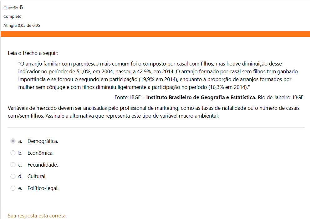Questão 6 Completo Atingiu 0,05 de 0,05 Leia O trecho a seguir: "O arranjo familiar com parentesco mais comum foi O composto por casal com filhos, mas houve diminuição desse indicador no período: de 51,0%, em 2004, passou a 42,9%, em 2014. arranjo formado por casal sem filhos tem ganhado importância e se tornou O segundo em participação (19,9% em 2014), enquanto a proporção de arranjos formados por mulher sem cônjuge e com filhos diminuiu ligeiramente a participação no período (16,3% em 2014)." Fonte: IBGE Instituto Brasileiro de Geografia e Estatística. Rio de Janeiro: IBGE. Variáveis de mercado devem ser analisadas pelo profissional de marketing, como as taxas de natalidade ou O número de casais com/sem filhos. Assinale a alternativa que representa este tipo de variável macro ambiental: a. Demográfica. b. Econômica. C. Fecundidade. d. Cultural. e. Político-legal. Sua resposta está correta.