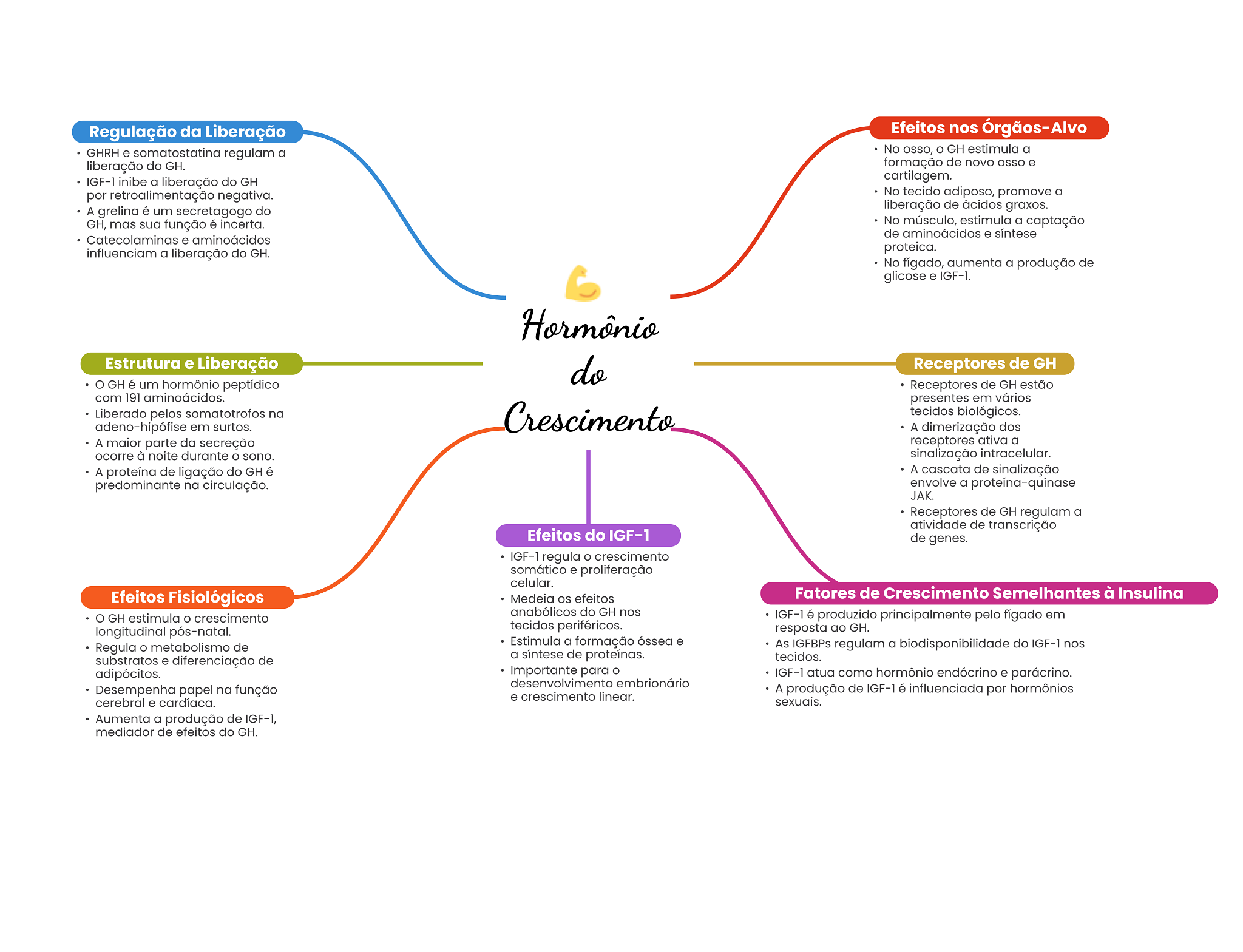 Regulação da Liberação Efeitos nos Órgãos-Alvo GHRH e somatostatina regulam a No osso, GH estimula a liberação do GH. formação de novo osso e IGF-1 inibe a liberação do GH cartilagem. por retroalimentação negativa. No tecido adiposo, promove a A grelina é um secretagogo do liberação de ácidos graxos. GH, mas sua função é incerta. No músculo, estimula a captação de aminoácidos e síntese Catecolaminas e aminoácidos influenciam a liberação do GH. proteica. No fígado, aumenta a produção de glicose e IGF-1. Hormônio Estrutura e Liberação do Receptores de GH GH é um hormônio peptídico Receptores de GH estão com 191 aminoácidos. presentes em vários Liberado pelos somatotrofos na Crescimento tecidos biológicos. adeno-hipófise em surtos. A dimerização dos A maior parte da secreção receptores ativa a ocorre à noite durante sono. sinalização intracelular. A proteína de ligação do GH é A cascata de sinalização predominante na circulação. envolve a proteína-quinase JAK. Receptores de GH regulam a atividade de transcrição Efeitos do IGF-1 de genes. IGF-1 regula crescimento somático e proliferação celular. Efeitos Fisiológicos Medeia OS efeitos Fatores de Crescimento Semelhantes à Insulina anabólicos do GH nos GH estimula crescimento IGF-1 é produzido principalmente pelo fígado em longitudinal pós-natal. tecidos periféricos. resposta ao GH. Regula metabolismo de Estimula a formação óssea e As IGFBPs regulam a biodisponibilidade do IGF-1 nos substratos e diferenciação de a síntese de proteínas. tecidos. adipócitos. Importante para O IGF-1 atua como hormônio endócrino e parácrino. desenvolvimento embrionário Desempenha papel na função A produção de IGF-1 é influenciada por hormônios e crescimento linear. cerebral e cardíaca. sexuais. Aumenta a produção de IGF-1, mediador de efeitos do GH.
