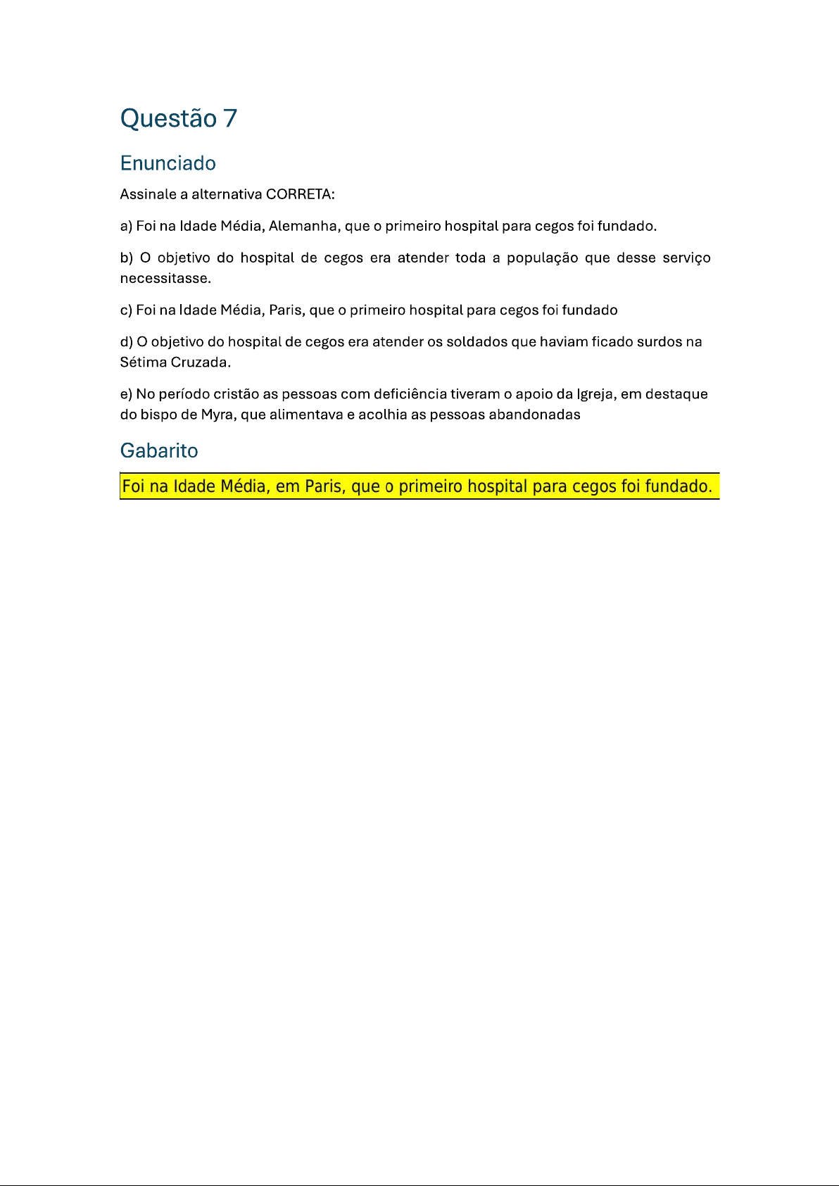 Questão 7 Enunciado Assinale a alternativa CORRETA: a) Foi na Idade Média, Alemanha, que o primeiro hospital para cegos foi fundado. b) O objetivo do hospital de cegos era atender toda a população que desse serviço necessitasse. c) Foi na Idade Média, Paris, que o primeiro hospital para cegos foi fundado d) O objetivo do hospital de cegos era atender os soldados que haviam ficado surdos na Sétima Cruzada. e) No período cristão as pessoas com deficiência tiveram o apoio da Igreja, em destaque do bispo de Myra, que alimentava e acolhia as pessoas abandonadas Gabarito Foi na Idade Média, em Paris, que primeiro hospital para cegos foi fundado.Questão 8 Enunciado Em relação aos dispositivos legais que fizeram parte da história, assinale os que se apresentam de forma consecutiva: a) Constituição Federal, Declaração de Salamanca, Convenção de Guatemala, Plano Nacional de Educação. b) Constituição Federal, Declaração de Salamanca, Convenção de Guatemala, PNEE, Plano Nacional de Educação. c) Declaração de Salamanca, Convenção de Guatemala, PNEE, Plano Nacional de Educação e Política da Inclusão. d) Constituição Federal, Declaração de Salamanca, Convenção de Guatemala, PNEE, Plano Nacional de Educação e Política da Inclusão. e) Constituição Federal, Convenção de Guatemala, PNEE, Plano Nacional de Educação e Política da Inclusão. Gabarito Declaração de Salamanca, Convenção de Guatemala, PNEE, Plano Nacional de Educação e Política da Inclusão.