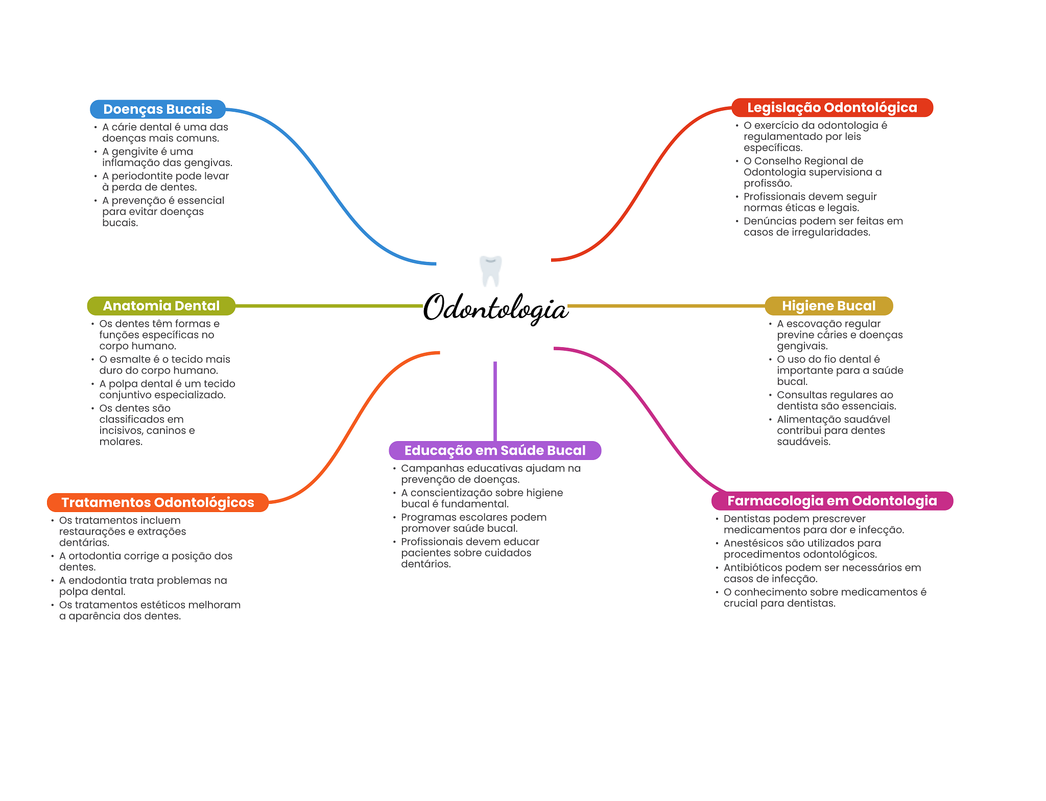 Doenças Bucais Legislação Odontológica A cárie dental é uma das exercício da odontologia é doenças mais comuns. regulamentado por leis A gengivite é uma específicas. inflamação das gengivas. Conselho Regional de A periodontite pode levar Odontologia supervisiona a à perda de dentes. profissão. A prevenção é essencial Profissionais devem seguir para evitar doenças normas éticas e legais. bucais. Denúncias podem ser feitas em casos de irregularidades. Anatomia Dental Odontologia Higiene Bucal Os dentes têm formas e A escovação regular funções específicas no previne cáries e doenças corpo humano. gengivais. esmalte é tecido mais uso do fio dental é duro do corpo humano. importante para a saúde A polpa dental é um tecido bucal. conjuntivo especializado. Consultas regulares ao Os dentes são dentista são essenciais. classificados em Alimentação saudável incisivos, caninos e contribui para dentes molares. saudáveis. Educação em Saúde Bucal Campanhas educativas ajudam na prevenção de doenças. A conscientização sobre higiene Tratamentos Odontológicos bucal é fundamental. Farmacologia em Odontologia Os tratamentos incluem Programas escolares podem Dentistas podem prescrever restaurações e extrações promover saúde bucal. medicamentos para dor e infecção. dentárias. Profissionais devem educar Anestésicos são utilizados para A ortodontia corrige a posição dos pacientes sobre cuidados procedimentos odontológicos. dentes. dentários. Antibióticos podem ser necessários em A endodontia trata problemas na casos de infecção. polpa dental. conhecimento sobre medicamentos é Os tratamentos estéticos melhoram crucial para dentistas. a aparência dos dentes.
