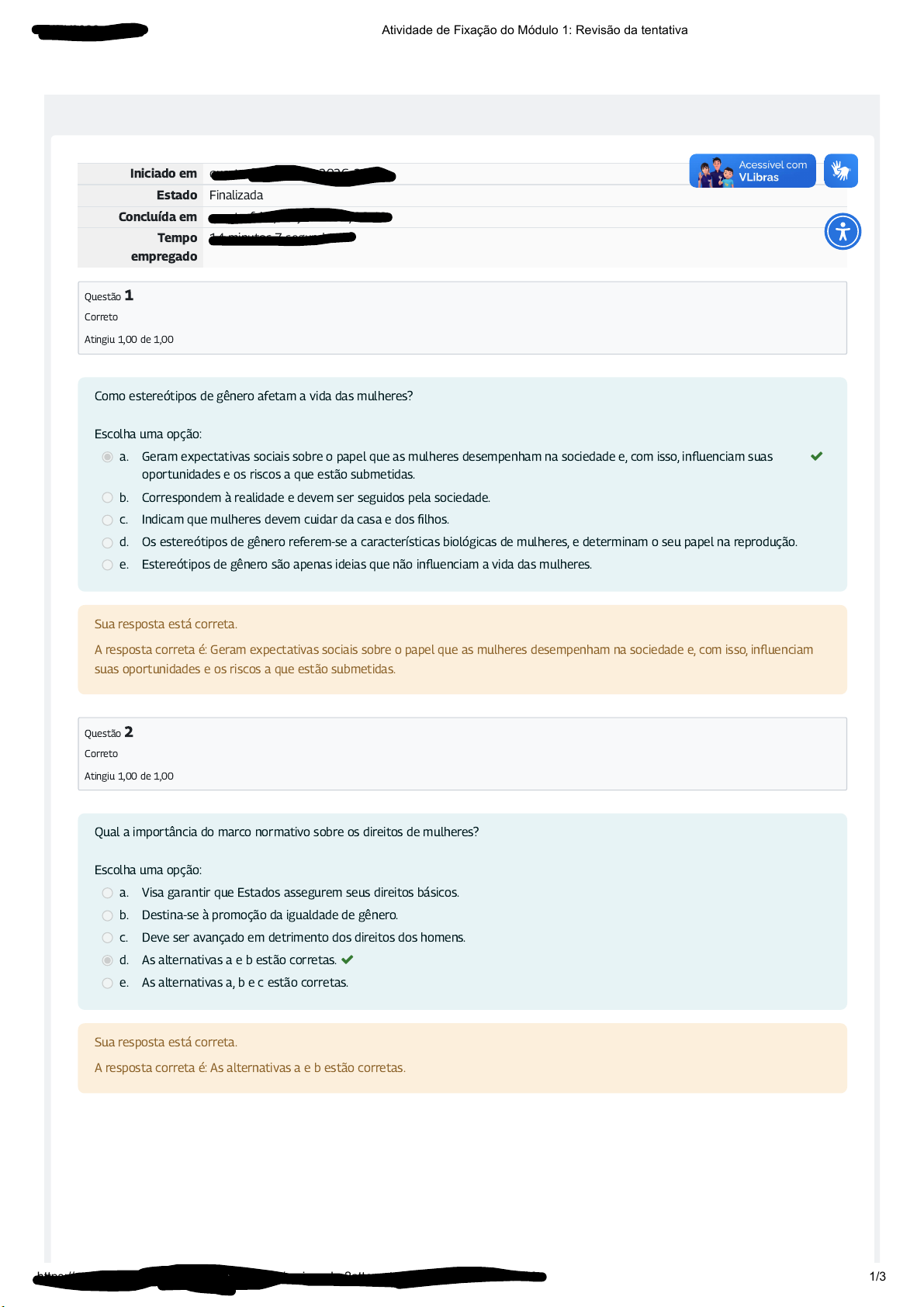 Iniciado em quarta-feira, 28 jan. 2026, 20:31 Estado Finalizada Concluída em quarta-feira, 28 jan. 2026, 20:46 Tempo empregado 14 minutos 7 segundos Questão 1 Correto Atingiu 1,00 de 1,00 Questão 2 Correto Atingiu 1,00 de 1,00 Como estereótipos de gênero afetam a vida das mulheres? Escolha uma opção: a. Geram expectativas sociais sobre o papel que as mulheres desempenham na sociedade e, com isso, influenciam suas oportunidades e os riscos a que estão submetidas. b. Correspondem à realidade e devem ser seguidos pela sociedade. c. Indicam que mulheres devem cuidar da casa e dos filhos. d. Os estereótipos de gênero referem-se a características biológicas de mulheres, e determinam o seu papel na reprodução. e. Estereótipos de gênero são apenas ideias que não influenciam a vida das mulheres. Sua resposta está correta. A resposta correta é: Geram expectativas sociais sobre o papel que as mulheres desempenham na sociedade e, com isso, influenciam suas oportunidades e os riscos a que estão submetidas. Qual a importância do marco normativo sobre os direitos de mulheres? Escolha uma opção: a. Visa garantir que Estados assegurem seus direitos básicos. b. Destina-se à promoção da igualdade de gênero. c. Deve ser avançado em detrimento dos direitos dos homens. d. As alternativas a e b estão corretas. e. As alternativas a, b e c estão corretas. Sua resposta está correta. A resposta correta é: As alternativas a e b estão corretas. 29/01/2026, 16:24 Atividade de Fixação do Módulo 1: Revisão da tentativa https://mooc41.escolavirtual.gov.br/mod/quiz/review.php?attempt=21123469&cmid=336298 1/3 Questão 3 Correto Atingiu 1,00 de 1,00 Questão 4 Correto Atingiu 1,00 de 1,00 Sobre a interseccionalidade, avalie as assertivas abaixo: I. Refere-se às relações de poder intrínsecas geradas por identidades sobrepostas que têm sido tradicionalmente marginalizadas ou negadas, a exemplo da raça e etnia, religião, idade, ruralidade, pessoas portadoras de deficiência, identidade de gênero, orientação sexual., II. Incluir uma abordagem interseccional significa que existe uma consciência sobre as disparidades de poder entre diferentes identidades, que frequentemente se sobrepõem e que ações de superação dessas relações de poder devem levar em consideração cada uma dessas camadas identitárias e os riscos e vulnerabilidades intrínsecos a elas. III. A interseccionalidade refere-se a ideias e expectativas que são convenções sociais, padrões geralmente aceitos sobre comportamentos e capacidades tipicamente femininas ou masculinas. Escolha uma opção: a. A afirmação III está correta. b. As afirmações I e II estão corretas. c. A afirmação I está correta. d. A afirmação II está correta. e. As afirmações II e III estão corretas. Sua resposta está correta. A resposta correta é: As afirmações I e II estão corretas. Qual a importância de entender os papéis de gênero? Escolha uma opção: a. Eles podem nos tornar mais ou menos vulneráveis a certos tipos de violência. b. Todas as alternativas estão corretas. c. Eles influenciam o que as pessoas pensam a nosso respeito. d. Eles geram expectativas sobre como devemos nos comportar. e. Eles podem determinar nossas oportunidades. Sua resposta está correta. A resposta correta é: Todas as alternativas estão corretas. 29/01/2026, 16:24 Atividade de Fixação do Módulo 1: Revisão da tentativa https://mooc41.escolavirtual.gov.br/mod/quiz/review.php?attempt=21123469&cmid=336298 2/3 Questão 5 Correto Atingiu 1,00 de 1,00 Como podemos adotar a agenda de mulheres, paz e segurança no Brasil? Escolha uma opção: a. Incorporando mais mulheres às forças de segurança pública. b. Ampliando a participação de mulheres nas forças armadas. c. Realizando modificações necessárias para que estas mulheres acessem e permaneçam na carreira. d. Observando o impacto desproporcional de dinâmicas criminais em mulheres e meninas. e. Todas as anteriores. Sua resposta está correta. A resposta correta é: Todas as anteriores. 29/01/2026, 16:24 Atividade de Fixação do Módulo 1: Revisão da tentativa https://mooc41.escolavirtual.gov.br/mod/quiz/review.php?attempt=21123469&cmid=336298 3/3