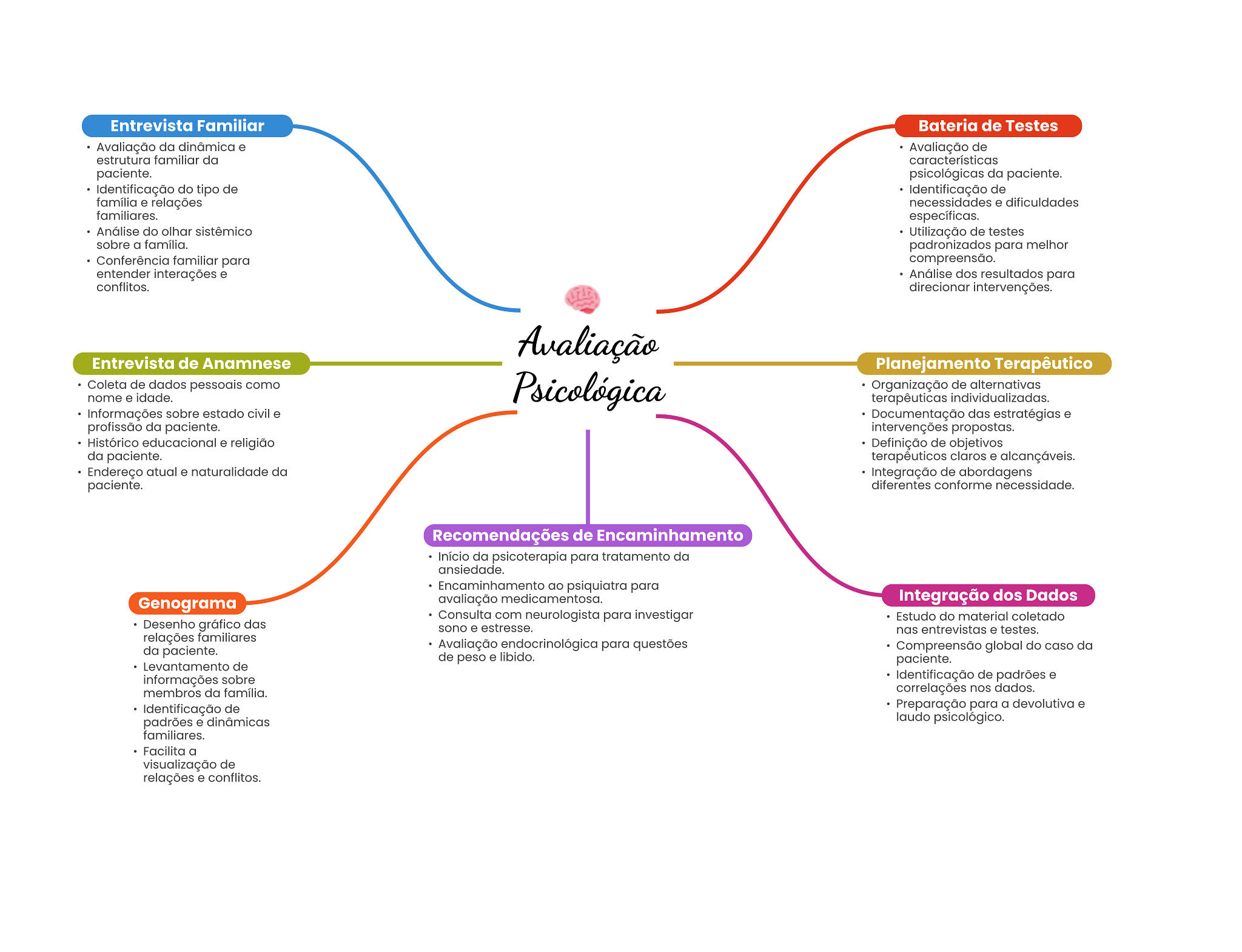 Entrevista Familiar Bateria de Testes Avaliação da dinâmica e Avaliação de estrutura familiar da características paciente. psicológicas da paciente. Identificação do tipo de Identificação de família e relações necessidades e dificuldades familiares. específicas. Análise do olhar sistêmico Utilização de testes sobre a família. padronizados para melhor Conferência familiar para compreensão. entender interações e Análise dos resultados para conflitos. direcionar intervenções. Avaliação Entrevista de Anamnese Planejamento Terapêutico Coleta de dados pessoais como Psicológica Organização de alternativas nome e idade. terapêuticas individualizadas. Informações sobre estado civil e Documentação das estratégias e profissão da paciente. intervenções propostas. Histórico educacional e religião Definição de objetivos da paciente. terapêuticos claros e alcançáveis. Endereço atual e naturalidade da Integração de abordagens paciente. diferentes conforme necessidade. Recomendações de Encaminhamento Início da psicoterapia para tratamento da ansiedade. Encaminhamento ao psiquiatra para Genograma avaliação medicamentosa. Integração dos Dados Consulta com neurologista para investigar Estudo do material coletado Desenho gráfico das sono e estresse. nas entrevistas e testes. relações familiares da paciente. Avaliação endocrinológica para questões Compreensão global do caso da de peso e libido. paciente. Levantamento de informações sobre Identificação de padrões e membros da família. correlações nos dados. Identificação de Preparação para a devolutiva e padrões e dinâmicas laudo psicológico. familiares. Facilita a visualização de relações e conflitos.