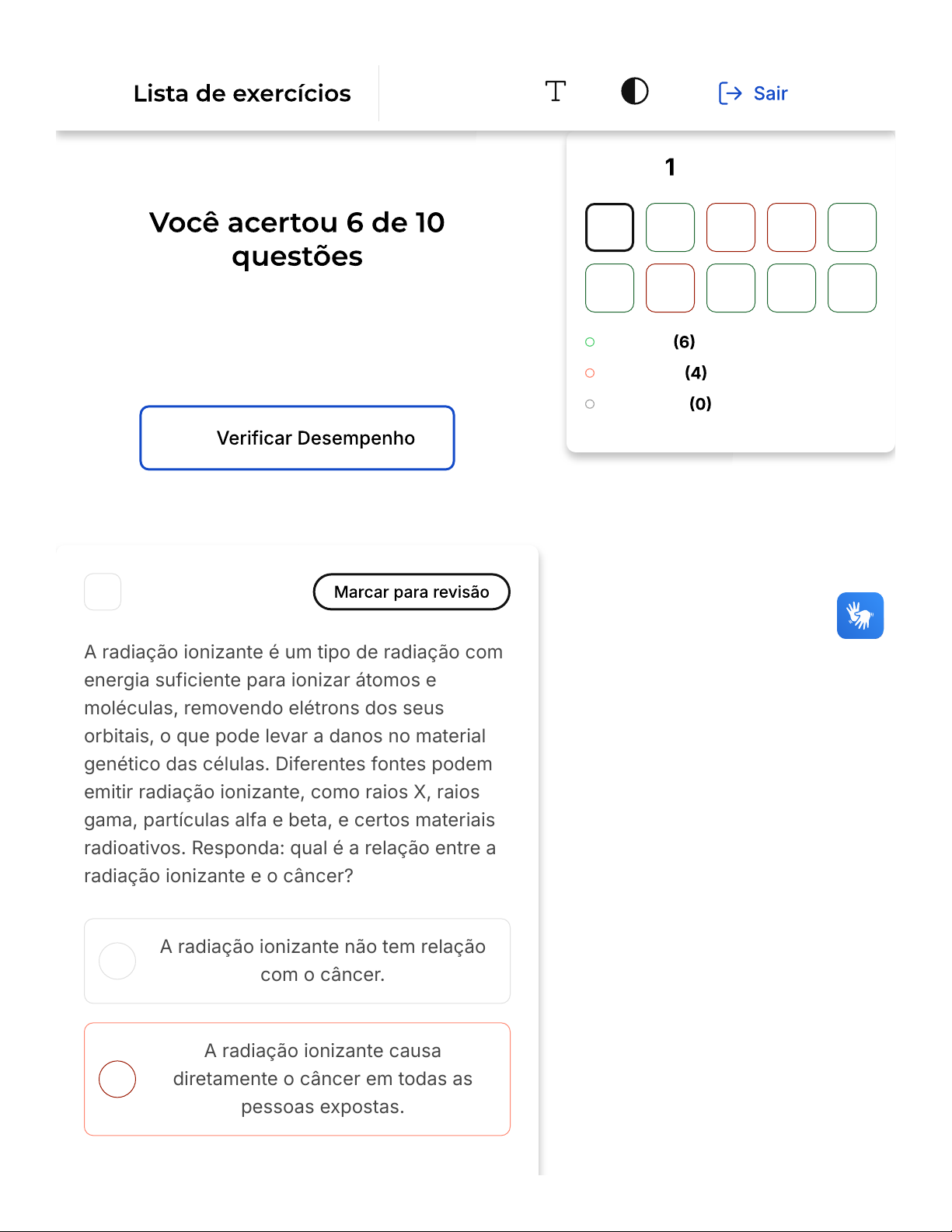 Verifique o seu desempenho e continue treinando! Você pode refazer o exercício quantas vezes quiser. A B 1 A radiação ionizante é um tipo de radiação com energia suficiente para ionizar átomos e moléculas, removendo elétrons dos seus orbitais, o que pode levar a danos no material genético das células. Diferentes fontes podem emitir radiação ionizante, como raios X, raios gama, partículas alfa e beta, e certos materiais radioativos. Responda: qual é a relação entre a radiação ionizante e o câncer? A radiação ionizante não tem relação com o câncer. A radiação ionizante causa diretamente o câncer em todas as pessoas expostas. Questão de 10 Corretas Incorretas Em branco 1 2 3 4 5 6 7 8 9 10 Doenças… Firefox https://estacio.saladeavaliacoes.com.br/exercicio/6977f946fd07623cd0... 1 of 17 26/01/2026, 22:21 C D E A radiação ionizante aumenta o risco de desenvolvimento de câncer. A radiação ionizante é utilizada no tratamento do câncer. A radiação ionizante é apenas perigosa quando aplicada em altas doses. Opa! A alternativa correta é a letra C. Confira o gabarito comentado! Estudos científicos têm demonstrado que a exposição à radiação ionizante está associada a um aumento no risco de desenvolvimento de câncer. Isso ocorre porque a radiação pode causar danos ao DNA das células, levando a mutações genéticas que podem resultar no crescimento descontrolado de células cancerosas. "A radiação ionizante não tem relação com o câncer" está incorreta, pois como mencionado, a radiação ionizante pode aumentar o risco de desenvolvimento de câncer devido à sua capacidade de causar mutações no material genético. "A radiação ionizante causa diretamente o câncer em todas as pessoas expostas" também está incorreta, pois a relação entre a exposição à radiação ionizante e o desenvolvimento de câncer não é uma relação direta e determinística. Ela envolve Firefox https://estacio.saladeavaliacoes.com.br/exercicio/6977f946fd07623cd0... 2 of 17 26/01/2026, 22:21 A B C riscos estocásticos, onde a probabilidade de desenvolver câncer aumenta com a dose de radiação absorvida. "A radiação ionizante é utilizada no tratamento do câncer" é verdadeira, mas não aborda a relação entre a radiação ionizante e o câncer em termos de risco de desenvolvimento. "A radiação ionizante é apenas perigosa quando aplicada em altas doses" pois mesmo exposições a doses relativamente baixas de radiação ionizante podem aumentar o risco de desenvolvimento de câncer ao longo do tempo. 2 O nível sonoro é uma medida utilizada para quantificar a intensidade do som em um determinado ambiente. Ele é expresso por uma unidade de medida relativa à percepção humana do som. Quanto maior o valor, mais intenso é o som. Qual é a unidade de medida utilizada para quantificar o nível sonoro? Watts �W�. Hertz �Hz�. Ampère �A�. Firefox https://estacio.saladeavaliacoes.com.br/exercicio/6977f946fd07623cd0... 3 of 17 26/01/2026, 22:21 D E Pascal �Pa�. Decibel (dB). Parabéns, você selecionou a alternativa correta. Confira o gabarito comentado! O nível sonoro é quantificado utilizando a unidade de medida chamada decibel (dB). O decibel é uma unidade relativa que reflete a percepção humana da intensidade do som. É importante ressaltar que o decibel não mede diretamente a energia sonora, mas sim a relação entre duas grandezas sonoras. Essa relação é calculada utilizando uma escala logarítmica, o que permite representar uma ampla faixa de intensidades sonoras de maneira mais prática e precisa. As demais unidades de medidas não são utilizadas para quantificar o nível sonoro. O watt é a unidade de medida de potência, o hertz é a unidade de medida da frequência, o ampère é a unidade de medida da corrente elétrica, e o pascal é a unidade de medida da pressão. 3 Firefox https://estacio.saladeavaliacoes.com.br/exercicio/6977f946fd07623cd0... 4 of 17 26/01/2026, 22:21 A B C D E A radiação ultravioleta �UV) é uma forma de radiação não ionizante que é emitida pelo sol e por fontes artificiais, como lâmpadas de bronzeamento. A exposição excessiva à radiação UV pode ter efeitos negativos na pele e nos olhos. A radiação UV é classificada em três tipos, com base no comprimento de onda: UV�A, UV�B e UV�C. Marque a alternativa que descreve corretamente a característica da radiação ultravioleta �UV�� UVA - possui comprimento de onda mais longo e é responsável por causar queimaduras solares. UVB - possui comprimento de onda mais curto e é o menos energético dos três tipos de radiação UV. UVA - possui comprimento de onda mais curto e é o mais energético dos três tipos de radiação UV. UVB - possui comprimento de onda médio e é parcialmente absorvido pela camada de ozônio. UVC - possui comprimento de onda mais longo e é o mais preocupante em termos de impacto na saúde humana. Opa! A alternativa correta é a letra A. Confira o gabarito comentado! Firefox https://estacio.saladeavaliacoes.com.br/exercicio/6977f946fd07623cd0... 5 of 17 26/01/2026, 22:21 A B C D O UVA possui o comprimento de onda mais longo entre os tipos de radiação UV e é responsável por danos cumulativos à pele ao longo do tempo, como envelhecimento precoce e rugas. O UVB é mais energético que o UVA e é o principal responsável por causar queimaduras solares e danos ao DNA das células da pele. 4 �Adaptada- IDESG� Prefeitura de Vila Valério - ES /2023� A radiação provoca efeitos deletérios ao organismo, independentemente da quantidade de exposição. Os efeitos biológicos das radiações ionizantes podem ser estocásticos ou determinísticos. Assinale a alternativa que se refere à uma das características dos efeitos estocásticos: O aumento da dose somente aumenta a probabilidade e não a severidade do dano. As alterações são somáticas. Levam à morte celular. Existe uma relação previs