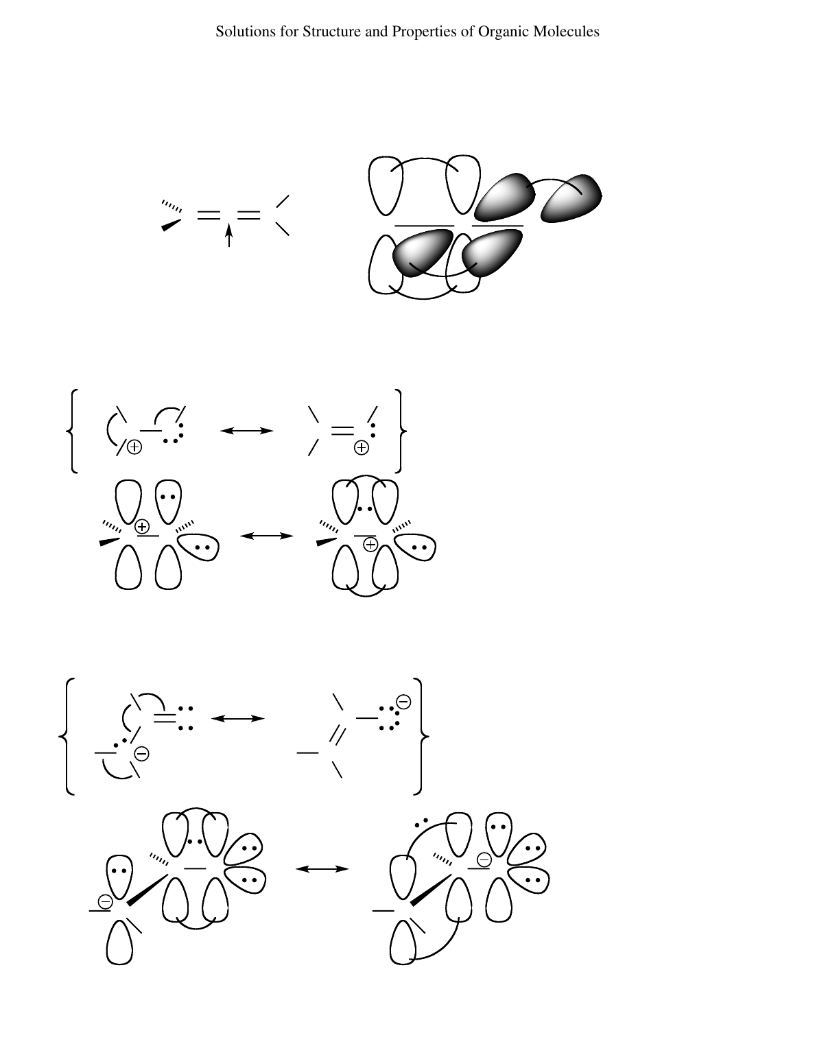 Solutions for Structure and Properties of Organic Molecules 6 Carbon-2 is sp hybridized. If the p orbitals making the pi bond between C-1 and C-2 are in the plane of the paper (putting the hydrogens in front of and behind the paper), then the other p orbital on C-2 must be perpendicular to the plane of the paper, making the pi bond between C-2 and C-3 perpendicular to the paper. This necessarily places the hydrogens on C-3 in the plane of the paper. (Models will surely help.) 1 2 3 sp C C C H H H H C C C model of perpendicular π bonds 7 For clarity, electrons in sigma bonds are not shown. Part (a) has been solved in the text. C O H H H C O H H H C O H H H C O H H H C O C H H H C O C H H H C O H C 120° (b) Carbon and oxygen are both sp2 hybridized. empty p orbital 120° H H sp2 One pair of electrons on oxygen is always in an sp2 orbital. The other pair of electrons is shown in a p orbital in the first resonance form, and in a pi bond in the second resonance form. C O H C (c) Oxygen and both carbons are sp2 hybridized. sp2 120° 120° sp2 sp2 H H sp2 sp2 p p p p pp p 120° (top view) (side view) (top view) (side view) 1 2 3 37