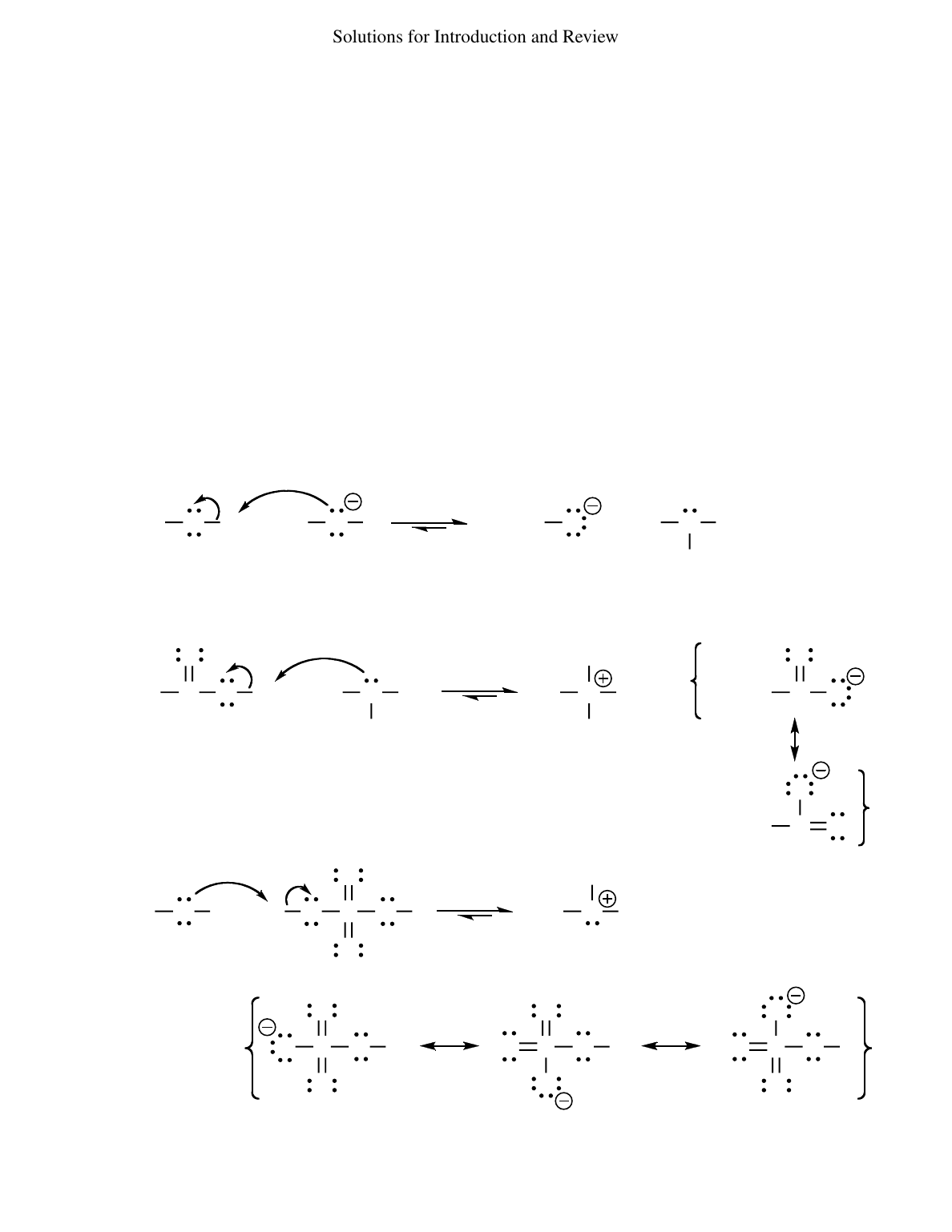 Solutions for Introduction and Review O HCH3CH2 CH3 N H H NCH3 CH3CH3CH2 C O H O CH3CH2 O N CH3CH3 H H N HCH3 H CH3CH2 C O O CH3CH2 C O O 17 In Solved Problem 4, the structure of methylamine is shown to be similar to ammonia. It is reasonable to infer that their acid-base properties are also similar. (a) This problem can be viewed in two ways. 1) Quantitatively, the pKa values determine the order of acidity. 2) Qualitatively, the stabilities of the conjugate bases determine the order of acidity (see Solved Problem 4 for structures): the conjugate base of acetic acid, acetate ion, is resonance- stabilized, so acetic acid is the most acidic; the conjugate base of ethanol has a negative charge on a very electronegative oxygen atom; the conjugate base of methylamine has a negative charge on a mildly electronegative nitrogen atom and is therefore the least stabilized, so methylamine is the least acidic. (The first two pK values are from text Table 5.)a acetic acid > ethanol > methylamine pKa 4.74 pKa 15.9 pKa ≈ 40 (from text Appendix 4) strongest acid weakest acid (b) Ethoxide ion is the conjugate base of ethanol, so it must be a stronger base than ethanol; Solved Problem 4 and text Table 5 indicate ethoxide is analogous to hydroxide in base strength. Methylamine has pKb 3.36. The basicity of methylamine is between the basicity of ethoxide ion and ethanol. ethoxide ion > methylamine > ethanol strongest base weakest base 18 Curved arrows show electron movement, as described in text Section 14. + conjugate base (a) (b) + + + conjugate base conjugate acid conjugate acid stronger acid stronger base weaker base weaker acidequilibrium favors PRODUCTS stronger acid stronger base weaker acid weaker base equilibrium favors PRODUCTS O HCH3 O S SO O O O O OS O O O OO O S O O O H H O HCH3 H H HH (c) conjugate base, weaker base conjugate acidstronger base weaker acid equilibrium favors PRODUCTS stronger acid + + more stable anion— negative charge on the more electronegative atom resonance stabilized resonance stabilized 14