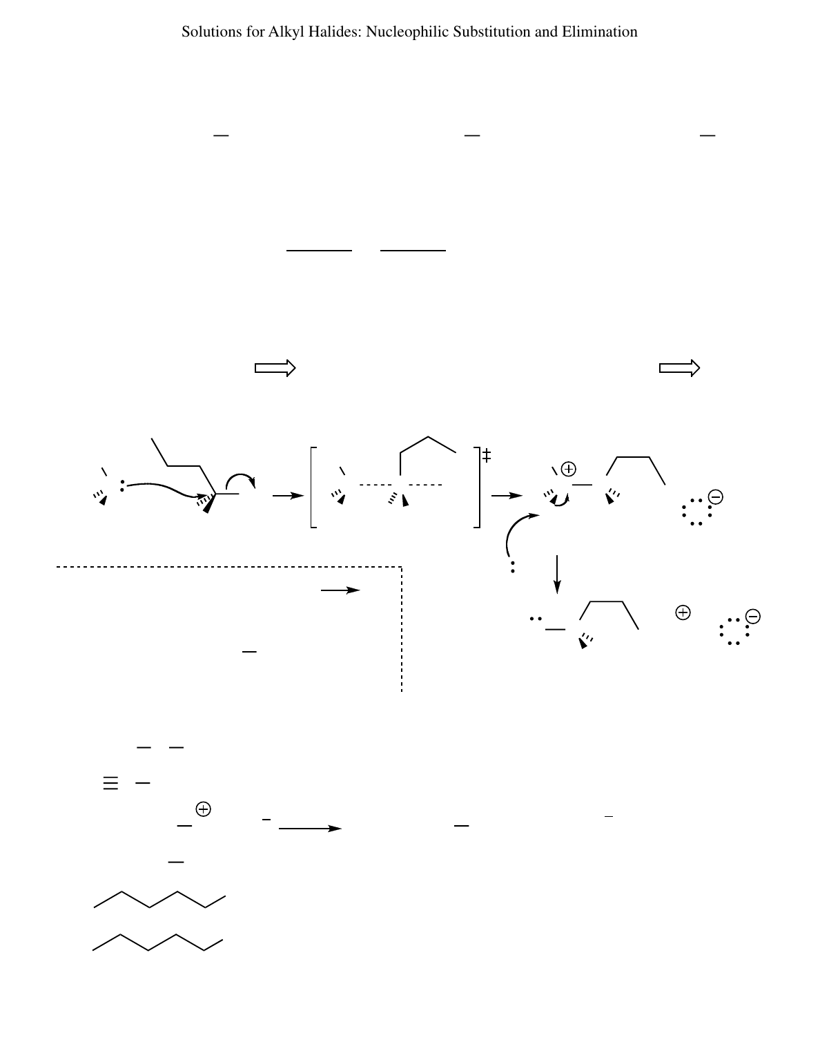 Solutions for Alkyl Halides: Nucleophilic Substitution and Elimination CH3(CH2)4CH2 OHCH3(CH2)4CH2 CNCH3(CH2)4CH2 OCH2CH3 11 (a) Substitution—Br– is the leaving group; CH3O– is the nucleophile. (b) Elimination—when OH is protonated, H2O is the leaving group. (c) Elimination—both Br atoms are lost; iodide ion is a nucleophile that reacts at Br. 12 (a) (b) (c) new rate change in NaOCH3 change in C4H9Br original rate = 0.02 mole/L per secondx ( 1.0 M ) ( 2.0 M ) ( 0.5 M ) ( 0.1 M ) ( 0.05 mole/L per second ) x 13 (a) The rate law is first order in both 1-bromobutane, C4H9Br, and methoxide ion. If the concentration of C4H9Br is lowered to one-fifth the original value, the rate must decrease to one-fifth; if the concentration of methoxide is doubled, the rate must also double. Thus, the rate must decrease to two-fifths of the original rate, 0.02 mole/L per second: rate = A completely different way to answer this problem is to solve for the rate constant k, then put in new values for the concentrations. rate = k [C4H9Br] [NaOCH3] 0.05 mole L–1 sec –1 = k (0.5 mol L–1) (1.0 mol L–1) rate constant k = 0.1 L mol–1 sec–1 rate = k [C4H9Br] [NaOCH3] = (0.1 L mol–1 sec–1) (0.1 mol L–1) (2.0 mol L–1) = 0.02 mole L–1 sec –1 (b) Br H H N H H H nucleophile N H H H C Br H H δ+ δ– electrophile transition state N H H H C H H initial product Br leaving group NH3 base H2N C H H + + NH4 final product Br (c) NaOCH2CH2CH2CH3 + CH3Br CH3CH2CH2CH2O CH3 + NaBr sodium butoxide bromomethane 1-methoxybutane Br(CH3)2CHCH2 NH2 F I NH3Br CH3CH2CH2 CN (CH3)2CHCH2 NH3 HC C CH2CH2CH2CH3 (CH3)3C O CH2CH3 + NH4 + 14 Organic and inorganic products are shown here for completeness. (18-Crown-6 is the catalyst and does not change; CH3CN is the solvent.) + KBr + NaCl (c) (d) + NaCl(e) (f) + KCl (a) (b) + NaI The first NH3 replaces the Br. The second NH3 removes H+ from the N, leaving R-NH2. 116