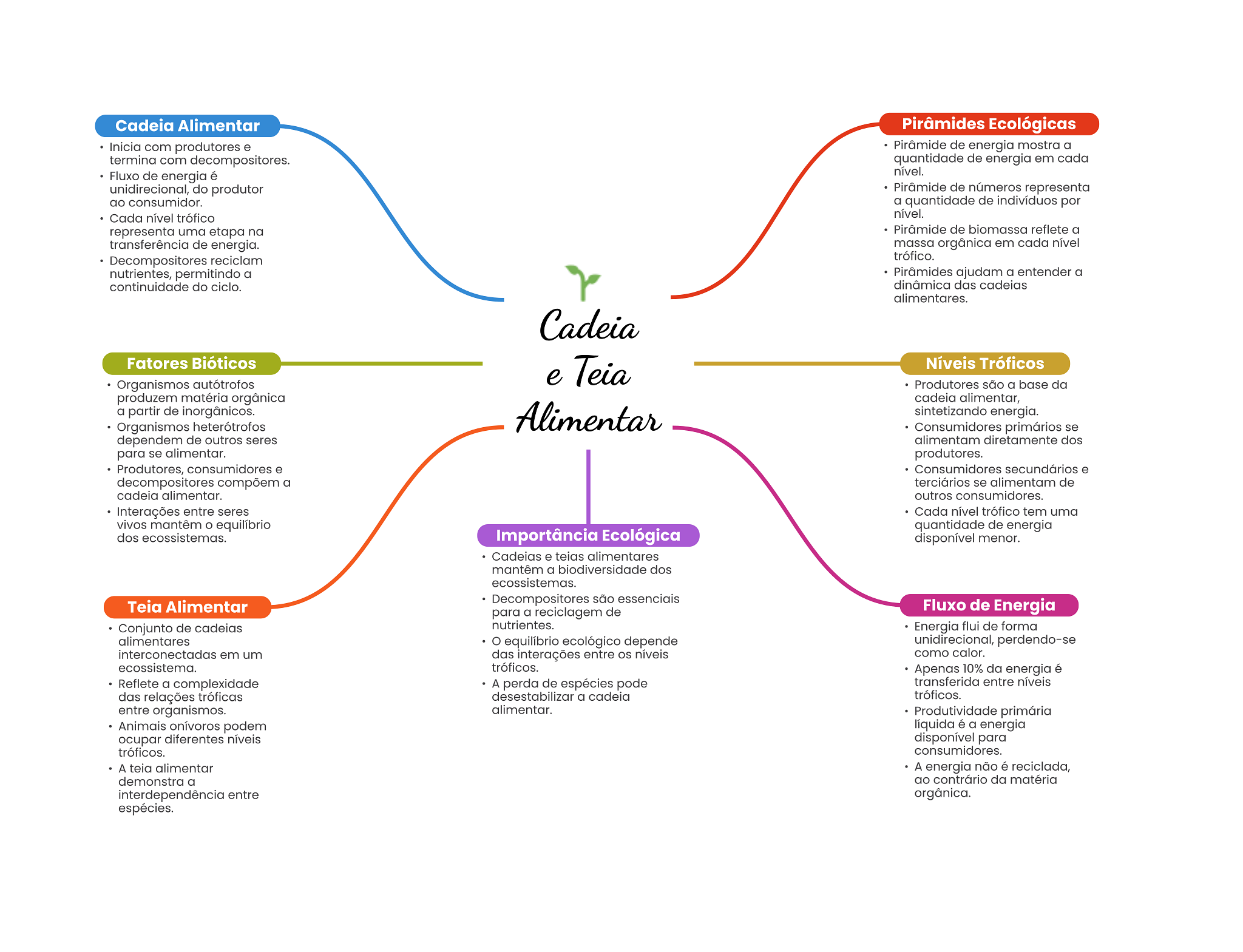 Cadeia Alimentar Pirâmides Ecológicas Inicia com produtores e Pirâmide de energia mostra a termina com decompositores. quantidade de energia em cada Fluxo de energia é nível. unidirecional, do produtor Pirâmide de números representa ao consumidor. a quantidade de indivíduos por Cada nível trófico nível. representa uma etapa na Pirâmide de biomassa reflete a transferência de energia. massa orgânica em cada nível Decompositores reciclam trófico. nutrientes, permitindo a Pirâmides ajudam a entender a continuidade do ciclo. dinâmica das cadeias alimentares. Cadeia Fatores Bióticos e Teia Níveis Tróficos Organismos autótrofos Produtores são a base da produzem matéria orgânica cadeia alimentar, a partir de inorgânicos. Organismos heterótrofos Alimentar sintetizando energia. Consumidores primários se dependem de outros seres alimentam diretamente dos para se alimentar. produtores. Produtores, consumidores e Consumidores secundários e decompositores compõem a terciários se alimentam de cadeia alimentar. outros consumidores. Interações entre seres Cada nível trófico tem uma vivos mantêm equilíbrio quantidade de energia dos ecossistemas. Importância Ecológica disponível menor. Cadeias e teias alimentares mantêm a biodiversidade dos ecossistemas. Teia Alimentar Decompositores são essenciais para a reciclagem de Fluxo de Energia Conjunto de cadeias nutrientes. Energia flui de forma alimentares equilíbrio ecológico depende unidirecional, perdendo-se interconectadas em um das interações entre níveis como calor. ecossistema. tróficos. Apenas 10% da energia é Reflete a complexidade A perda de espécies pode transferida entre níveis das relações tróficas desestabilizar a cadeia tróficos. entre organismos. alimentar. Produtividade primária Animais onívoros podem líquida é a energia ocupar diferentes níveis disponível para tróficos. consumidores. A teia alimentar A energia não é reciclada, demonstra a ao contrário da matéria interdependência entre orgânica. espécies.
