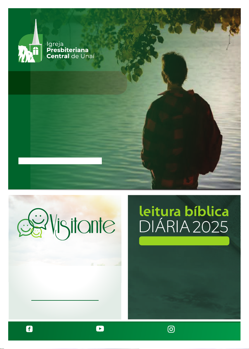 YOUTUBE youtube.com/@ipcunai FACEBOOK facebook.com/ipcunai INSTAGRAM instagram.com/ipcunai você é especial para Deus! "Em todas estas coisas, porém, somos mais que vencedores, por meio daquele que nos amou." (Romanos 8:37) Volte sempre! Você é muito bem-vindo! Boletim Informativo Segunda-feira Terça-feira Quarta-feira Quinta-feira Sexta-feira Sábado Domingo Jeremias 33-36 Jeremias 37-39 Jeremias 40-42 Jeremias 43-46 Jeremias 47-49 Jeremias 50-52 Lamentações 1-5 A INFINITA MISERICÓRDIA DE DEUS SEMANA 04/08 À 10/08 Domingo, Unaí/MG, 03 de agosto de 2025 | Ano LIV PALAVRA PASTORAL: PR. ISAÍAS CÒSTA ARRUDA “... orai uns pelos outros para serdes curados. Muito pode, por sua eficácia, a oração do justo”. (Tg 5.16) 1) Por conversão de vidas a Jesus Cristo; 2) Pelos adolescentes da IP Central; 3) Pelos Enfermos: Miss. Elza (saúde), Rinaldo (saúde); Amanda Bandeira - cunhada do Higo - (em tratamento), Sirlene e família (luto), 4) Pela 9ª Conferência da Fé Reformada - 12 a 14 de setembro; 5) Pelos moradores do bairro Santa Luzia. PEDIDOS DE ORAÇÃO Informe a secretaria da igreja sobre seus pedidos, (38) 3676.2087 Em toda a Escritura Sagrada, livro após livro, é possível ler e compreender sobre Deus e o Seu senhorio. O poder do Senhor fica evidenciado desde a criação do universo, e a cada trecho da bíblico Seus atributos são relatados, assim como a Sua vontade. Esse Deus que é santo, dentre outras coisas, exige do Seu povo obediência , santidade, fidel idade, t e s t e m u n h o , a l é m d e u m a v i d a consagrada em amor a Ele e ao próximo. S e m d ú v i d a , a q u e l e s q u e f o ra m separados por Ele foram chamados para viver no mundo de forma diferente. Acontece que, mesmo aqueles que foram chamados por Deus para ter um relacionamento com Ele, todo ser humano é passível de erro. O pecado contaminou a raça humana e, por essa natureza caída, toda humanidade tende a viver em rebelião contra o Senhor. Mas, apesar de tudo isso, o salmista Davi exaltou o Senhor pela Sua misericórdia para com o Seu povo (Sl. 103:1-2). Davi destacou o perdão de Deus (Sl. 103:3); o poder divino para curar e resgatar os necessitados (Sl. 103:3b-4); relatou a justiça divina e a Sua compaixão (Sl 103:6-13) por um povo miserável e pecador. Evidentemente, somos escolhidos por Deus para sermos santos. O nosso propósito de vida é glorificar a Deus e a nossa alegria deve estar em fazer a Sua vontade. Mas, muitas vezes falhamos nessa missão. Contudo, devemos lembrar que, por meio de Cr isto , recebemos graça e perdão. O Senhor, o Deus que é santo, grande e poderoso, não nos re je i ta para sempre , mesmo conhecendo a nossa estrutura e sabendo que somos pó. Ele não nos trata segundo os nossos pecados (Sl. 103: 10), mas, como Pai, se compadece dos que O temem (Sl. 103:13). Por tudo isso, não podemos nos afastar do Senhor, pensado que para nós não há esperança, pois, apesar de sermos quem somos, o que nos sustenta é a infinita misericórdia de Deus. Que Deus vos abençoe! “Pois Ele conhece a nossa estrutura e sabe que somos pó.” Salmos 103:14 A INFINITA MISERICÓRDIA DE DEUS PALAVRA PASTORAL: PR. ISAÍAS C. ARRUDA. DÍZIMOS E OFERTAS Orientação aos irmãos sobre como dizimar: IGREJA PRESBITERIANA CENTRAL DE UNAÍ CNPJ/CHAVE PIX: 18.649.608/0001-07 SICOOB CREDICOPA Ag. 4033 • C/C 208.155-5 “Trazei todos os dízimos à casa do tesouro, para que haja mantimento na minha casa; e provai-me nisto, diz o Senhor dos Exércitos, se eu não vos abrir as janelas do céu e não derramar sobre vós bênção sem medidas.” Malaquias 3:10 MANHÃ NOITE LITURGIAS felizAniversário “Ensina-nos a contar os nossos dias, para que alcancemos coração sábio.” Salmo 90.12 ACOLHIDA E ADORAÇÃO Saudação e Oração Leitura Bíblica LOUVOR E GRATIDÃO Cânticos Dízimos e ofertas MOMENTO DE EDIFICAÇÃO Pastoral Presb. Robson ACOLHIDA E ADORAÇÃO Prelúdio – Saudação e Oração Leitura bíblica Oração CONTRIÇÃO Leitura bíblica Oração LOUVOR E GRATIDÃO Cânticos Dízimos e ofertas Avisos Oração pelas crianças MOMENTO DE EDIFICAÇÃO Mensagem: Pr.Isaías Santa Ceia DESPEDIDA Oração pelas famílias Benção apostólica 04/08 - Segunda-feira Betânia Xavier Santana - 31-99950-4864 Sede 05/08 - Terça-feira Lorenna Mayara R. S. Oliveira - 98828-1866 Sede 07/08 - Quinta-feira Egeu Reis Porfírio - 99932-2539 Sede Douglas Fonseca Rodrigues - 99831-0779 Sede 08/08 - Sexta-feira Esmeralda Lico Gomes Ferreira - 99948-1886 Sede Felipe Cnossen Lima - 98822-2094 Sede 10/08 - Domingo Jadir Henrique Campos - 98831-3548 Sede @icarruda8598(38) 99731-7842 pr.isaiasarruda@gmail.com Apoio Rev. Isaías Costa Arruda Escalas dos cultos LIDERANÇA Igreja Sede: Rua Celiba Lisboa Frederico, 229 Centro - CEP 38.610-041 - Unaí/MG Congregação Bairro Mamoeiro: Rua Elson Gabriel de Paulo, 140 Bairro Mamoeiro. Horários de Cultos Estudo Bíblico /Oração: Quarta-feira - 19h30 Escola Bíblica: Domingo - 9h Culto Solene: Domingo19h30 Acompanhe outras atividades da igreja com as sociedades internas (UCP, UPA, UMP, UPH, SAF). Conselho: Rev. Isaías Costa Arruda - (38) 99731-7842 Presb. - (38) Clebeíson Ap. de Araújo 99860-5733 Presb. Gabriel J. Simão - (38) 99827-1313 Presb. Marcos Paulo - (38) 99951-5929 Presb. Robson R. Ferreira - (38) 99724-9910 Presb. Valter Horácio - (38) 99971-5269 Presbítero Emérito: Presb. Ivânio F. Lima - (38) 99961-1388 José Reinaldo Parreira - (38) 99244-2431 Natanael Bruno - (38) 98825-2271 Odair da Silva Marra - (38) 99959-2104 Robson Antônio Cota Fontana - (38) 99931-6448 Ronan A. Castro - (38) 99826-4785 Willian Martins - (38) 99941-5118 Congregação Mamoeiro Fausto José Rocha - (38) 99868-2677 Junta Diaconal: Sede Abedias C. Costa - (38) 99948-2592 Antônio Dias Filho - (38) 99750-9742 Armando Gaia - (38) 99961-9868 Carlos Prates - (38) 99953-7884 Cleiton Correa Silva - (38) 99950-0611 WHATSAPP SECRETÁRIO (38) 3676.2087 MATHEUS B. (38)