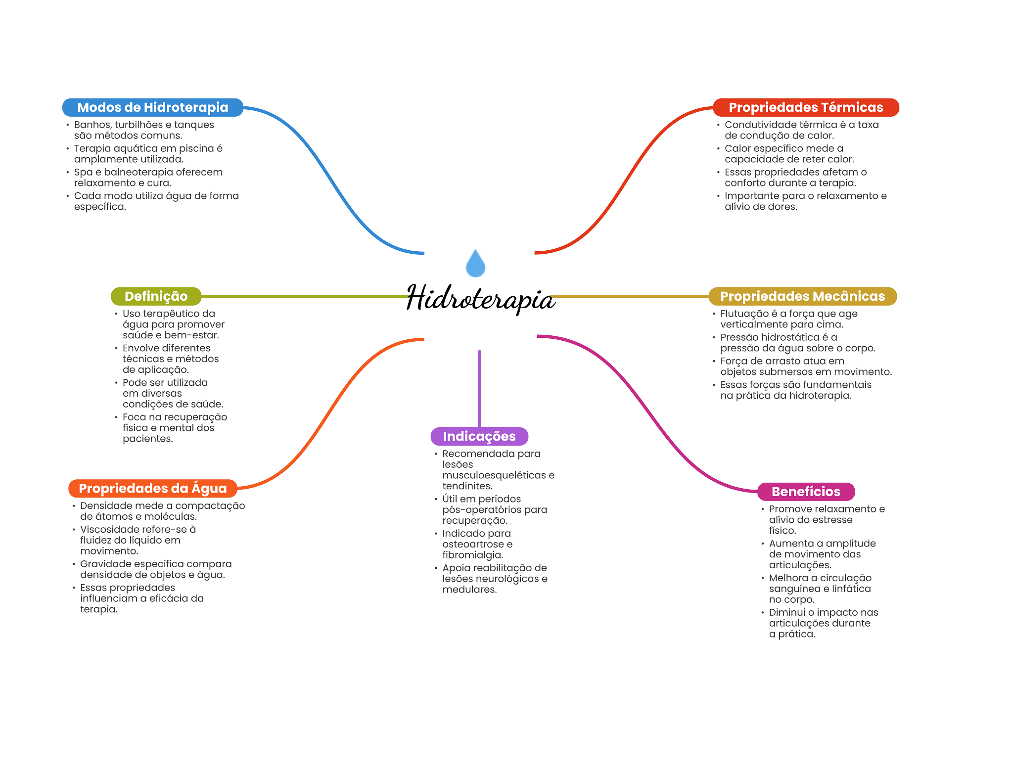 Modos de Hidroterapia Propriedades Térmicas Banhos, turbilhões e tanques Condutividade térmica é a taxa são métodos comuns. de condução de calor. Terapia aquática em piscina é Calor específico mede a amplamente utilizada. capacidade de reter calor. Spa e balneoterapia oferecem Essas propriedades afetam O relaxamento e cura. conforto durante a terapia. Cada modo utiliza água de forma Importante para O relaxamento e específica. alívio de dores. Definição Hidroterapia Propriedades Mecânicas Uso terapêutico da Flutuação é a força que age água para promover verticalmente para cima. saúde e bem-estar. Pressão hidrostática é a Envolve diferentes pressão da água sobre corpo. técnicas e métodos Força de arrasto atua em de aplicação. objetos submersos em movimento. Pode ser utilizada Essas forças são fundamentais em diversas na prática da hidroterapia. condições de saúde. Foca na recuperação física e mental dos pacientes. Indicações Recomendada para lesões musculoesqueléticas e Propriedades da Água tendinites. Benefícios Útil em períodos Densidade mede a compactação pós-operatórios para Promove relaxamento e de átomos e moléculas. recuperação. alívio do estresse Viscosidade refere-se à Indicado para físico. fluidez do líquido em osteoartrose e Aumenta a amplitude movimento. fibromialgia. de movimento das Gravidade específica compara Apoia reabilitação de articulações. densidade de objetos e água. lesões neurológicas e Melhora a circulação Essas propriedades medulares. sanguínea e linfática influenciam a eficácia da no corpo. terapia. Diminui impacto nas articulações durante a prática.