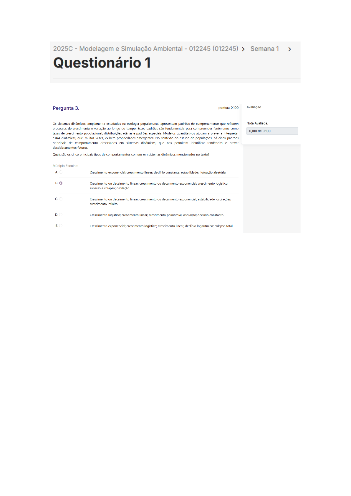 2025C Modelagem e Simulação Ambiental 012245 (012245) > Semana 1 > Pergunta 3. pontos: 0,100 Avaliação Os sistemas dinâmicos, amplamente estudados na ecologia populacional, apresentam padrões de comportamento que refletem Nota Avaliada: processos de crescimento e variação ao longo do tempo. Esses padrões são fundamentais para compreender fenômenos como 0,100 de 0,100 taxas de crescimento populacional, distribuições etárias e padrões espaciais. Modelos quantitativos ajudam a prever e interpretar essas dinâmicas, que, muitas vezes, exibem propriedades emergentes. No contexto do estudo de populações, há cinco padrões principais de comportamento observados em sistemas dinâmicos, que nos permitem identificar tendências e prever desdobramentos futuros. Quais são os cinco principais tipos de comportamentos comuns em sistemas dinâmicos mencionados no texto? Múltipla Escolha: Crescimento exponencial; crescimento linear; declínio constante; estabilidade; flutuação aleatória. Crescimento ou decaimento linear; crescimento ou decaimento exponencial; crescimento logístico; excesso e colapso; oscilação. C. Crescimento ou decaimento linear; crescimento ou decaimento exponencial; estabilidade; oscilações; crescimento infinito. D. Crescimento logístico; crescimento linear; crescimento polinomial; oscilação; declínio constante. E. Crescimento exponencial; crescimento logístico; crescimento linear; declínio logarítmico; colapso total.
