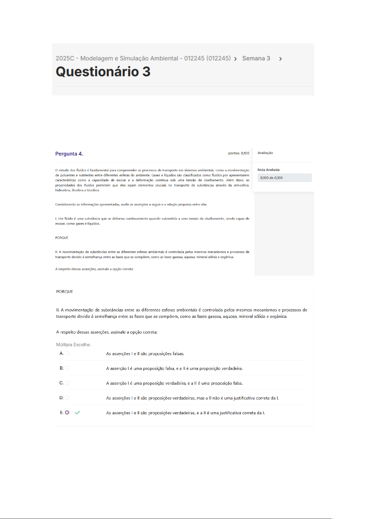 2025C Modelagem e Simulação Ambiental 012245 (012245) > Semana 3 > Questionário 3 Pergunta 4. pontos: 0,100 Avaliação estudo dos fluidos é fundamental para compreender os processos de transporte em sistemas ambientais, como a movimentação Nota Avaliada: de poluentes e nutrientes entre diferentes esferas do ambiente. Gases e líquidos são classificados como fluidos por apresentarem 0,100 de 0,100 características como a capacidade de escoar e a deformação contínua sob uma tensão de cisalhamento. Além disso, as propriedades dos fluidos permitem que eles sejam elementos cruciais no transporte de substâncias através da atmosfera, hidrosfera, litosfera e biosfera. Considerando as informações apresentadas, avalie as asserções a seguir e a relação proposta entre elas. I. Um fluido é uma substância que se deforma continuamente quando submetida a uma tensão de cisalhamento, sendo capaz de escoar, como gases e líquidos. PORQUE II. A movimentação de substâncias entre as diferentes esferas ambientais é controlada pelos mesmos mecanismos e processos de transporte devido à semelhança entre as fases que as compõem, como as fases gasosa, aquosa, mineral sólida e orgânica. A respeito dessas asserções, assinale a opção correta: PORQUE II. A movimentação de substâncias entre as diferentes esferas ambientais é controlada pelos mesmos mecanismos e processos de transporte devido à semelhança entre as fases que as compõem, como as fases gasosa, aquosa, mineral sólida e orgânica. A respeito dessas asserções, assinale a opção correta: Múltipla Escolha: A. As asserções e são proposições falsas. B. A asserção é uma proposição falsa, e a é uma proposição verdadeira. C. A asserção é uma proposição verdadeira, e a é uma proposição falsa. D. As asserções e são proposições verdadeiras, mas a não é uma justificativa correta da I. E. As asserções e são proposições verdadeiras, e a é uma justificativa correta da I.