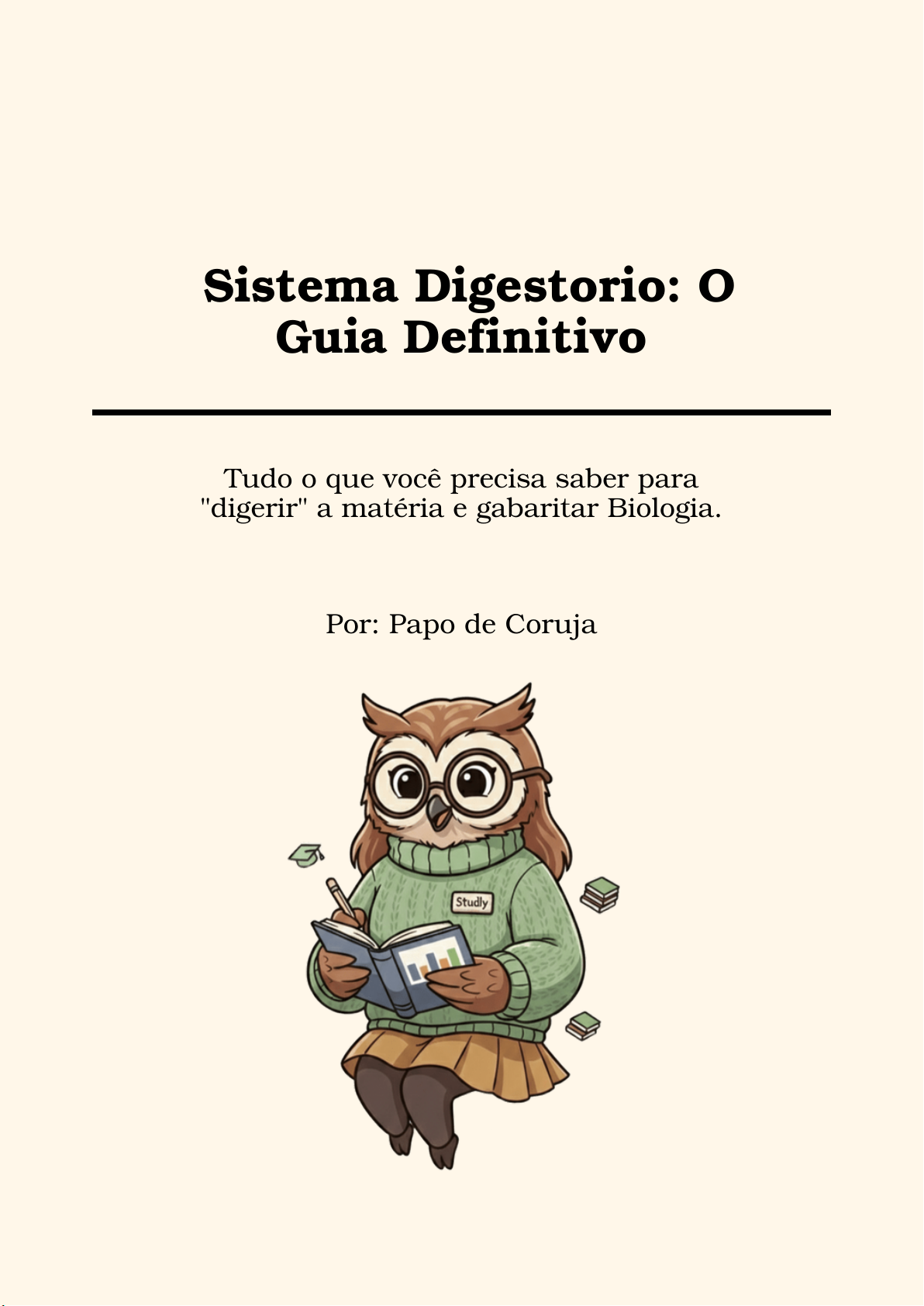 Sistema Digestorio: O Guia Definitivo Por: Papo de Coruja Tudo o que você precisa saber para "digerir" a matéria e gabaritar Biologia. Dica da Studly Ei, psiu! Mastigue bem! Quanto mais você tritura na boca, menos trabalho dá para o resto do time. Suas células agradecem! Esôfago: Tubo muscular que conduz o bolo alimentar até o estômago através de ondas peristálticas. A Jornada começa: Boca e Esofago Função do Sistema: Captar, processar e absorver nutrientes e eletrólitos necessários para a sobrevivência das células. Digestão Mecânica vs. Química: Mecânica: Mastigação e trituração pelos dentes. Química: Ação da enzima ptialina (amilase salivar) que inicia a quebra do amido em pH neutro. Deglutição: Ocorre em 3 fases (oral, faríngea e esofágica). Destino: O alimento chega ao estômago para ser transformado em Quimo. Você sabia que o estômago de um adulto pode se expandir para guardar até 1,5 litros de comida? É quase uma garrafa de refrigerante grande! Suco Gastrico: Composto por Ácido Clorídrico (HCl), que mantém o pH baixo (ácido) para matar bactérias e ativar enzimas. O Caldeirão: Estomago Localização: O estômago é uma dilatação do canal alimentar que funciona como um reservatório, transformando o bolo alimentar em Quimo. Enzima Estrela: A principal enzima aqui é a Pepsina (que vem do pepsinogênio), ela quebra proteínas em pedaços menores (peptídeos). Proteção: A mucosa gástrica é coberta por muco para não ser "comida" pelo próprio ácido e pela pepsina. Pepsina: A enzima que "quebra tudo" quando o assunto é proteína. Ela só trabalha em ambiente ácido (pH baixo)! Você sabia? Fígado e Vesícula: Produzem e armazenam a Bile. Ela não tem enzimas, mas funciona como um "detergente" para as gorduras (emulsificação). Intestino Grosso: Foca na absorção de água e eletrólitos. É onde o quimo vira o bolo fecal. Também abriga nossa microbiota (bactérias do bem!). A hora da Absorção: Intestinos Intestino Delgado: É aqui que a mágica acontece! Dividido em Duodeno, Jejuno e Íleo. É o principal local de digestão e absorção de nutrientes. Suas paredes possuem Vilosidades, que aumentam a área de contato com o alimento. Pâncreas: Lança o Suco Pancreático, rico em enzimas e bicarbonato (para neutralizar a acidez do quimo). Duodeno (Digestão pesada) Jejuno (Absorção intensa). Íleo (Fim da absorção). "Escada dos Nutrientes": Referencias Gostou desse resumo? Siga o Papo da Coruja para mais conteúdos TEIXEIRA-SILVA, F.; BONJARDIM, L. R. Fisiologia Básica: Sistema Digestório. Aula 7. São Cristóvão: Universidade Federal de Sergipe (UFS) / CESAD. Disponível no material didático do curso de Fisiologia.
