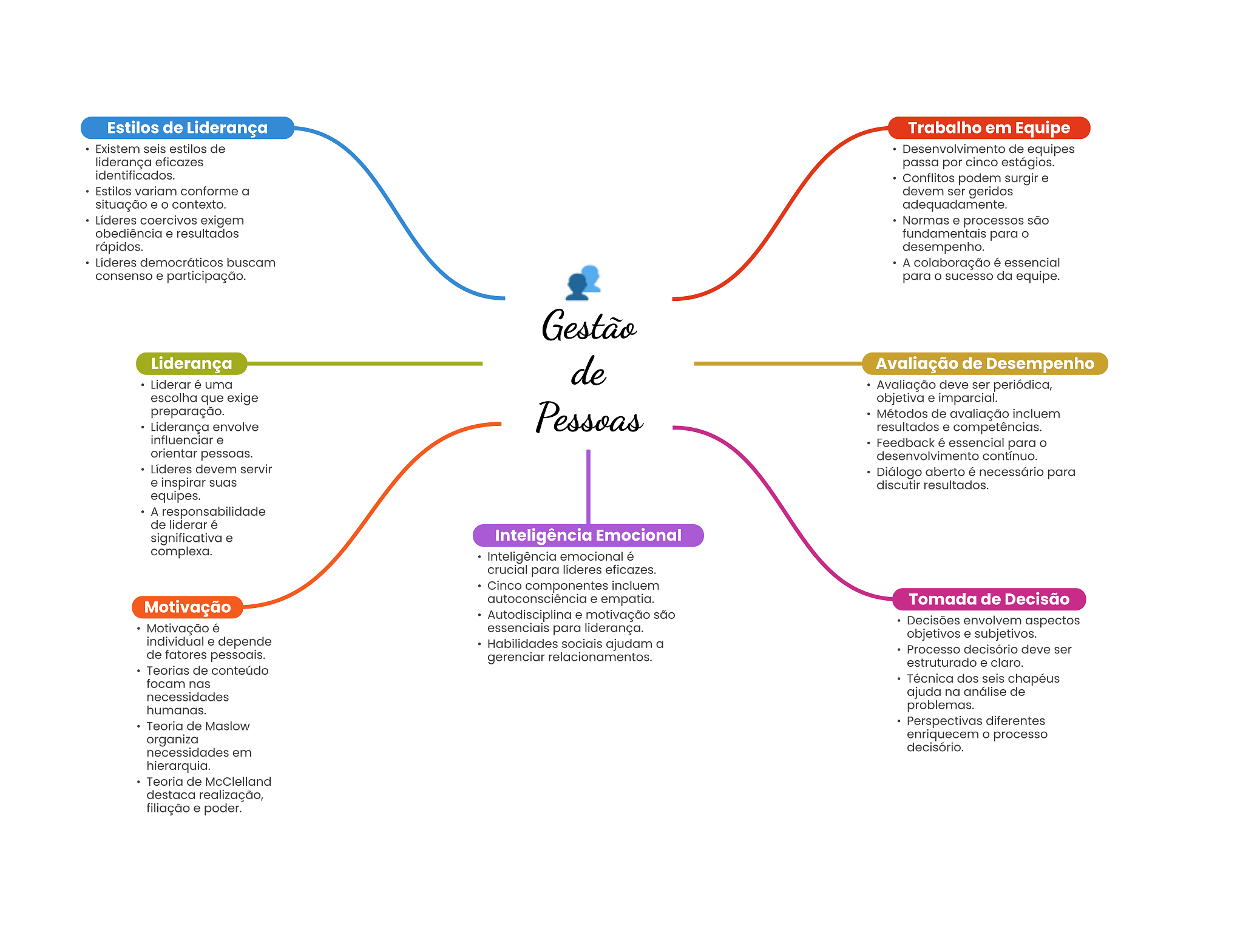 Estilos de Liderança Trabalho em Equipe Existem seis estilos de de equipes liderança eficazes passa por cinco estágios. identificados. Conflitos podem surgir e Estilos variam conforme a devem ser geridos situação e contexto. adequadamente. Líderes coercivos exigem Normas e processos são obediência e resultados fundamentais para rápidos. desempenho. Líderes democráticos buscam A colaboração é essencial consenso e participação. para sucesso da equipe. Gestão Liderança de Avaliação de Desempenho Liderar é uma Avaliação deve ser periódica, escolha que exige objetiva e imparcial. preparação. Liderança envolve Pessoas Métodos de avaliação incluem resultados e competências. influenciar e Feedback é essencial para orientar pessoas. desenvolvimento contínuo. Líderes devem servir Diálogo aberto é necessário para e inspirar suas discutir resultados. equipes. A responsabilidade de liderar é significativa e Inteligência Emocional complexa. Inteligência emocional é crucial para líderes eficazes. Cinco componentes incluem autoconsciência e empatia. Tomada de Decisão Motivação Autodisciplina e motivação são Decisões envolvem aspectos Motivação é essenciais para liderança. objetivos e subjetivos. individual e depende Habilidades sociais ajudam a Processo decisório deve ser de fatores pessoais. gerenciar relacionamentos. estruturado e claro. Teorias de conteúdo focam nas Técnica dos seis chapéus necessidades ajuda na análise de humanas. problemas. Teoria de Maslow Perspectivas diferentes organiza enriquecem O processo necessidades em decisório. hierarquia. Teoria de McClelland destaca realização, filiação e poder.