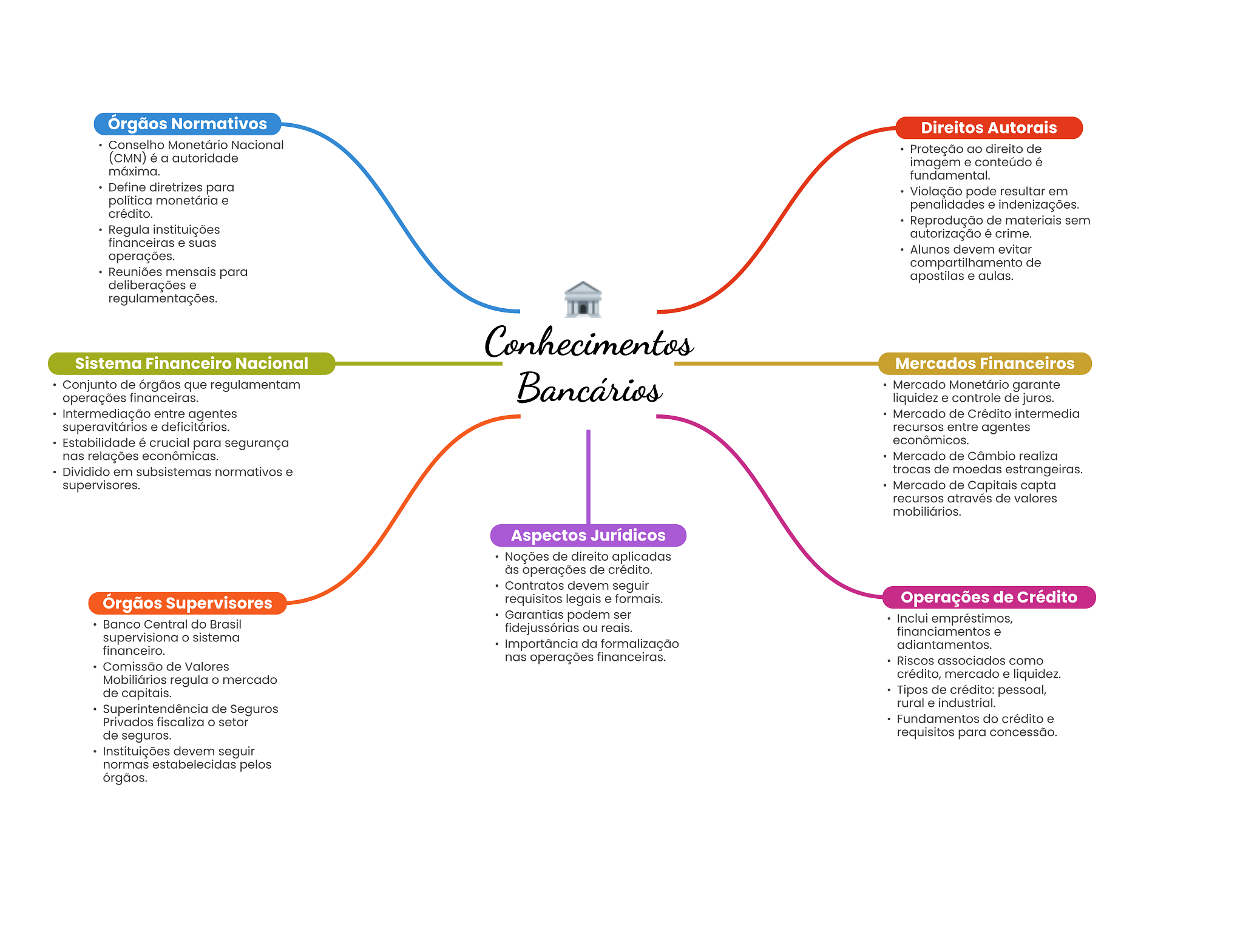 Órgãos Normativos Direitos Autorais Conselho Monetário Nacional Proteção ao direito de (CMN) é a autoridade imagem e conteúdo é máxima. fundamental. Define diretrizes para Violação pode resultar em política monetária e penalidades e indenizações. crédito. Reprodução de materiais sem Regula instituições autorização é crime. financeiras e suas Alunos devem evitar operações. compartilhamento de Reuniões mensais para apostilas e aulas. deliberações e regulamentações. Conhecimentos Sistema Financeiro Nacional Mercados Financeiros Conjunto de órgãos que regulamentam Bancários Mercado Monetário garante operações financeiras. liquidez e controle de juros. Intermediação entre agentes Mercado de Crédito intermedia superavitários e deficitários. recursos entre agentes Estabilidade é crucial para segurança econômicos. nas relações econômicas. Mercado de Câmbio realiza Dividido em subsistemas normativos e trocas de moedas estrangeiras. supervisores. Mercado de Capitais capta recursos através de valores mobiliários. Aspectos Jurídicos Noções de direito aplicadas às operações de crédito. Contratos devem seguir Órgãos Supervisores requisitos legais e formais. Operações de Crédito Garantias podem ser Banco Central do Brasil Inclui empréstimos, fidejussórias ou reais. financiamentos e supervisiona sistema financeiro. Importância da formalização adiantamentos. nas operações financeiras. Riscos associados como Comissão de Valores Mobiliários regula O mercado crédito, mercado e liquidez. de capitais. Tipos de crédito: pessoal, rural e industrial. Superintendência de Seguros Privados fiscaliza setor Fundamentos do crédito e de seguros. requisitos para concessão. Instituições devem seguir normas estabelecidas pelos órgãos.