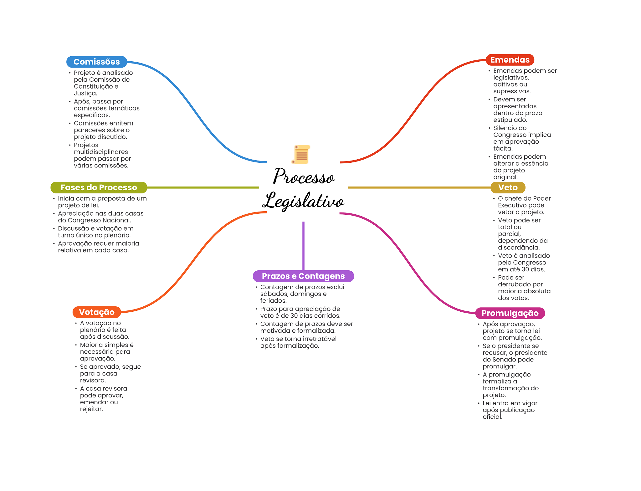 Comissões Emendas Projeto é analisado Emendas podem ser pela Comissão de legislativas, Constituição e aditivas ou Justiça. supressivas. Após, passa por Devem ser comissões temáticas apresentadas específicas. dentro do prazo Comissões emitem estipulado. pareceres sobre Silêncio do projeto discutido. Congresso implica Projetos em aprovação tácita. multidisciplinares podem passar por Emendas podem várias comissões. alterar a essência Processo do projeto original. Fases do Processo Veto Inicia com a proposta de um projeto de lei. Legislativo chefe do Poder Executivo pode Apreciação nas duas casas vetar projeto. do Congresso Nacional. Veto pode ser Discussão e votação em total ou turno único no plenário. parcial, Aprovação requer maioria dependendo da relativa em cada casa. discordância. Veto é analisado pelo Congresso em até 30 dias. Prazos e Contagens Pode ser Contagem de prazos exclui derrubado por sábados, domingos e maioria absoluta feriados. dos votos. Votação Prazo para apreciação de veto é de 30 dias corridos. Promulgação A votação no Contagem de prazos deve ser Após aprovação, plenário é feita motivada e formalizada. projeto se torna lei após discussão. Veto se torna irretratável com promulgação. Maioria simples é após formalização. Se o presidente se necessária para recusar, presidente aprovação. do Senado pode Se aprovado, segue promulgar. para a casa A promulgação revisora. formaliza a A casa revisora transformação do pode aprovar, projeto. emendar ou Lei entra em vigor rejeitar. após publicação oficial.