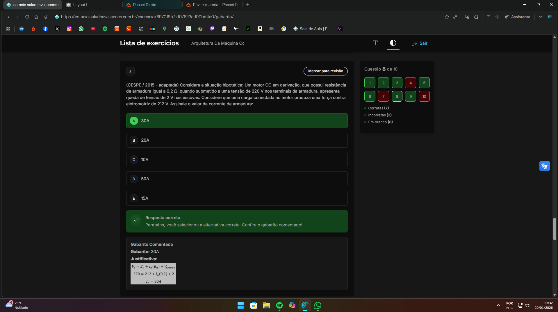 estacio.saladeavaliacoes Layout1 Passei Direto Enviar material Passei + X https://estacio.saladeavaliacoes.com.br/exercicio/69701857fd07623cd00bd4e0/gabarito/ Assistente X > a Sala de Aula Lista de exercícios Arquitetura Da Máquina Cc T Sair Questão 8 de 10 8 Marcar para revisão (CESPE / 2015 adaptada) Considere a situação hipotética: Um motor CC em derivação, que possui resistência 1 2 3 4 5 de armadura igual a Ω, quando submetido a uma tensão de 220 V nos terminais da armadura, apresenta queda de tensão de 2V nas escovas. Considere que uma carga conectada ao motor produza uma força contra 6 7 8 9 10 eletromotriz de 212 V. Assinale valor da corrente de armadura: Corretas (7) Incorretas (3) A 30A Em branco 20A 10A D 50A E 15A Resposta correta Parabéns, você selecionou a alternativa correta. Confira gabarito comentado! Gabarito Comentado Gabarito: 30A Justificativa: = Ea + + Vescova 220 = 212 + + 2 30A 25°C POR 21:32 Nublado PTB2 20/01/2026