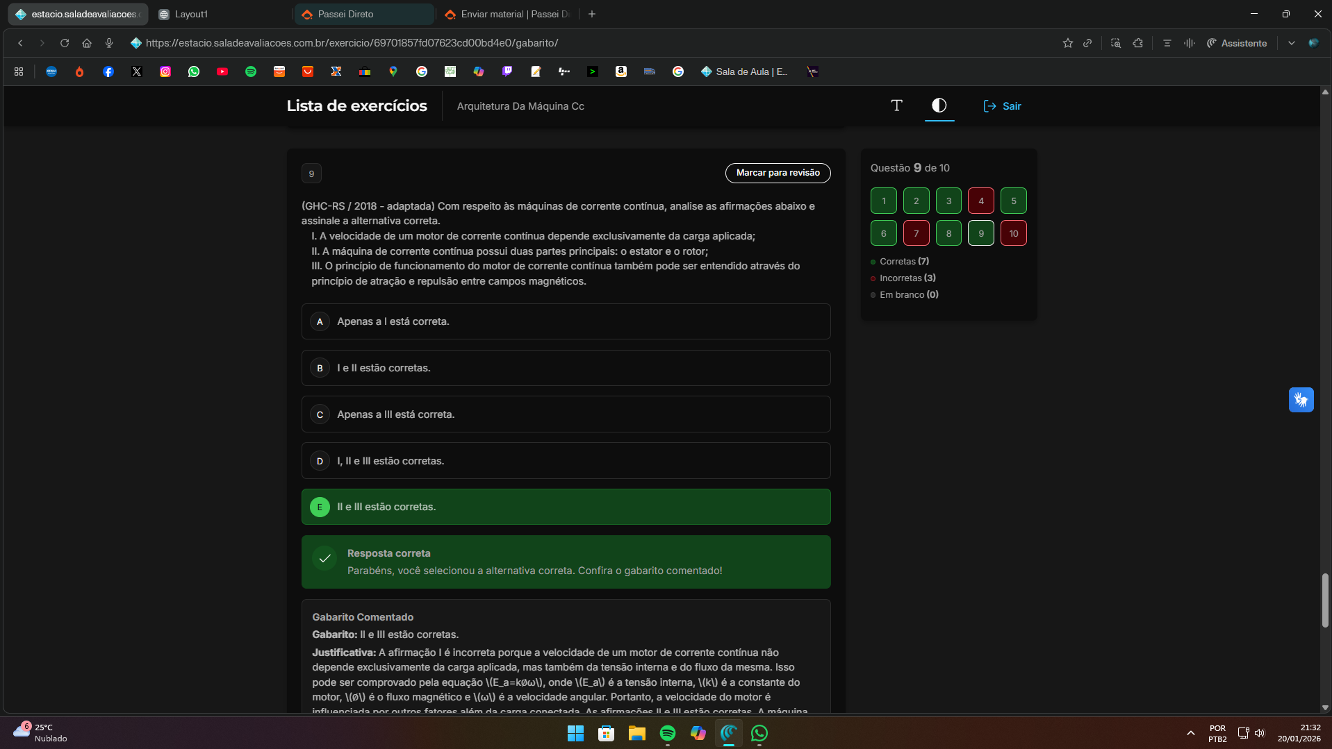 estacio.saladeavaliacoes Layout1 Passei Direto Enviar material Passei + > Assistente X > a Sala de Aula Lista de exercícios Arquitetura Da Máquina Cc T Sair Questão 9 de 10 9 Marcar para revisão 1 2 3 4 5 (GHC-RS / 2018 adaptada) Com respeito às máquinas de corrente contínua, analise as afirmações abaixo e assinale a alternativa correta. I. A velocidade de um motor de corrente contínua depende exclusivamente da carga aplicada; 6 7 8 9 10 II. A máquina de corrente contínua possui duas partes principais: estator e rotor; III. princípio de funcionamento do motor de corrente também pode ser entendido através do Corretas (7) princípio de atração e repulsão entre campos magnéticos. Incorretas (3) Em branco A Apenas a está correta. B I e II estão corretas. Apenas a III está correta. D I, II e III estão corretas. E e III estão corretas. Resposta correta Parabéns, você selecionou a alternativa correta. Confira gabarito comentado! Gabarito Comentado Gabarito: e III estão corretas. Justificativa: A afirmação I é incorreta porque a velocidade de um motor de corrente contínua não depende exclusivamente da carga aplicada, mas também da tensão interna e do fluxo da mesma. Isso pode ser comprovado pela equação onde \(E_a\) é a tensão interna, \(k\) é a constante do motor, é fluxo magnético e \(w\) é a velocidade angular. Portanto, a velocidade do motor é influenciada por outros fatores II III estão 6 25°C POR 21:32 Nublado PTB2 20/01/2026
