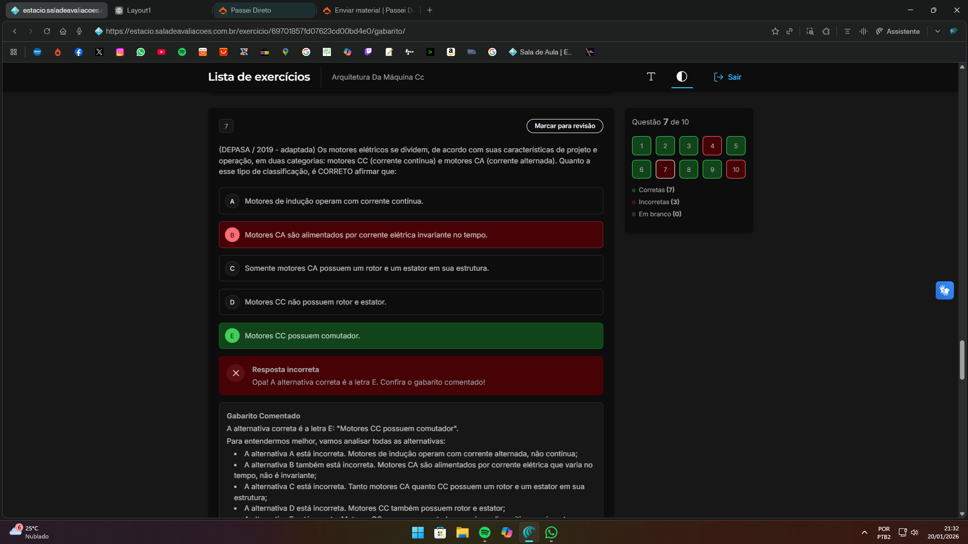 estacio.saladeavaliacoes Layout1 Passei Direto Enviar material Passei + > https://estacio.saladeavaliacoes.com.br/exercicio/69701857fd07623cd00bd4e0/gabarito/ Assistente X > a Sala de Aula Lista de exercícios Arquitetura Da Máquina Cc T Sair Questão 7 de 10 7 Marcar para revisão 1 2 3 4 5 (DEPASA / 2019 adaptada) Os motores elétricos se dividem, de acordo com suas características de projeto e operação, em duas categorias: motores CC (corrente contínua) e motores CA (corrente alternada). Quanto a esse tipo de classificação, é CORRETO afirmar que: 6 7 8 9 10 Corretas (7) A Motores de indução operam com corrente contínua. Incorretas (3) Em branco Motores CA são alimentados por corrente elétrica invariante no tempo. C Somente motores CA possuem um rotor e um estator em sua estrutura. D Motores CC não possuem rotor e estator. E Motores CC possuem comutador. Resposta incorreta Opa! A alternativa correta é a letra Confira gabarito comentado! Gabarito Comentado A alternativa correta é a letra E: "Motores CC possuem comutador". Para entendermos melhor, vamos analisar todas as alternativas: A alternativa A está incorreta. Motores de indução operam com corrente alternada, não contínua; A alternativa B também está incorreta. Motores CA são alimentados por corrente elétrica que varia no tempo, não invariante; A alternativa C está incorreta. Tanto motores CA quanto CC possuem um rotor e um estator em sua estrutura; A alternativa D está incorreta. Motores CC também possuem rotor e estator; 25°C POR 21:32 + Nublado PTB2 20/01/2026