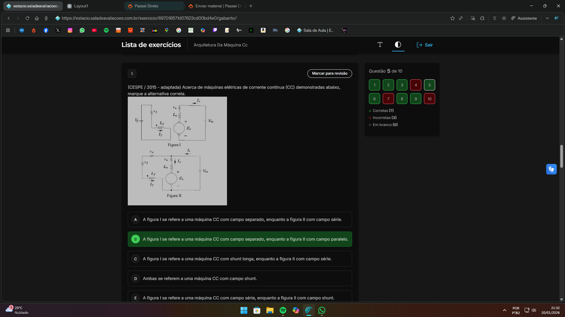 Layout1 Passei Direto Enviar material Passei + X > https://estacio.saladeavaliacoes.com.br/exercicio/69701857fd07623cd00bd4e0/gabarito/ Assistente X > a Sala de Aula Lista de exercícios Arquitetura Da Máquina Cc T Sair Questão 5 de 10 5 Marcar para revisão 1 2 3 4 5 (CESPE / 2015 adaptada) Acerca de máquinas elétricas de corrente contínua (CC) demonstradas abaixo, marque a alternativa correta. 6 7 8 9 10 Ta Corretas (7) Incorretas (3) + Em branco E. If Figura I Ta La + Lf If Figura II A A figura I se refere a uma máquina CC com campo separado, enquanto a figura II com campo série. A figura se refere a uma máquina CC com campo separado, enquanto a figura II com campo paralelo. C A figura se refere a uma máquina CC com shunt longa, enquanto a figura II com campo série. D Ambas se referem a uma máquina CC com campo shunt. E A figura I se refere a uma máquina CC com campo série, enquanto a figura com campo shunt. 25°C POR 21:32 Nublado PTB2 20/01/2026