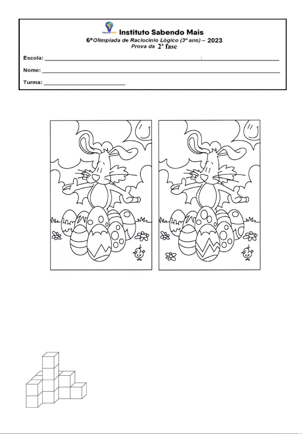1. JOGO DOS 7 ERROS 2. Qual o próximo elemento da sequencia lógica? A9B8C7, D6E5F4, G3H2I1, J0K9L8, M7N6O5 ....... a) P4Q3R2 b) R1D0A9 c) N8M7U6 d)P2Q1R2 3. Quantos cubos tem nessa imagem? R_____________ 4. Qual o próximo elemento da sequência lógica? TORA, CAJARÉ, FAGANHOTO, ............ a) GAROTEBA b )NORICERONTE c)MARFAGAFO d)RINOCETERIUS 5. Calcule: R___________ 6. Qual o próximo elemento da sequência lógica? 0, 1,2,3,6,7,14,15,16,32,33,...... a) 27 b) 50 c) 66 d) 34 7. quantos triângulos existem nessa imagem? R_______ 8. Quantos triângulos existem nessa imagem? R ____________ 9. Qual o próximo elemento da sequencia lógica? , , , , .......... a) b) c) d) 10. Qual o próximo elemento da Sequência de Fibonacci é a sequência numérica proposta pelo matemático Leonardo Pisa, mais conhecido como Fibonacci: 1, 1, 2, 3, 5, 8, 13, 21, 34 a) 35 b) 55 c) 60 d) 15 e) 44 Se você quiser alguém em quem confiar, confie em si mesmo. Quem acredita sempre alcança. Renato Russo. BOA PROVA! image5.png image6.png image7.png image8.png image1.jpeg image2.jpeg image3.jpeg image4.png 1. JOGO DOS 7 ERROS 2. Qual o próximo elemento da sequencia lógica? A9B8C7, D6E5F4, G3H2I1, J0K9L8, M7N6O5 ....... a) P4Q3R2 b) R 1 D 0 A 9 c) N 8 M 7 U 6 d )P2Q1R2 3. Quantos cubos tem nessa imagem? R _____________ 1. JOGO DOS 7 ERROS 2. Qual o próximo elemento da sequencia lógica? A9B8C7, D6E5F4, G3H2I1, J0K9L8, M7N6O5 ....... a) P4Q3R2 b) R1D0A9 c) N8M7U6 d)P2Q1R2 3. Quantos cubos tem nessa imagem? R_____________
