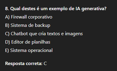 8. Qual destes é um exemplo de IA generativa? A) Firewall corporativo B) Sistema de backup C) Chatbot que cria textos e imagens D) Editor de planilhas E) Sistema operacional Resposta correta: C