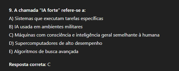 9. A chamada "IA forte" refere-se a: A) Sistemas que executam tarefas específicas B) IA usada em ambientes militares C) Máquinas com consciência e inteligência geral semelhante à humana D) Supercomputadores de alto desempenho E) Algoritmos de busca avançada Resposta correta: C