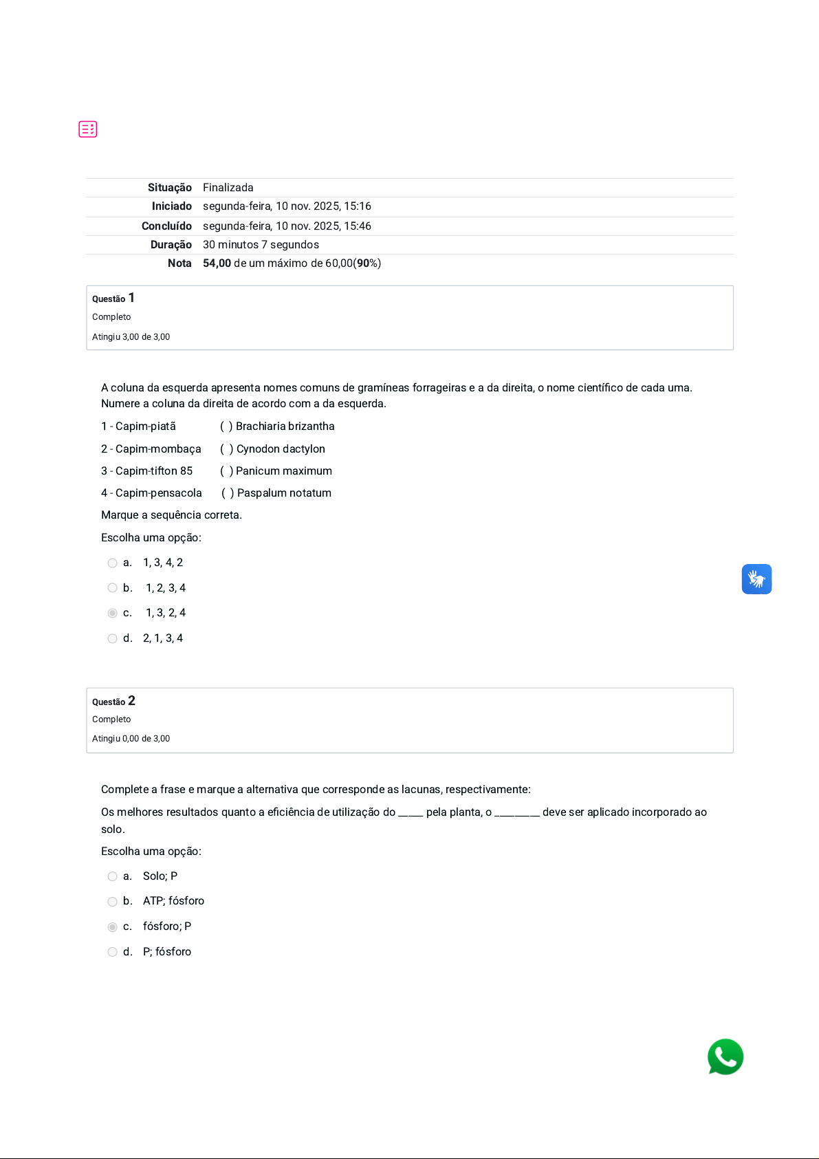 Situação Finalizada Iniciado segunda-feira, 10 nov. 2025, 15:16 Concluído segunda-feira, 10 nov. 2025, 15:46 Duração 30 minutos 7 segundos Nota 54,00 de um máximo de 60,00(90%) Questão 1 Completo Atingiu 3,00 de 3,00 Questão 2 Completo Atingiu 0,00 de 3,00 A coluna da esquerda apresenta nomes comuns de gramíneas forrageiras e a da direita, o nome científico de cada uma. Numere a coluna da direita de acordo com a da esquerda. 1 - Capim-piatã ( ) Brachiaria brizantha 2 - Capim-mombaça ( ) Cynodon dactylon 3 - Capim-tifton 85 ( ) Panicum maximum 4 - Capim-pensacola ( ) Paspalum notatum Marque a sequência correta. Escolha uma opção: a. 1, 3, 4, 2 b. 1, 2, 3, 4 c. 1, 3, 2, 4 d. 2, 1, 3, 4 Complete a frase e marque a alternativa que corresponde as lacunas, respectivamente: Os melhores resultados quanto a eficiência de utilização do _____ pela planta, o _________ deve ser aplicado incorporado ao solo. Escolha uma opção: a. Solo; P b. ATP; fósforo c. fósforo; P d. P; fósforo Questão 3 Completo Atingiu 3,00 de 3,00 Questão 4 Completo Atingiu 3,00 de 3,00 Questão 5 Completo Atingiu 0,00 de 3,00 Marque a opção que afirma as alternativas que são verdadeiras ou falsas: ( ) Sob lotação contínua, a frequência de pastejo de uma folha, perfilho ou de uma determinada área do piquete é diretamente proporcional a taxa de lotação utilizada. ( ) Sob lotação contínua, pastos mantidos sob pastejos intensos possuem menor frequência de desfolhação do que aqueles mantidos sob pastejos lenientes. ( ) Desfolhações lenientes forçam os animais a consumirem maior quantidade de folhas mais velhas e colmos. Já pastejos intensos permitem aos animais escolher mais o que consumir. Escolha uma opção: a. F; F; F b. V; V; V c. V; F; F d. V; V; F O que causa a ferrugem da braquiária? Escolha uma opção: a. Azoxystrobin b. Colletotrichum gloeosporioides c. fabáceas d. Puccinia levis var. panici-sanguinalis Sobre os herbicidas, analise as afirmativas e marque com V as verdadeiras e com F, as falsas. ( ) No aspecto ambiental, esse uso pode trazer sérios riscos. ( ) São compostos inorgânicos utilizados na agricultura para controlar o desenvolvimento de ervas daninhas. ( ) Podem causar contaminação das águas e dos seres vivos, já que se trata de substâncias amplamente tóxicas. ( ) Uma desvantagem do seu uso é a resistência desenvolvida pela erva daninha com o passar do tempo, o que provoca posteriormente a necessidade do uso de dosagens cada vez maiores. A alternativa que contém a sequência correta, de cima para baixo, é a: Escolha uma opção: a. V V F F b. F F V V c. V F F V d. V V V V Questão 6 Completo Atingiu 3,00 de 3,00 Questão 7 Completo Atingiu 3,00 de 3,00 Questão 8 Completo Atingiu 3,00 de 3,00 Quais ações para intensificar a produção da pecuária sem a necessidade de explorar novas áreas? Escolha uma opção: a. Manejo por meio dos produtores; Potencial de desempenho animal e aplicação de níveis mais elevados de tecnologias b. Melhoramento vegetal e alterações de frequências genéticas c. Inclusão da pastagem e planejamento de atividades d. Melhoramento vegetal e melhoramento de forragens Quais são as três técnicas realizadas nas áreas de pastagem? Escolha uma opção: a. recuperação do solo, controle químico e renovação b. recuperação, reforma e renovação c. contaminação do solo, controle químico e mecânico d. recuperação controle mecânico e renovação Quais são os nutrientes extraídos em maiores quantidades pelas plantas? Escolha uma opção: a. Nitrogênio e Magnésio b. Nitrogênio e Potássio c. Cálcio e Magnésio d. Potássio e Cálcio Questão 9 Completo Atingiu 3,00 de 3,00 Questão 10 Completo Atingiu 3,00 de 3,00 Questão 11 Completo Atingiu 3,00 de 3,00 Com a evolução dos métodos de manejo de espécies daninhas, o controle químico cresceu em participação percentual na maioria das áreas agrícolas do mundo. Entretanto, tem crescido a preocupação com a preservação do meio ambiente e a busca por alimentos obtidos por meio de práticas mais ecológicas de manejo dos cultivos. A supressão ou estabilização de populações de plantas daninhas por meio de controle biológico baseia-se na utilização de determinados organismos que dependem dessas plantas para a sua sobrevivência. Sobre o controle biológico em plantas daninhas é correto afirmar que: Escolha uma opção: a. o controle biológico possui algumas limitações e não tem sido possível implementá-lo com sucesso em todas as situações em que o controle de plantas daninhas é necessário. b. o controle biológico tem sido mais utilizado quando ocorre uma pequena densidade de uma espécie de planta daninha em uma determinada área ou região. c. o objetivo do controle biológico é a erradicação de populações inteiras de plantas que ocorrem em determinadas áreas. d. o controle biológico não é muito seletivo, os organismos de biocontrole não são específicos e atuam como um todo num complexo florístico. Para o clima tropical e subtropical qual gênero de forrageiras é propício para o cultivo? Escolha uma opção: a. Urochloa, somente b. Arachis e Stylosanthes c. Megathyrsus maximus, somente d. Cynodon, Urochloa e Megathyrsus maximus O que se entende por controle químico? Escolha uma opção: a. eficiência no controle mecânico das plantas daninhas b. cuidados devem ser tomados para uma análise apropriada da escala de controle químico c. controle mecânico das plantas daninhas d. consiste no uso de herbicidas e deve sempre ser utilizado de forma a complementar aos demais métodos de controle Questão 12 Completo Atingiu 3,00 de 3,00 Questão 13 Completo Atingiu 3,00 de 3,00 Como pode ser definida a dormência de sementes? Escolha uma opção: a. aumento dos custos para estabelecimento da pastagem b. atraso de cultivo c. mecanismo de adaptação relevante em regiões com restrições pluviométricas d. fenômeno consistente 