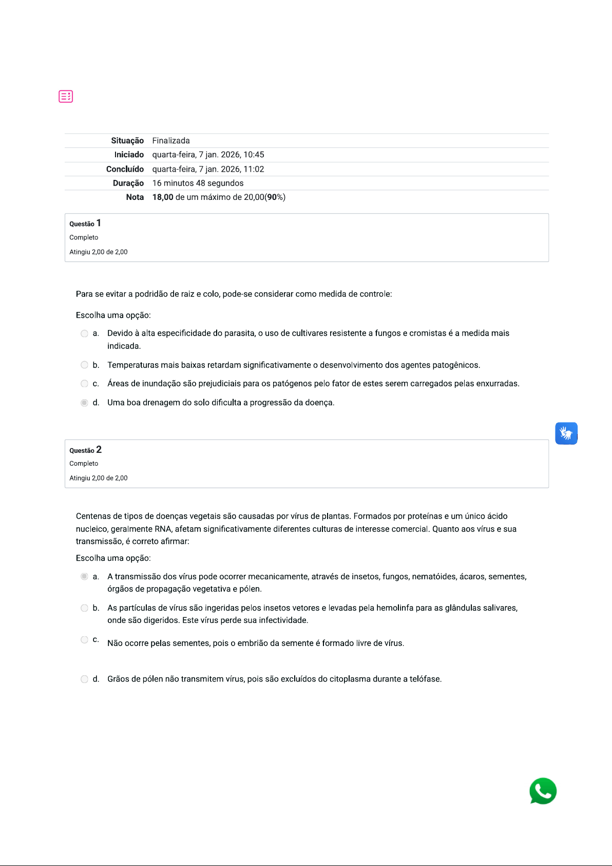 Situação Finalizada Iniciado quarta-feira, 7 jan. 2026, 10:45 Concluído quarta-feira, 7 jan. 2026, 11:02 Duração 16 minutos 48 segundos Nota 18,00 de um máximo de 20,00(90%) Questão 1 Completo Atingiu 2,00 de 2,00 Para se evitar a podridão de raiz e colo, pode-se considerar como medida de controle: Escolha uma opção: a. Devido à alta especificidade do parasita, o uso de cultivares resistente a fungos e cromistas é a medida mais indicada. b. Temperaturas mais baixas retardam significativamente o desenvolvimento dos agentes patogênicos. Áreas de inundação são prejudiciais para os patógenos pelo fator de estes serem carregados pelas enxurradas. d. Uma boa drenagem do solo dificulta a progressão da doença. Questão 2 Completo Atingiu 2,00 de 2,00 Centenas de tipos de doenças vegetais são causadas por vírus de plantas. Formados por proteínas e um único ácido nucleico, geralmente RNA, afetam significativamente diferentes culturas de interesse comercial. Quanto aos vírus e sua transmissão, é correto afirmar: Escolha uma opção: a. A transmissão dos vírus pode ocorrer mecanicamente, através de insetos, fungos, nematóides, ácaros, sementes, órgãos de propagação vegetativa e pólen. b. As partículas de vírus são ingeridas pelos insetos vetores e levadas pela hemolinfa para as glândulas salivares, onde são digeridos. Este vírus perde sua infectividade. Não ocorre pelas sementes, pois o embrião da semente é formado livre de vírus. d. Grãos de pólen não transmitem vírus, pois são excluídos do citoplasma durante a telófase.Questão 3 Completo Atingiu 2,00 de 2,00 Sobre nematoides presentes na cultura do algodoeiro, numere o conjunto de cima (sintomatologia) de acordo com o conjunto indicado pelos parênteses (espécies de nematoides). 1 Meloidogyne incognita 2 Rotylenchulus reniformis 3 Pratylenchus brachyurus () Escurecimento no sistema radicular, diminuição do porte da planta. () Presença de galhas, folhas "carijó", reboleiras, diminuição do porte das plantas. () Folhas "carijó", reboleiras, presença de massas de ovos aderidas nas raízes, diminuição do porte das plantas Assinale a sequência correta. Escolha uma opção: a. 3,1,2. b. 1,2,3. 1,3,2. d. 2,1,3. Questão 4 Completo Atingiu 2,00 de 2,00 Sobre a podridão de órgãos de reserva, não se pode afirmar que: Escolha uma opção: a. Por apresentar alta especificidade, o patógeno consegue infectar diferentes tipos de hospedeiros, sendo o desenvolvimento bastante demorado, o que dificulta seu combate. b. Dentre os principais patógenos causadores da podridão mole, podemos citar a bactéria Erwinia sp., que tem seu metabolismo significativamente influenciado pela umidade e temperatura. Pelos fatos de os patógenos apresentarem baixa especificidade, eles infectam rapidamente o hospedeiro, podendo espalhar-se. rapidamente no período de pré- ou pós-colheita d. Por serem causadas por fungos e bactérias, elas são diretamente afetadas por umidade e temperatura.Questão 5 Completo Atingiu 2,00 de 2,00 Murchas vasculares causadas por fungos podem ser controladas pelo uso de: Escolha uma opção: a. Solarização, pois fungos e bactérias não sobrevivem em temperaturas superiores a 28°C. b. Uso de espécies resistentes por causa da especificidade que os patógenos têm em relação ao hospedeiro. Controle de vetores porque moscas podem transportar clamidiósporos de fungos. d. Rotação de culturas porque o parasito não sobrevive no solo. Questão 6 Completo Atingiu 2,00 de 2,00 A doença mais comum, causada por fungos que atacam o colo das mudas, provenientes de sementes ainda em estágio inicial de germinação, relacionada às características de substrato, ao teor de umidade e à insolação, independente do período do ano, é: Escolha uma opção: a. Podridão das raízes. b. Damping-off. Clorose. d. Necrose foliar. Questão 7 Completo Atingiu 2,00 de 2,00 Analise as afirmativas a seguir: I. Para minimizar os problemas com podridões de raízes de soja, deve-se aumentar a compactação e reduzir a drenagem dos solos. II. As doenças de espiga de milho mais comuns são as podridões e a fusarium. Em geral, essas doenças podem ser combatidas a partir da redução da drenagem do solo. Evitar a rotação de culturas também é uma prática recomendável. Marque a alternativa correta Escolha uma opção: a. As duas afirmativas estão falsas. b. As duas afirmativas estão corretas. A afirmativa I é verdadeira, a é falsa. d. A afirmativa é verdadeira, a é falsa.Questão 8 Completo Atingiu 2,00 de 2,00 processo doença envolve alterações na fisiologia do hospedeiro. Na classificação para as doenças de plantas com base nos processos fisiológicos vitais da planta em que os patógenos interferem, a relação processo fisiológico, doença / sintoma, patógeno e forma de controle da doença, é dada, respectivamente por Escolha uma opção: a. Fotossíntese/ manchas e crestamentos/ Rhizophus spp./ rotação de cultura. b. Transporte de água e nutrientes/ podridão mole ou seca em sementes e frutos/ Sclerotium rolfsii/ medidas de sanitização. Armazenamento de nutrientes/ podridão de raiz e do colo/ Penicillium spp./ tratamento do solo. d. Formação de tecidos jovens/ tombamento de plântulas/ Pythium spp./ tratamento de sementes. Questão 9 Completo Atingiu 2,00 de 2,00 Sobre nematóides parasitas, podemos afirmar que: Escolha uma opção: a. Como são monofágicas, apresentam extrema limitação em relação aos hospedeiros que podem infectar. b. Não podem causar necroses no sistema radicular das plantas. Não apresentam mobilidade interna em seu hospedeiro, sendo sempre endoparasitas sedentárias. d. A formação de galhas é mais restrita a um gênero apenas. Questão 10 Completo Atingiu 0,00 de 2,00 Sobre as fitoviroses, podemos classificar os tipos de sintomas em dois tipos. Relacione o tipo de sintoma com a sua explicação. Escolha uma opção: a. A necrose é um 