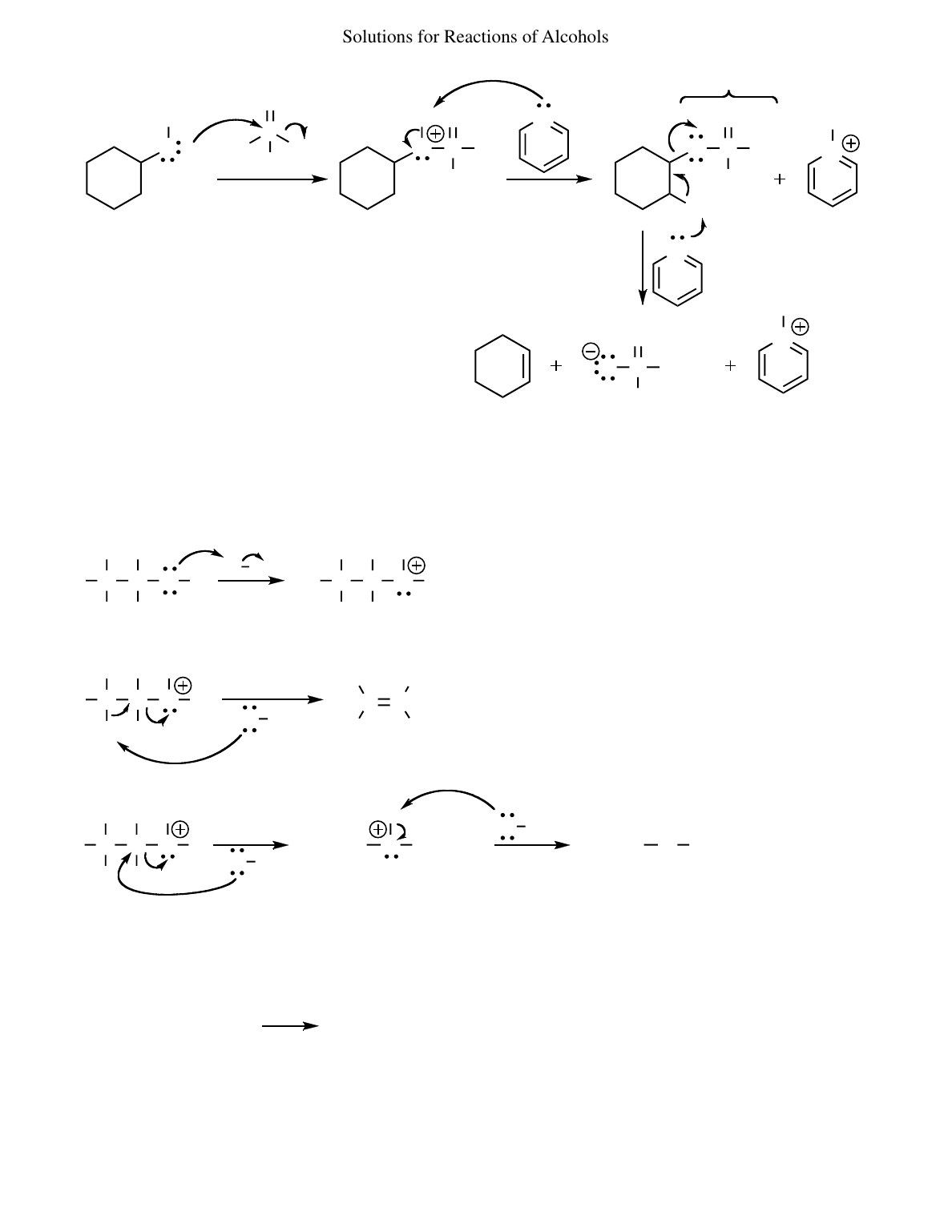 Solutions for Reactions of Alcohols N H N H O P O Cl Cl H N O P O Cl Cl N O H P O Cl Cl P O Cl ClClO H 23 good leaving group E2 This product can react with two more alcohols to become leaving groups in the E2 elimination. Cyclohexene was formed without a carbocation intermediate. 24 O CH2CH3CH3CH2 O HC H H C H H H H C H H C H H O H CH3CH2 CH2CH3 H C H H C H H O H O H H C H H C H H H O HC H H C H H H H + H2O Both mechanisms begin with protonation of the oxygen. The other mechanism involves another molecule of ethanol acting as a nucleophile, giving substitution. One mechanism involves another molecule of ethanol acting as a base, giving elimination. ∆ H2O + CH3CH2OCH3 + CH3OCH3 + CH3CH2OCH2CH3CH3CH2OH + HOCH3 25 An equimolar mixture of methanol and ethanol would produce all three possible ethers. The difficulty in separating these compounds would preclude this method from being a practical route to any one of them. This method is practical only for symmetric ethers, that is, where both alkyl groups are identical. HO Et HO Et HO Et H A H2SO4 254