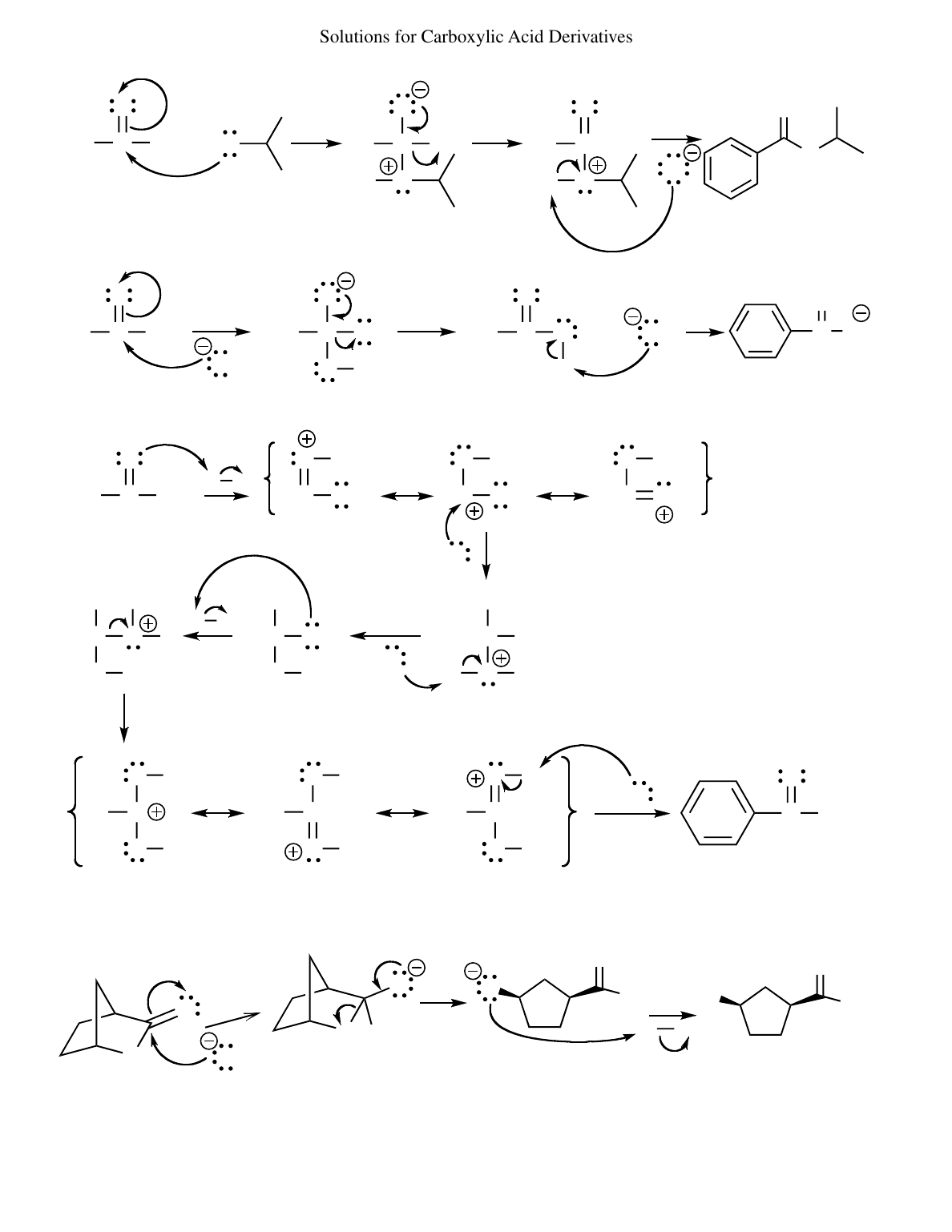 Solutions for Carboxylic Acid Derivatives OMe OH Cl C O ClPh C OMePh O HO C O Ph OMe O H C Cl O H O Ph C O Ph O H C OH O Ph O O C O O HOCH3 (b) (a) 49 + + + HCl + If propan-2-ol is the solvent, it will also serve as the base instead of chloride ion. H OPhC OH O H Et O H C O H Ph C O Ph OEt O H PhC OH OEt HO C O H Ph PhC OEt O H H2O H2O O H PhC OEt O H C O H Ph PhC OEt OH O HH H2O PhC OEt O H C OH O (c) Note: species with positive charge on carbon adjacent to benzene also have resonance forms (not shown) with the positive charge distributed over the ring. − EtOH OEtO O O O OEt O OEt O H OEt HO OEt O (d) H A H A 535