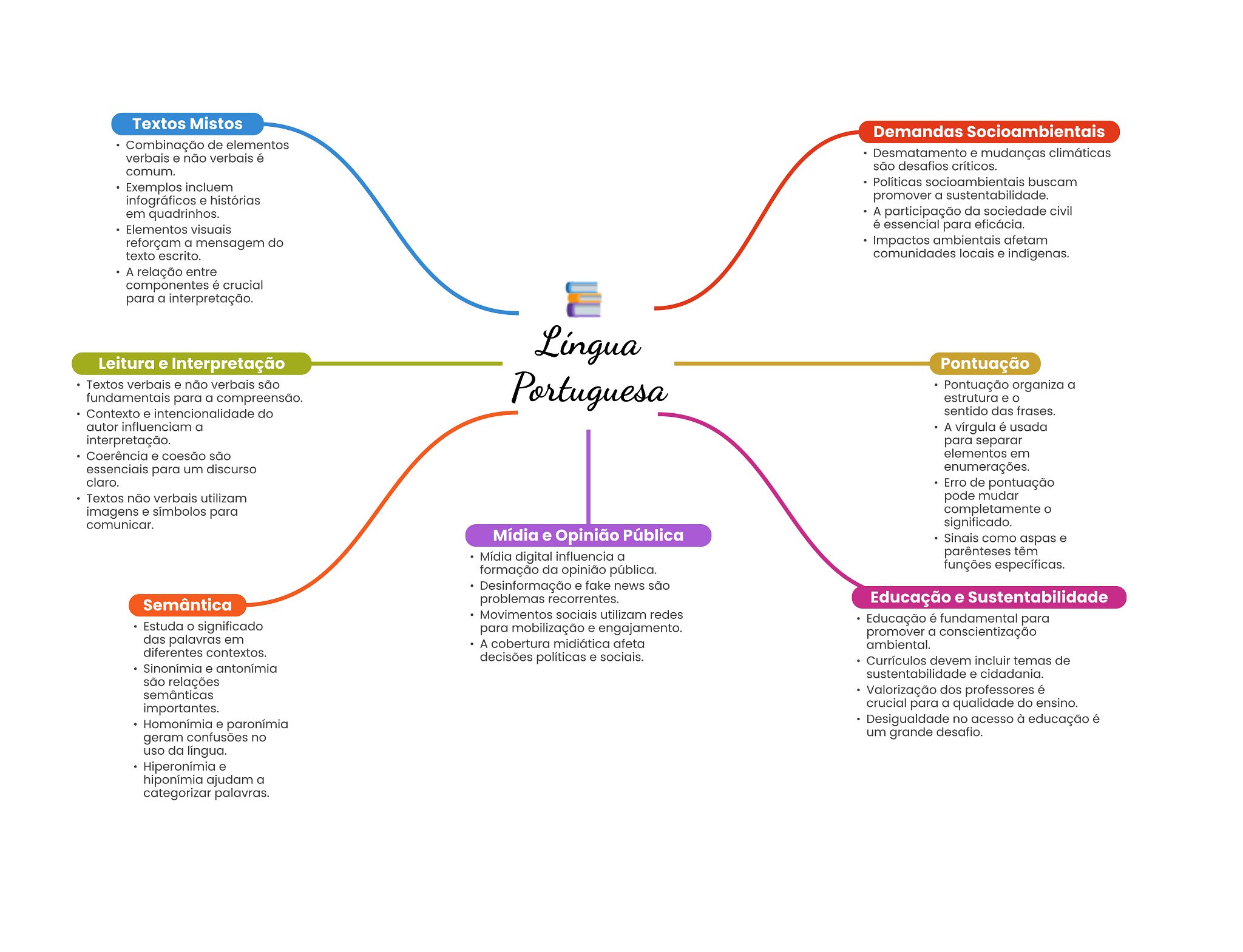 Textos Mistos Demandas Socioambientais Combinação de elementos verbais e não verbais é Desmatamento e mudanças climáticas são desafios críticos. comum. Exemplos incluem Políticas socioambientais buscam infográficos e histórias promover a sustentabilidade. em quadrinhos. A participação da sociedade civil Elementos visuais é essencial para eficácia. reforçam a mensagem do Impactos ambientais afetam texto escrito. comunidades locais e indígenas. A relação entre componentes é crucial para a interpretação. Língua Leitura e Interpretação Pontuação Textos verbais e não verbais são Portuguesa Pontuação organiza a fundamentais para a compreensão. estrutura e Contexto e intencionalidade do sentido das frases. autor influenciam a A vírgula é usada interpretação. para separar Coerência e coesão são elementos em essenciais para um discurso enumerações. claro. Erro de pontuação Textos não verbais utilizam pode mudar imagens e símbolos para completamente O comunicar. significado. Mídia e Opinião Pública Sinais como aspas e Mídia digital influencia a parênteses têm formação da opinião pública. funções específicas. Desinformação e fake news são Semântica problemas recorrentes. Educação e Sustentabilidade Movimentos sociais utilizam redes Educação é fundamental para Estuda significado para mobilização e engajamento. promover a conscientização das palavras em A cobertura midiática afeta ambiental. diferentes contextos. decisões políticas e sociais. Currículos devem incluir temas de Sinonímia e antonímia sustentabilidade e cidadania. são relações semânticas Valorização dos professores é importantes. crucial para a qualidade do ensino. Homonímia e paronímia Desigualdade no acesso à educação é geram confusões no um grande desafio. uso da língua. Hiperonímia e hiponímia ajudam a categorizar palavras.